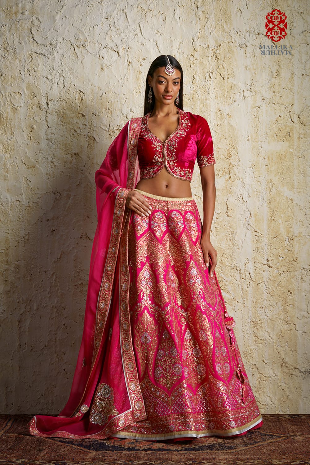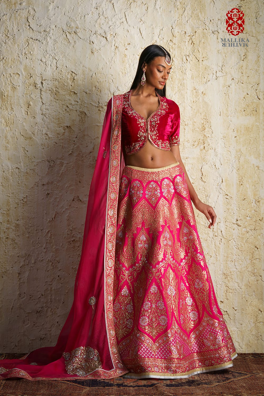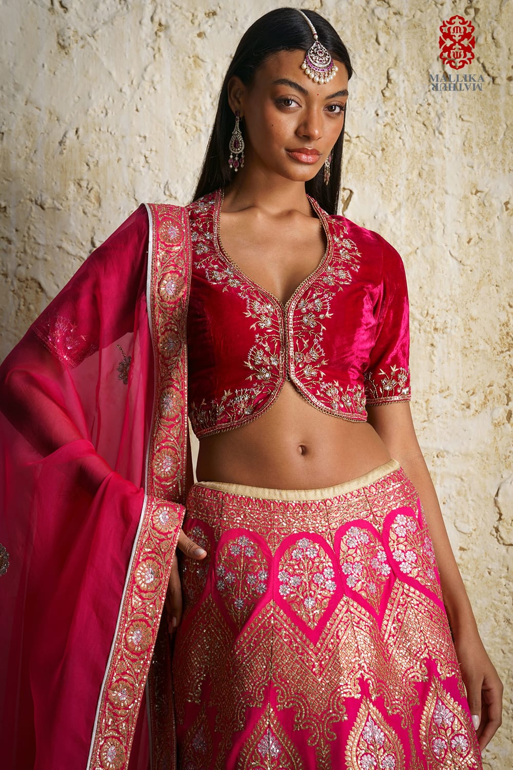 'Amira’ hand embroidered velvet koti in a cerise pink colour. The silver and gold floral motifs are in dabka and zardosi in an antique European design. This koti can be paired with a lehenga, sharara or a sari. Please reach out to us for more colour options.