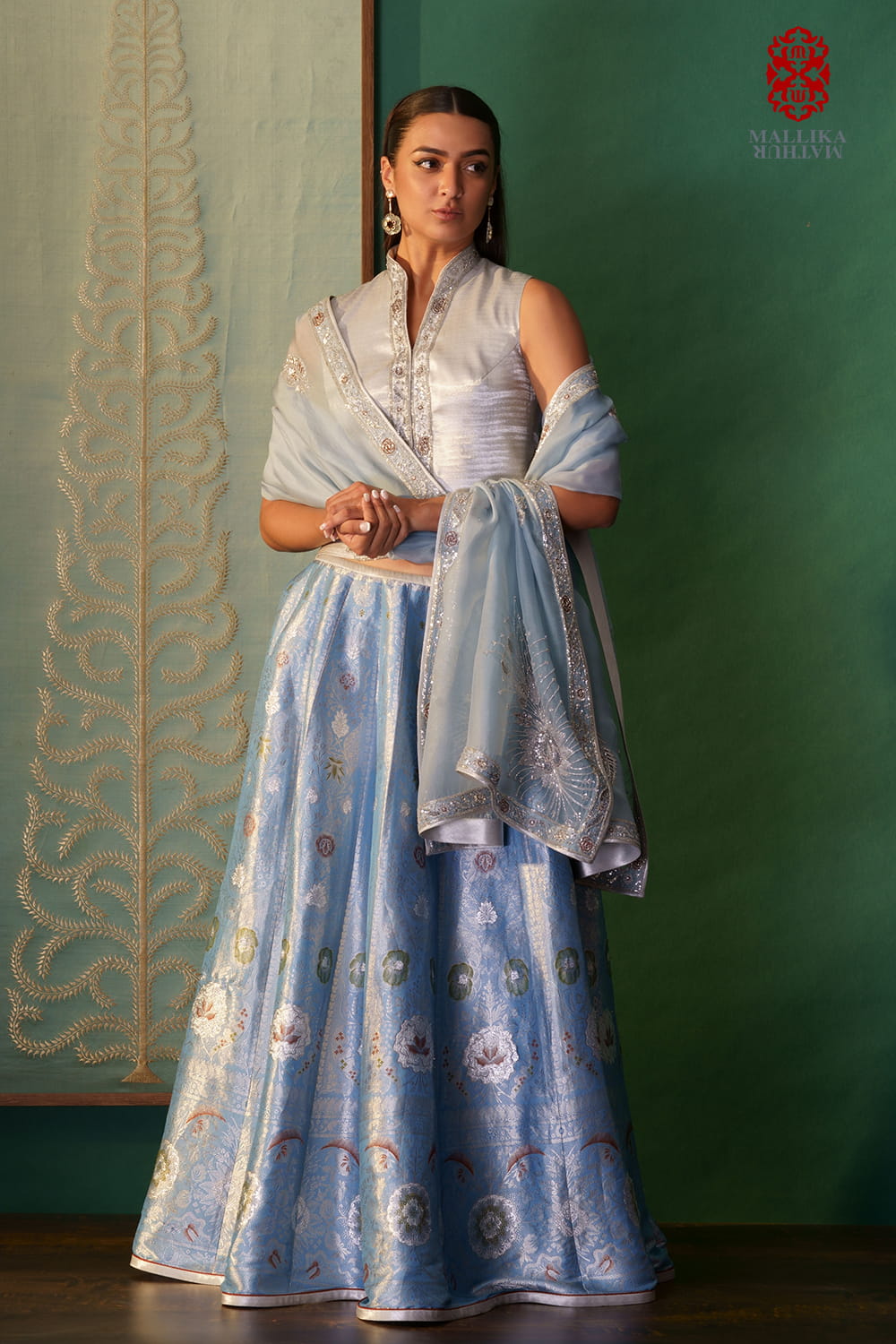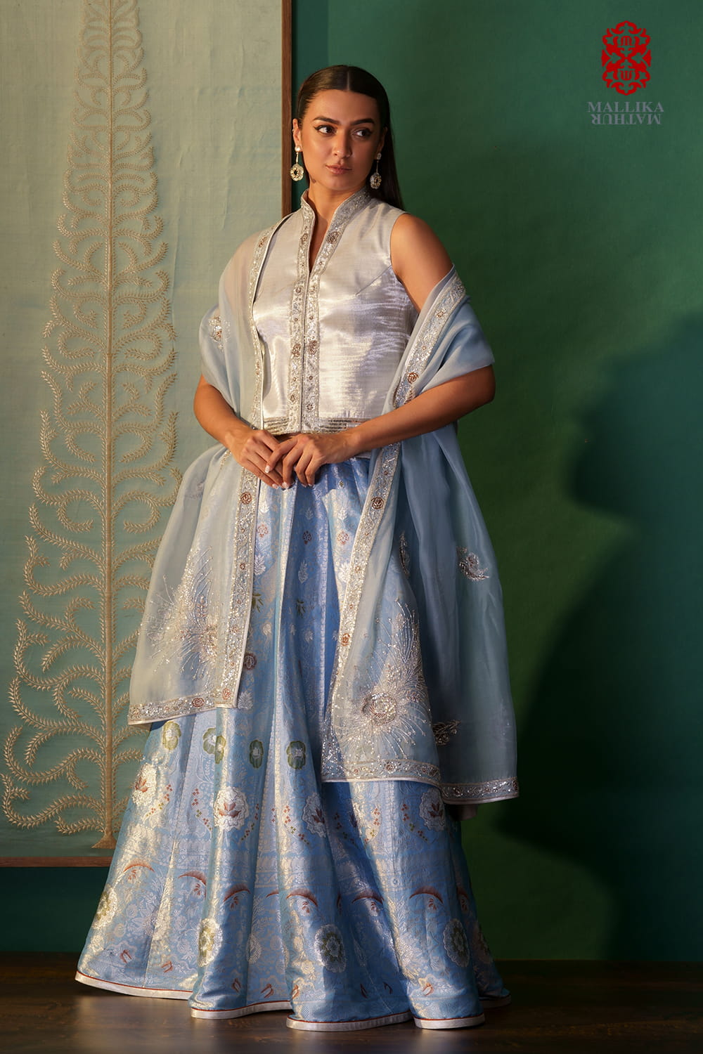 Dupatta cora is ice blue hand embroided in dancing leaf motifs in dabka and ari with intricate in meenakari detail.