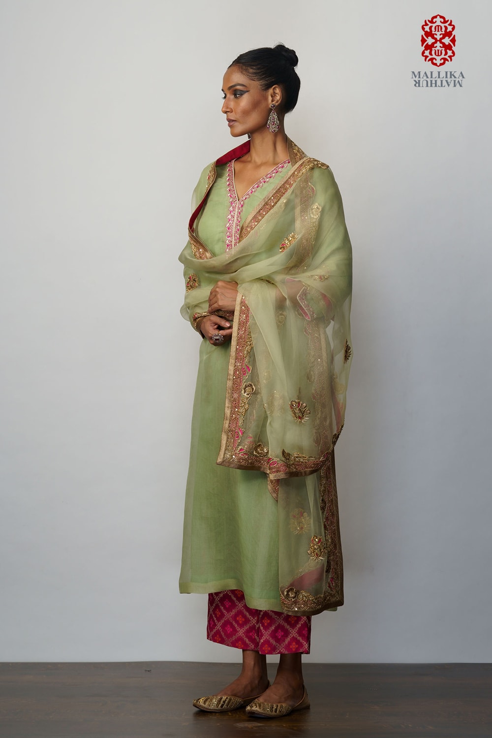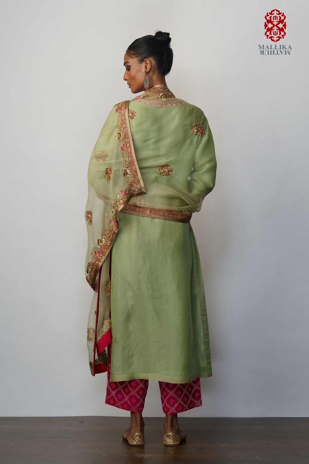 The mint green kora dupatta + kurta + Pant is hand embroidered in an antique design of silver leaf bel in diagonal lines.