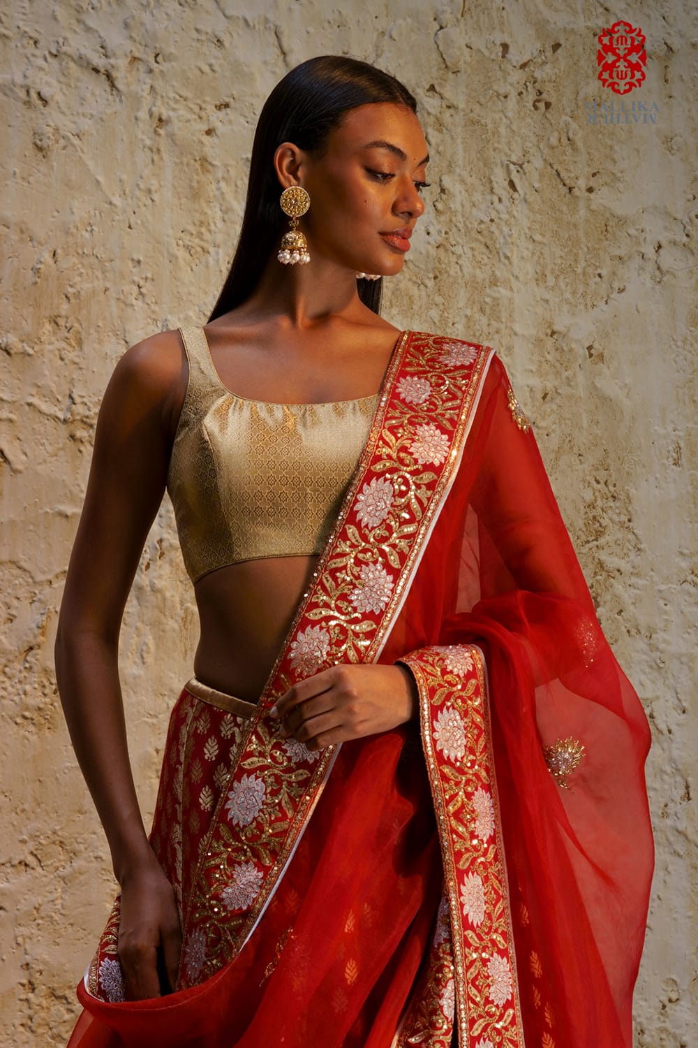 'Sitara’ sleeveless blouse in gold zari with thin straps and a deep shaped neckline in the front and back. This blouse design can be ordered in a range of zari fabrics and brocades. The blouse can be paired with a lehenga, sharara or a sari.