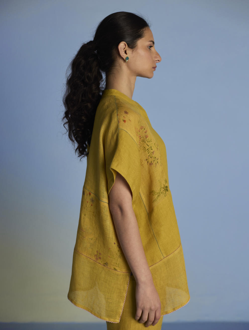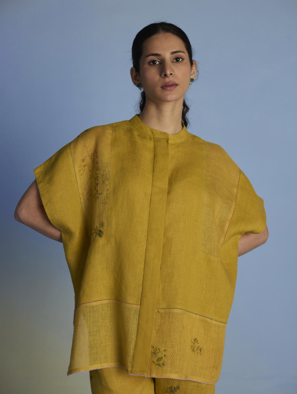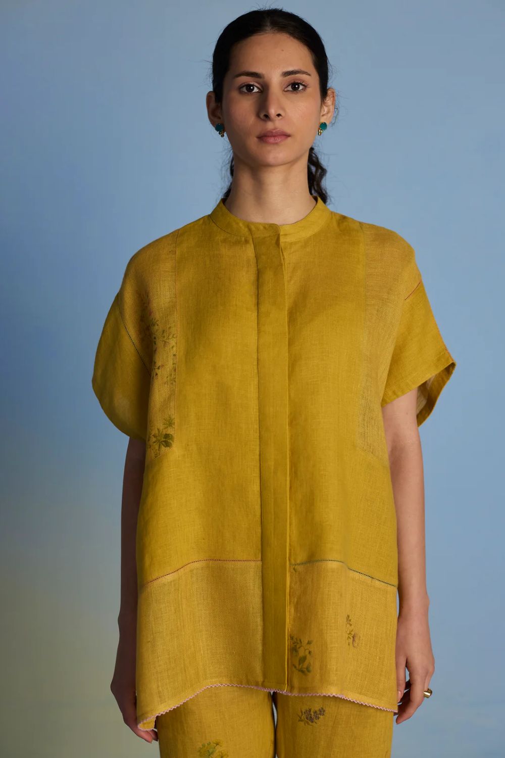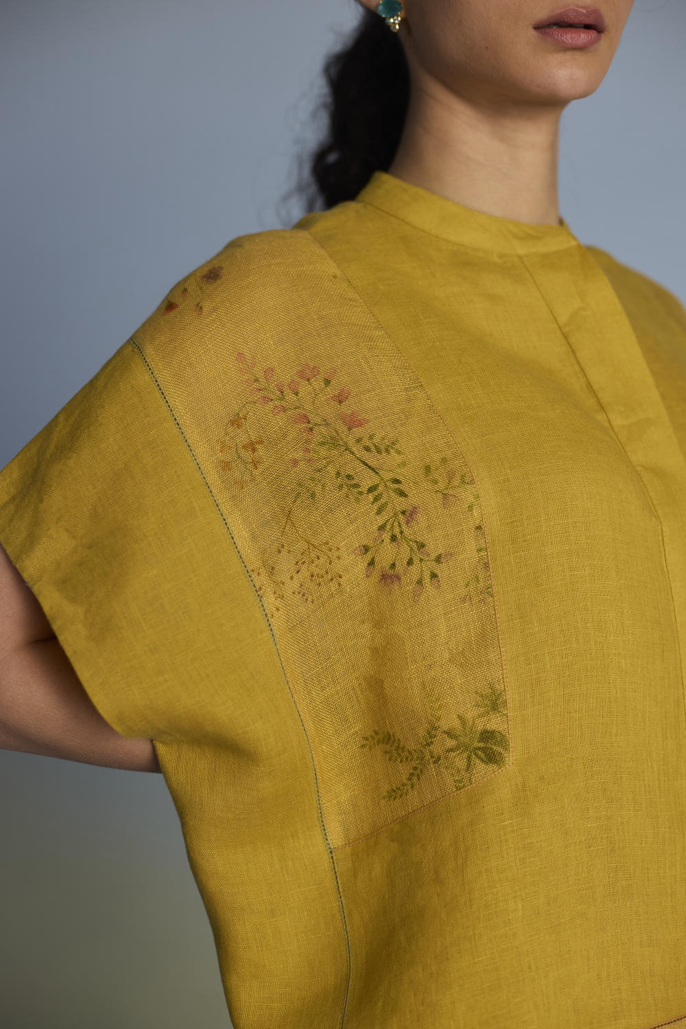 A flowing patchwork shirt crafted via patchwork of our signature soft yarn-dyed linen and sheer linen, featuring an intricate hand-painted floral print. Enhanced with multi-coloured fagotting stitch on adjoining patches, finished with colourful picoting at the hem.