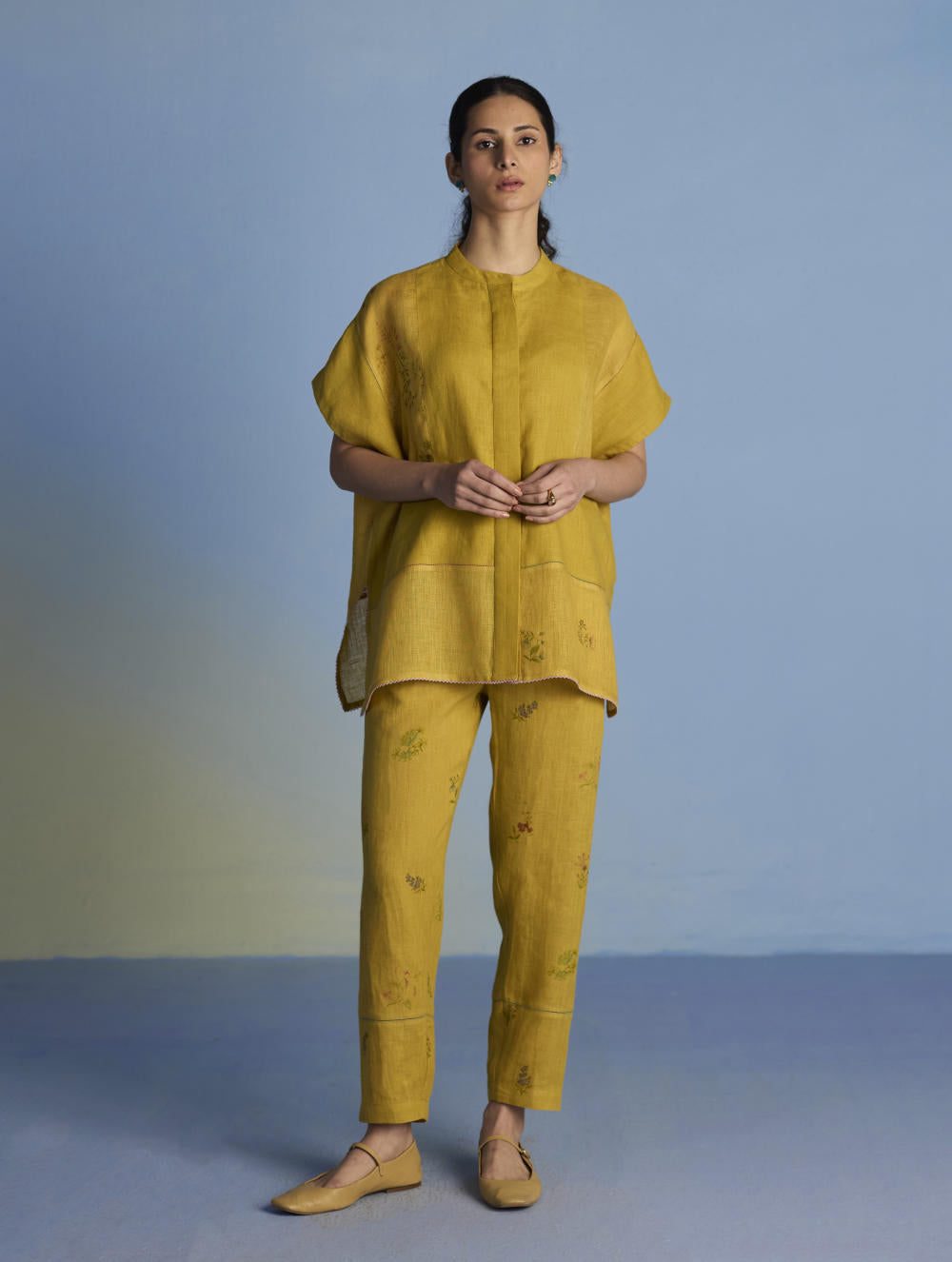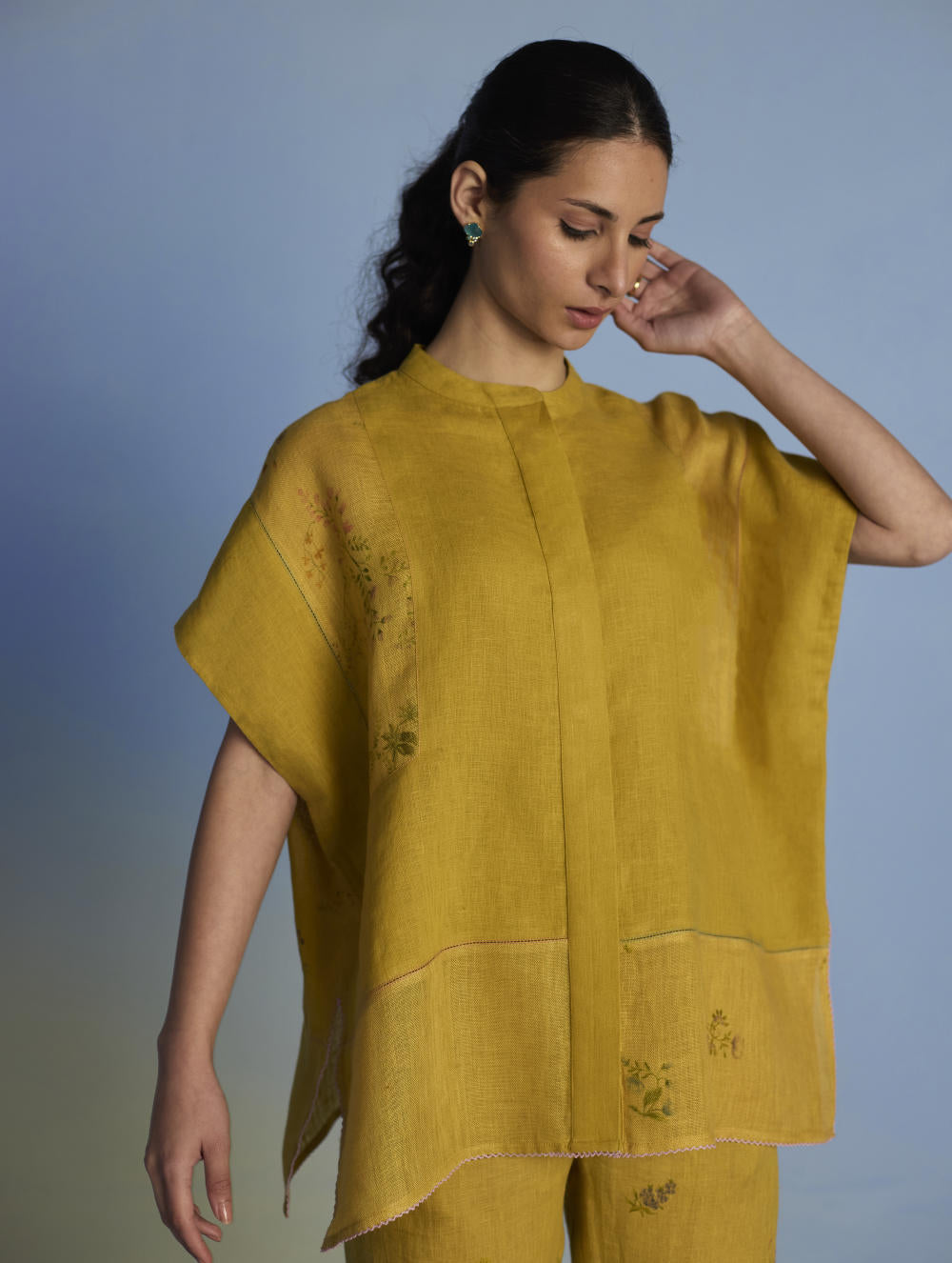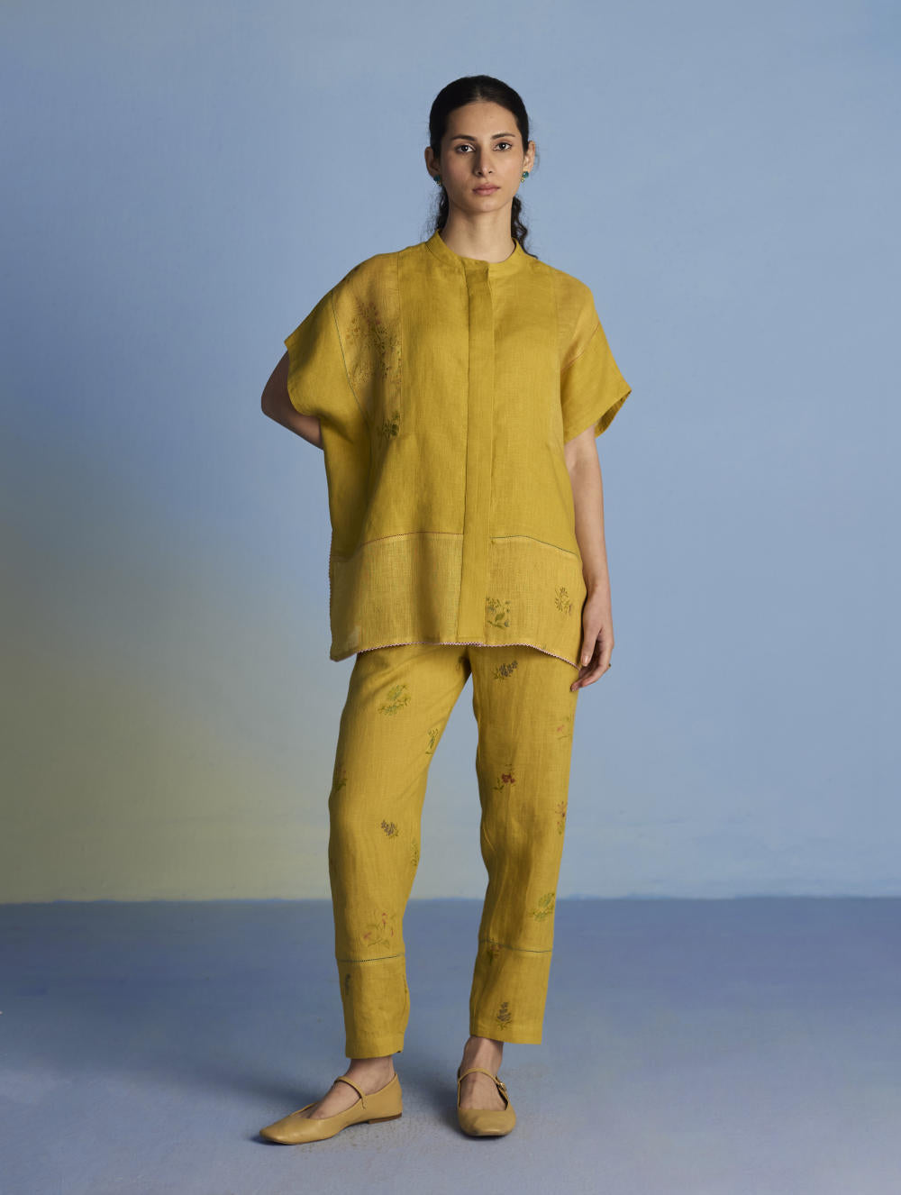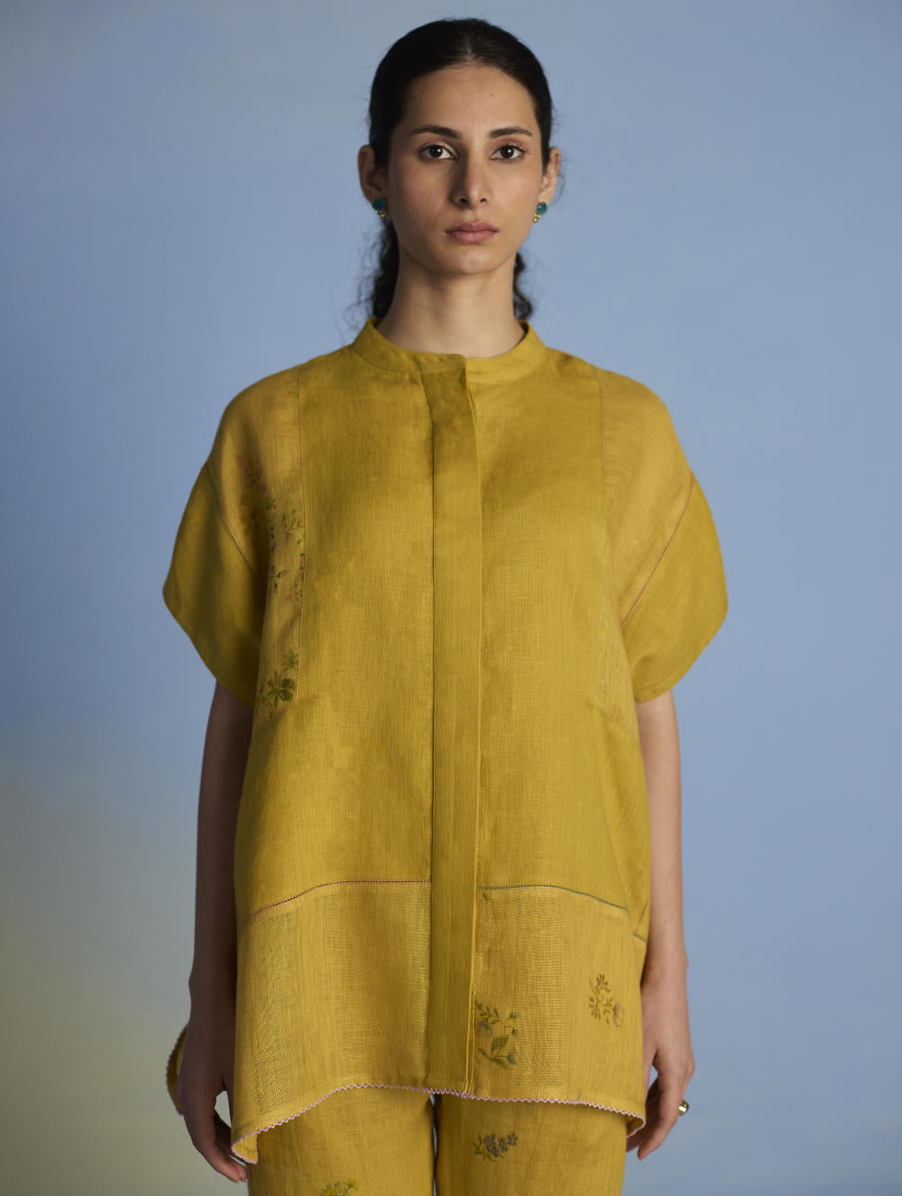 A flowing patchwork shirt crafted via patchwork of our signature soft yarn-dyed linen and sheer linen, featuring an intricate hand-painted floral print. Enhanced with multi-coloured fagotting stitch on adjoining patches, finished with colourful picoting at the hem.