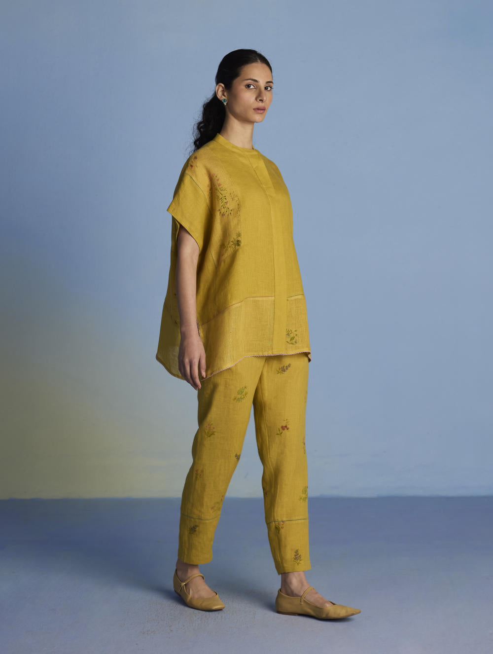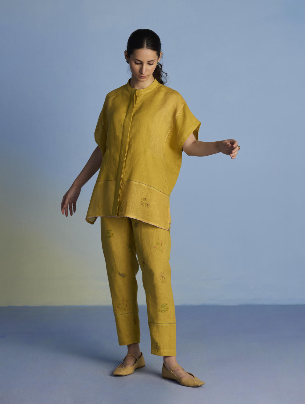 Their signature linens soften beautifully with time, eventually returning to the earth. They work with eri (ahimsa) silk, celebrated for its strength and gentle texture, and craft thoughtful blends of viscose, cotton, silk, and linen for pieces designed to last. Yarn-dyed techniques minimise chemical use and create the subtle, heathered tones that have become a quiet Manan signature.