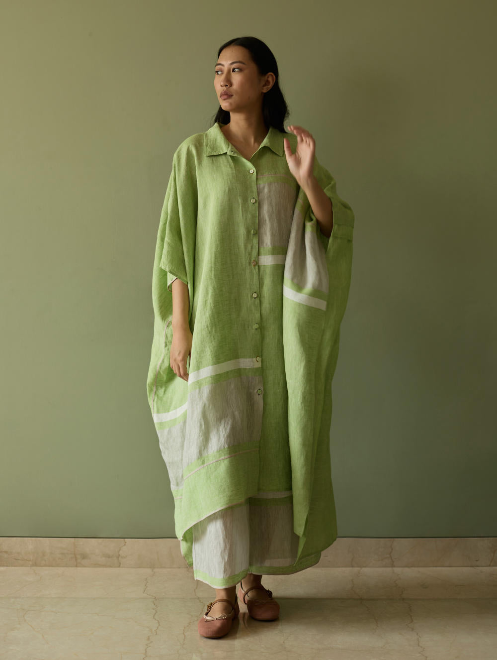 This effortlessly chic colour-blocked kaftan is crafted from our signature soft handwoven metallic border linen, highlighted by a subtle grey selvedge. The relaxed and flowing silhouette features a button-down placket and thoughtful placement of border detailing on the front and back. At the back yoke, soft double pleats add movement and dimension. Finished with mix of linen-covered and luminous mother-of-pearl buttons, this piece is is easy, versatile and statement - all at the same time.