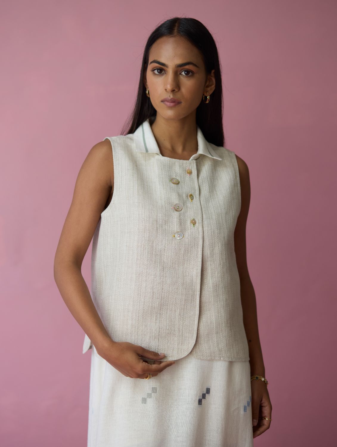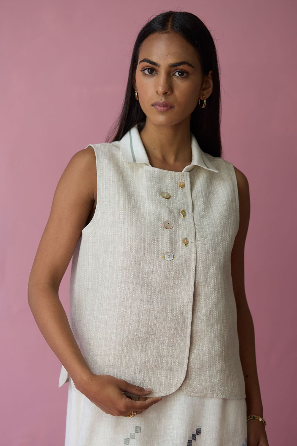 The Ira vest has abstract button placement finished with a thoughtful mix of small and oversized mother-of-pearl buttons highlighted with subtle coloured buttonholes An understated wardrobe favourite that balances craft, texture, and wearability. Layer this versatile vest with a dress, a kurta or a shirt for an stand-out look.