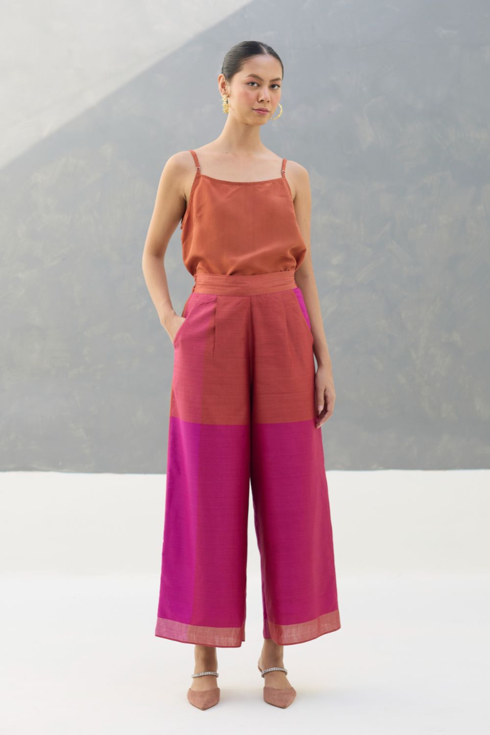 The versatile culotte is crafted in our soft handloom eri (ahimsa) silk, woven as an oversized colour-block check pattern in 4-5 shades. Designed for comfort and functionality, the culottes include a back elasticated waistband with an inside drawstring for an adjustable fit, as well as comfortable pockets. The piece is intricately finished with a subtle woven metallic border at the hem.