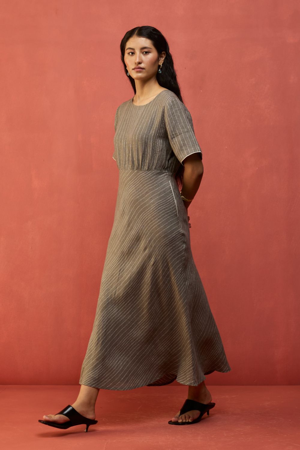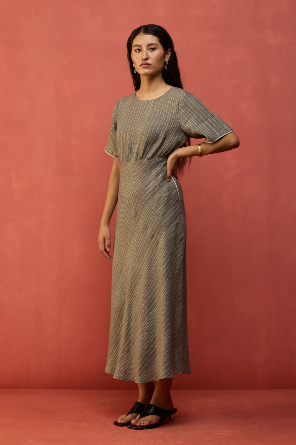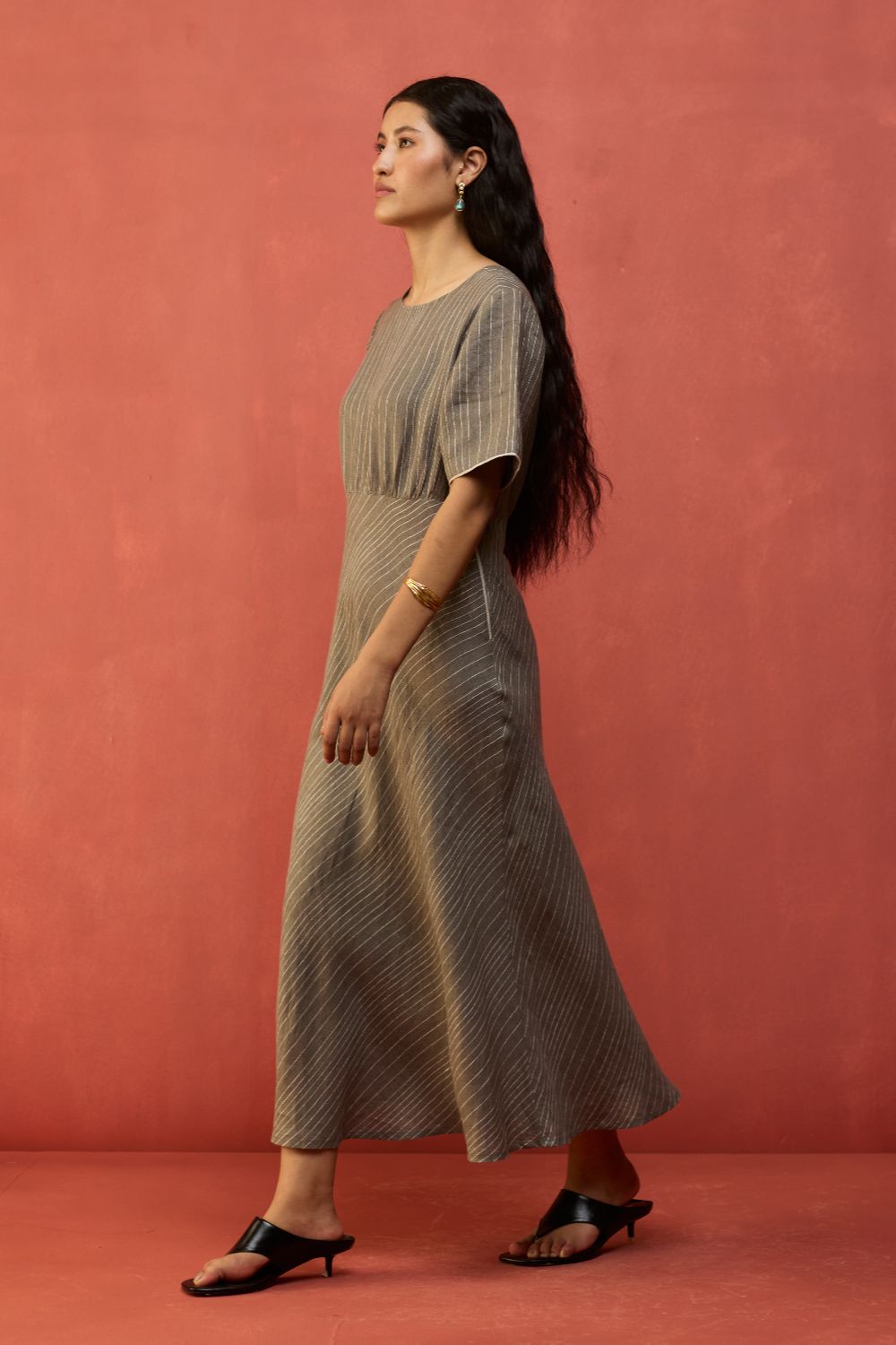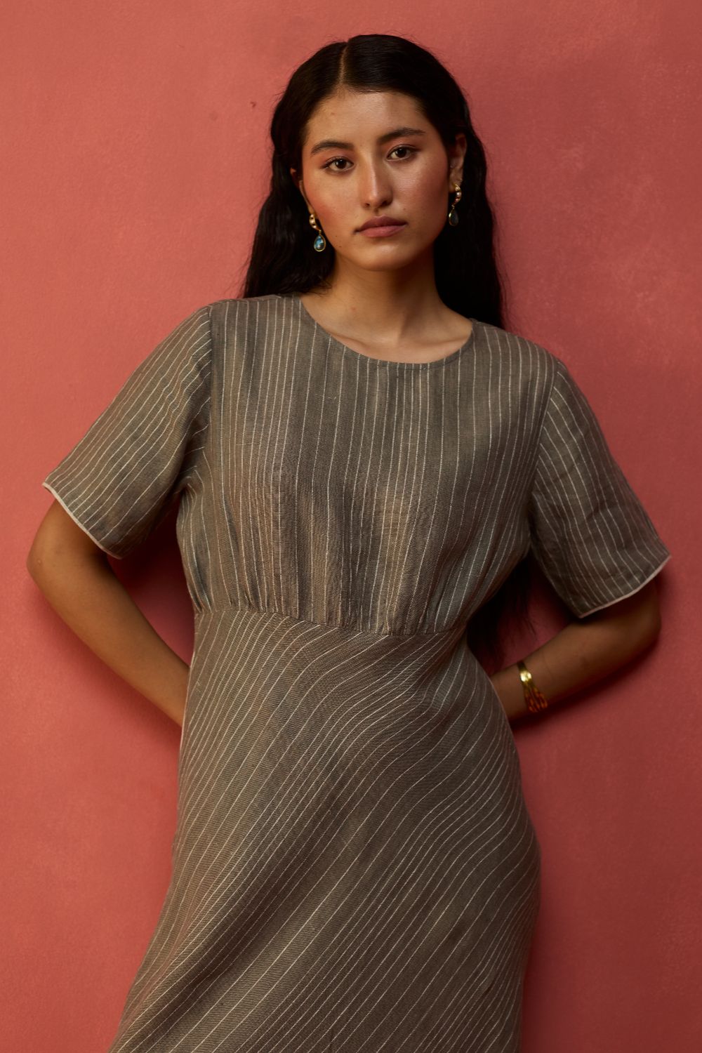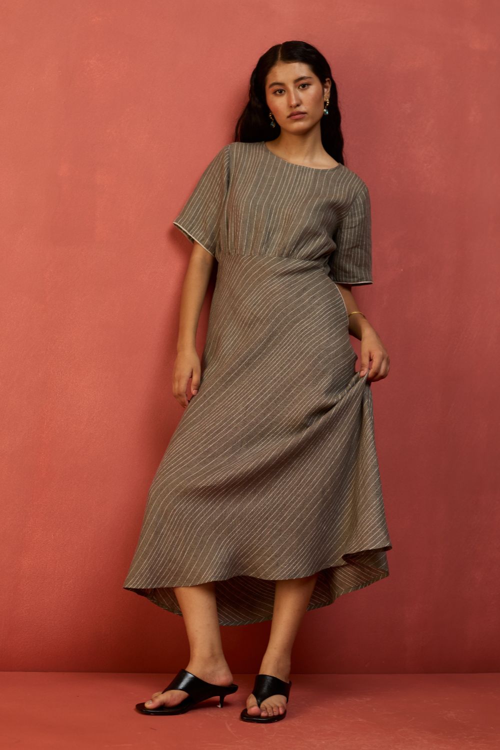 The Fumi is a fit-and-flare dress handcrafted from our signature soft pinstriped yarn-dyed linen. Cut on the bias with a shaped waist, it drapes beautifully to enhance the silhouette. Intricate contrast woven selvedge piping details are added along the sleeves and pockets. Thoughtfully designed with a side zipper, elbow-length sleeves and deep pockets for ease and wearability. Fumi is the perfect dress to transition from formal events to informal get-togethers.