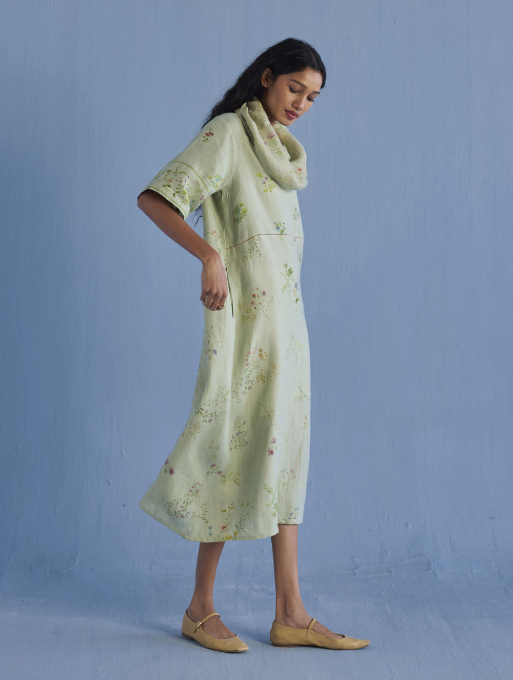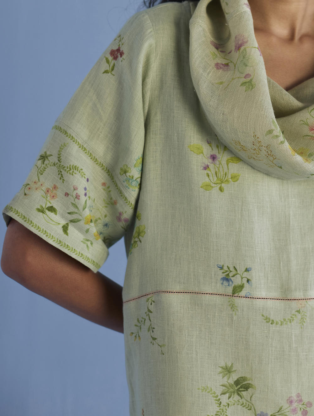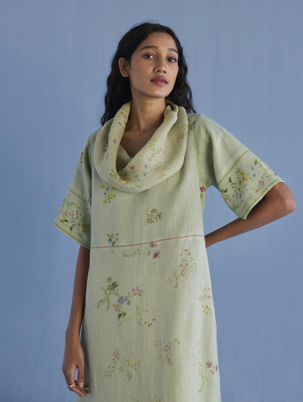 One of our timeless favourites - the cowl neck midi dress handcrafted in our soft yarn-dyed linen with cowl neck in printed soft sheer linen. The dress is designed in two hand-painted floral prints - a jaal floral print and a buta (motif) floral print. Accented with pop coloured fagotting stitch detailing in the front and back and finished with a printed border detail on the sleeves and pockets.