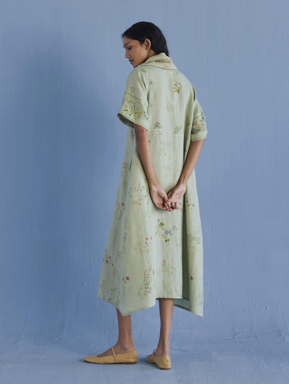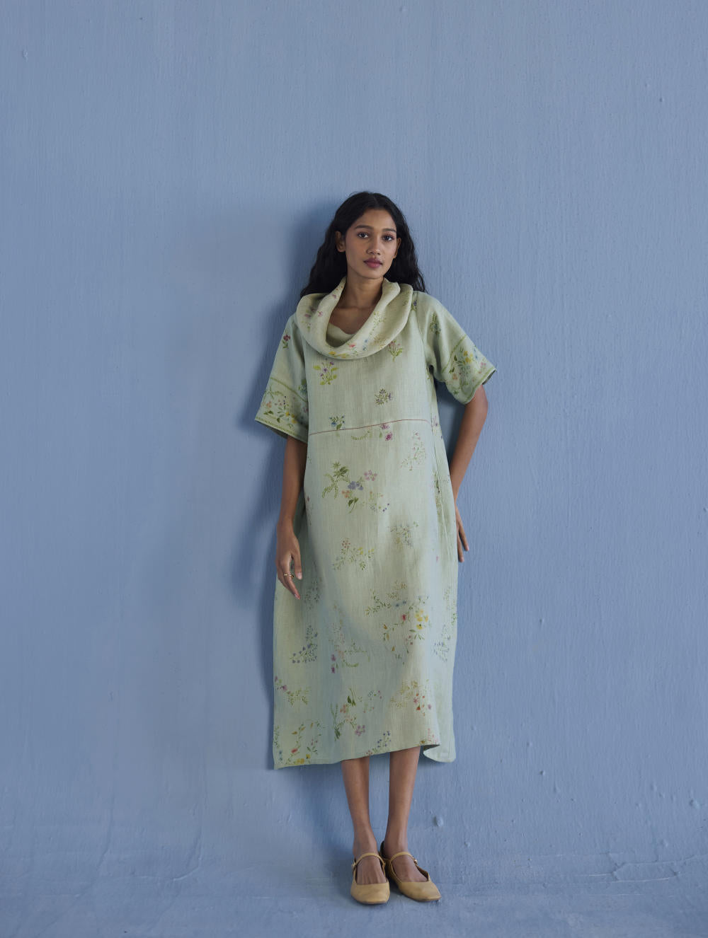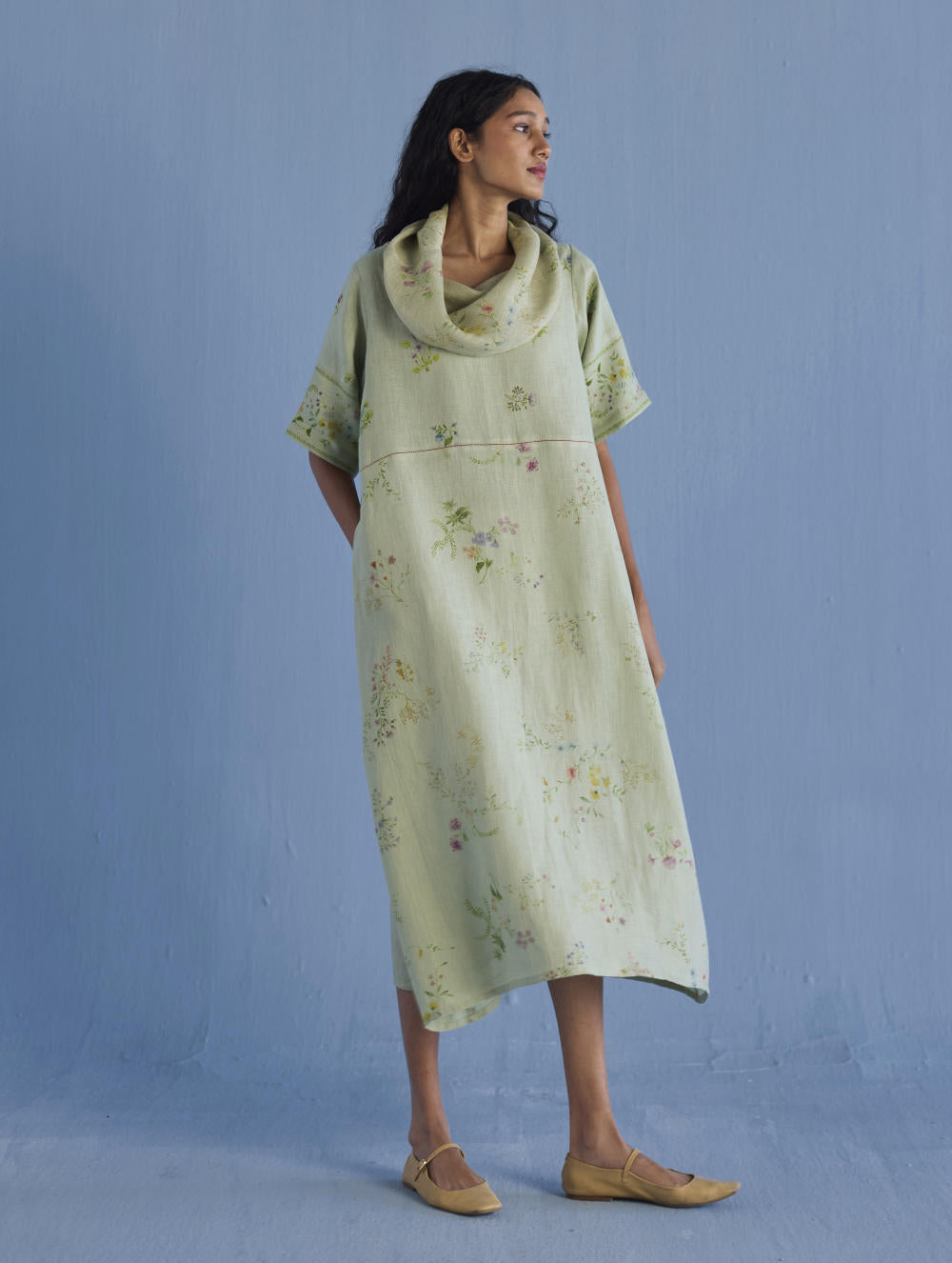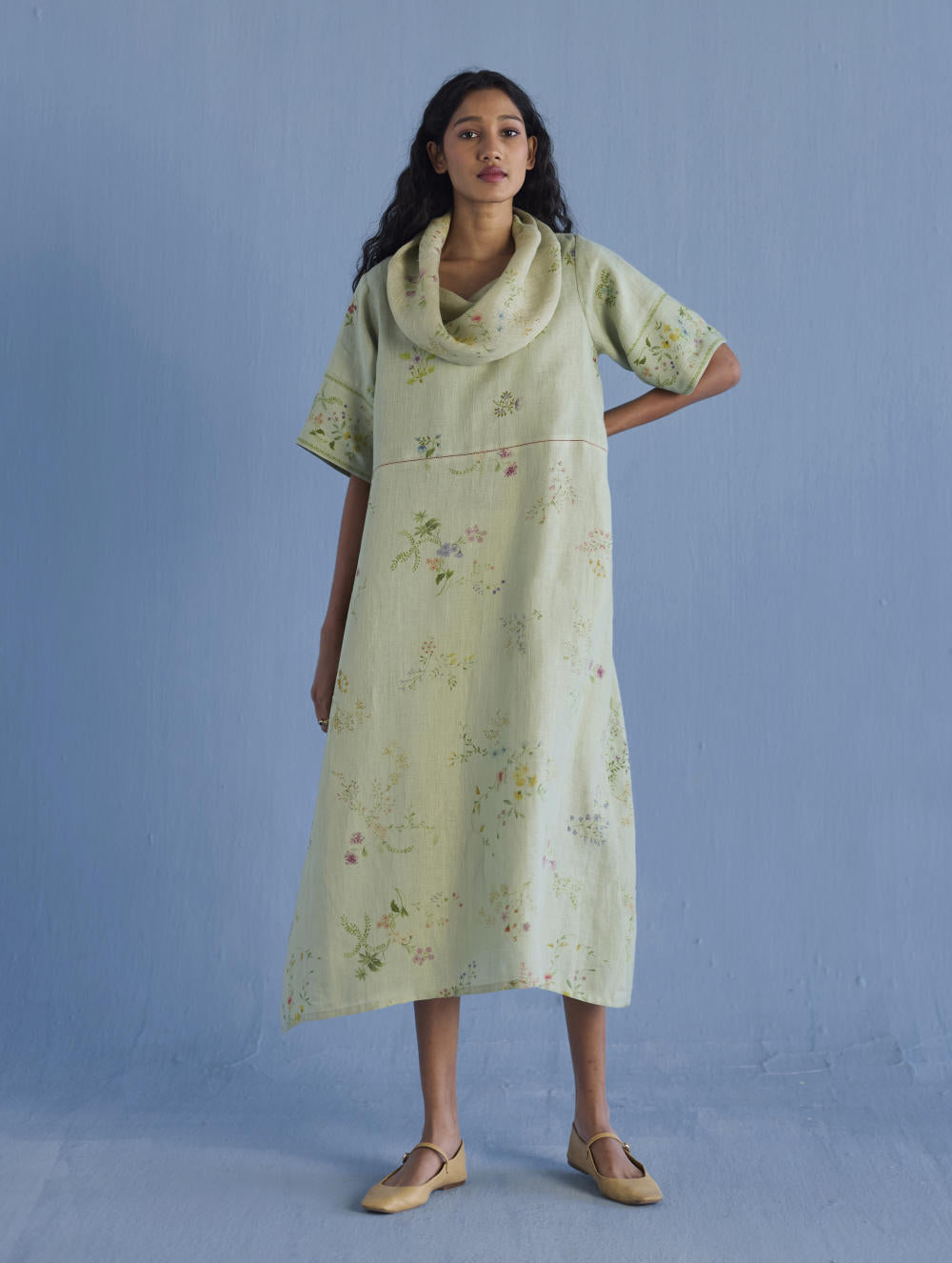 One of our timeless favourites - the cowl neck midi dress handcrafted in our soft yarn-dyed linen with cowl neck in printed soft sheer linen. The dress is designed in two hand-painted floral prints - a jaal floral print and a buta (motif) floral print. Accented with pop coloured fagotting stitch detailing in the front and back and finished with a printed border detail on the sleeves and pockets.