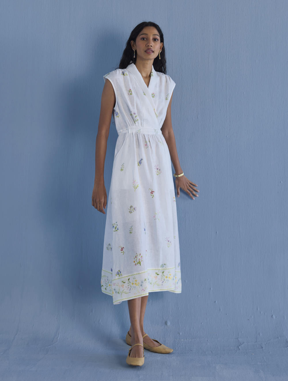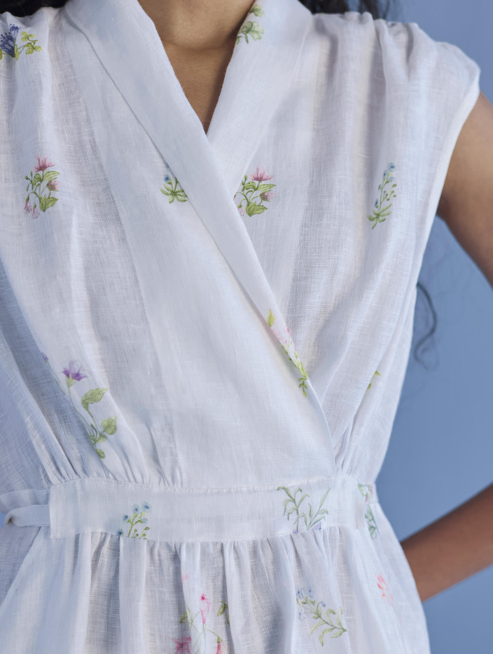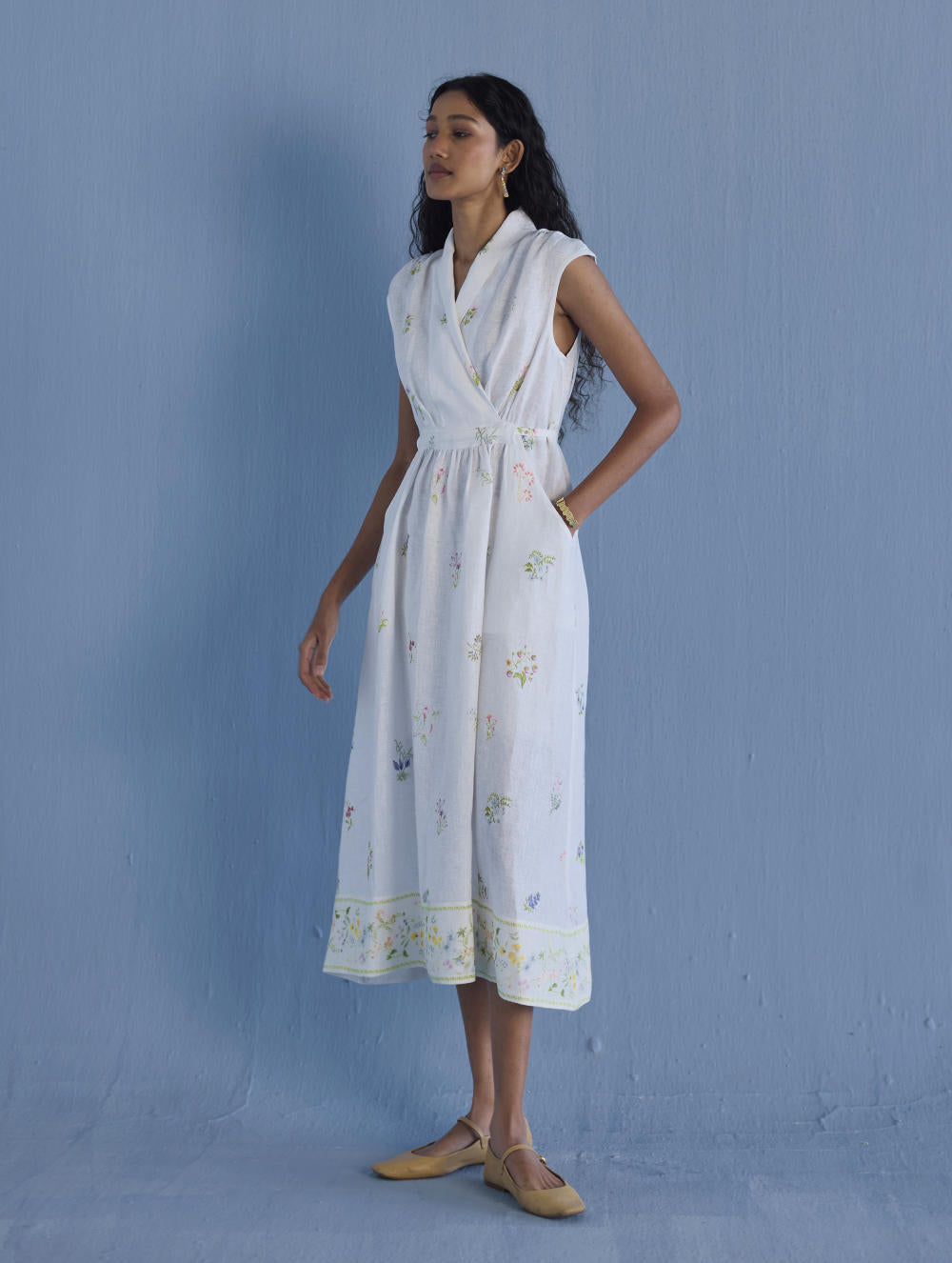 Our favourite contemporary shawl collar midi dress is handcrafted from our signature yarn-dyed linen printed with a hand-painted floral print. Gathered thoughtfully at the waist, the Mema Dress is finished with a printed sheer linen border at hem, pockets and has hand-embroidered bead detailing on the linen fabric belt. We love the Mema dress for it's versatility and it is one of our favourites to dress down or up.