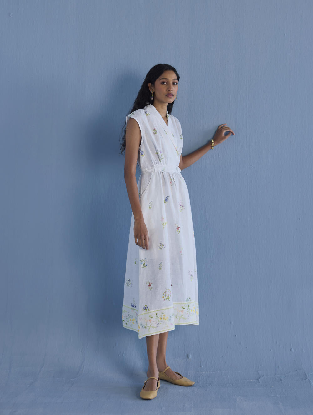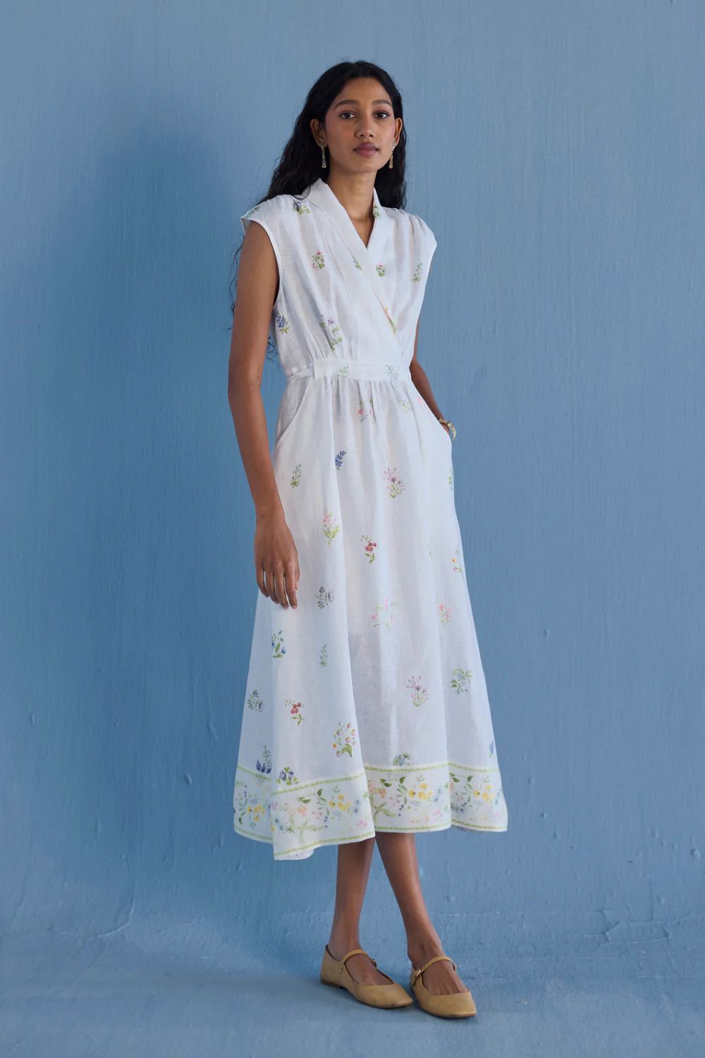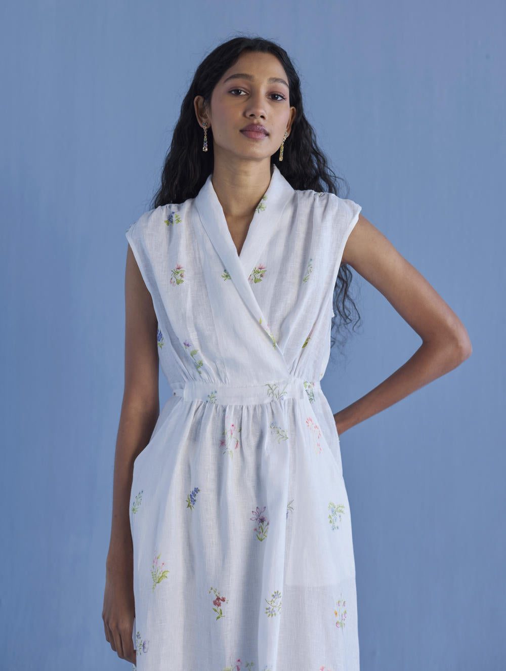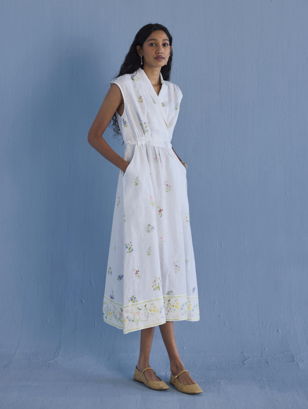 Our favourite contemporary shawl collar midi dress is handcrafted from our signature yarn-dyed linen printed with a hand-painted floral print. Gathered thoughtfully at the waist, the Mema Dress is finished with a printed sheer linen border at hem, pockets and has hand-embroidered bead detailing on the linen fabric belt. We love the Mema dress for it's versatility and it is one of our favourites to dress down or up.