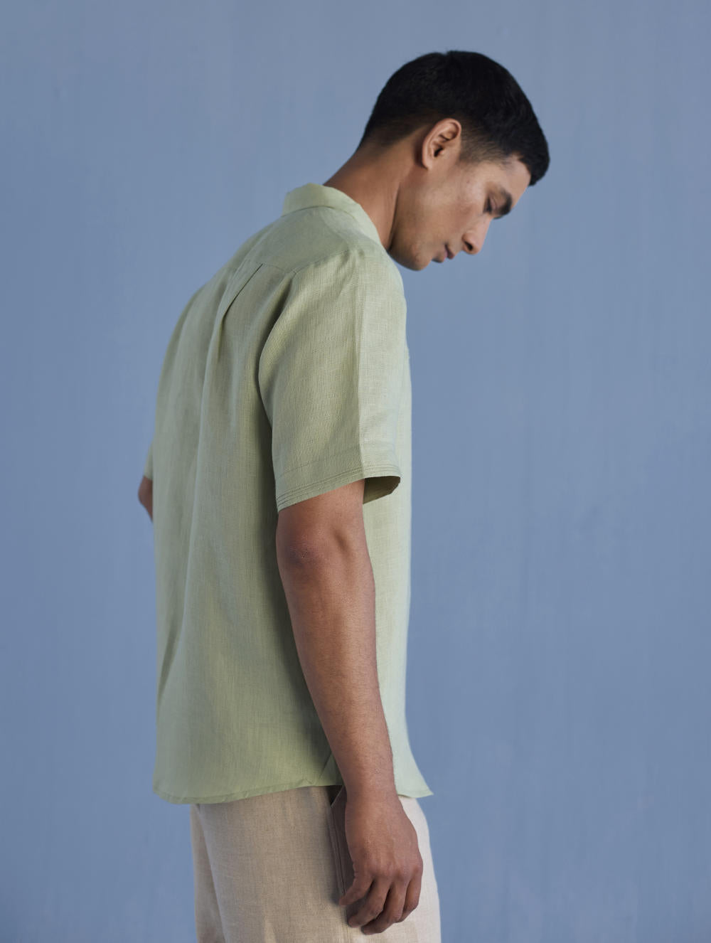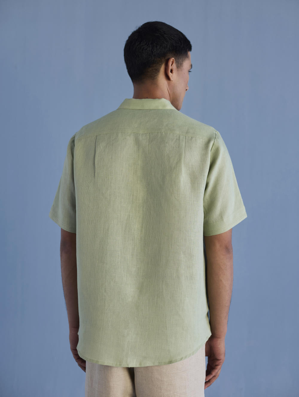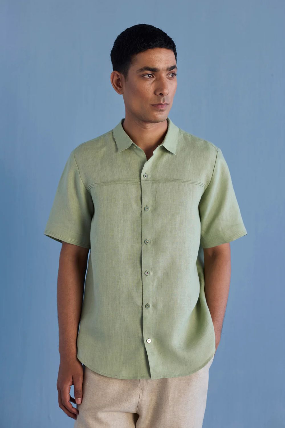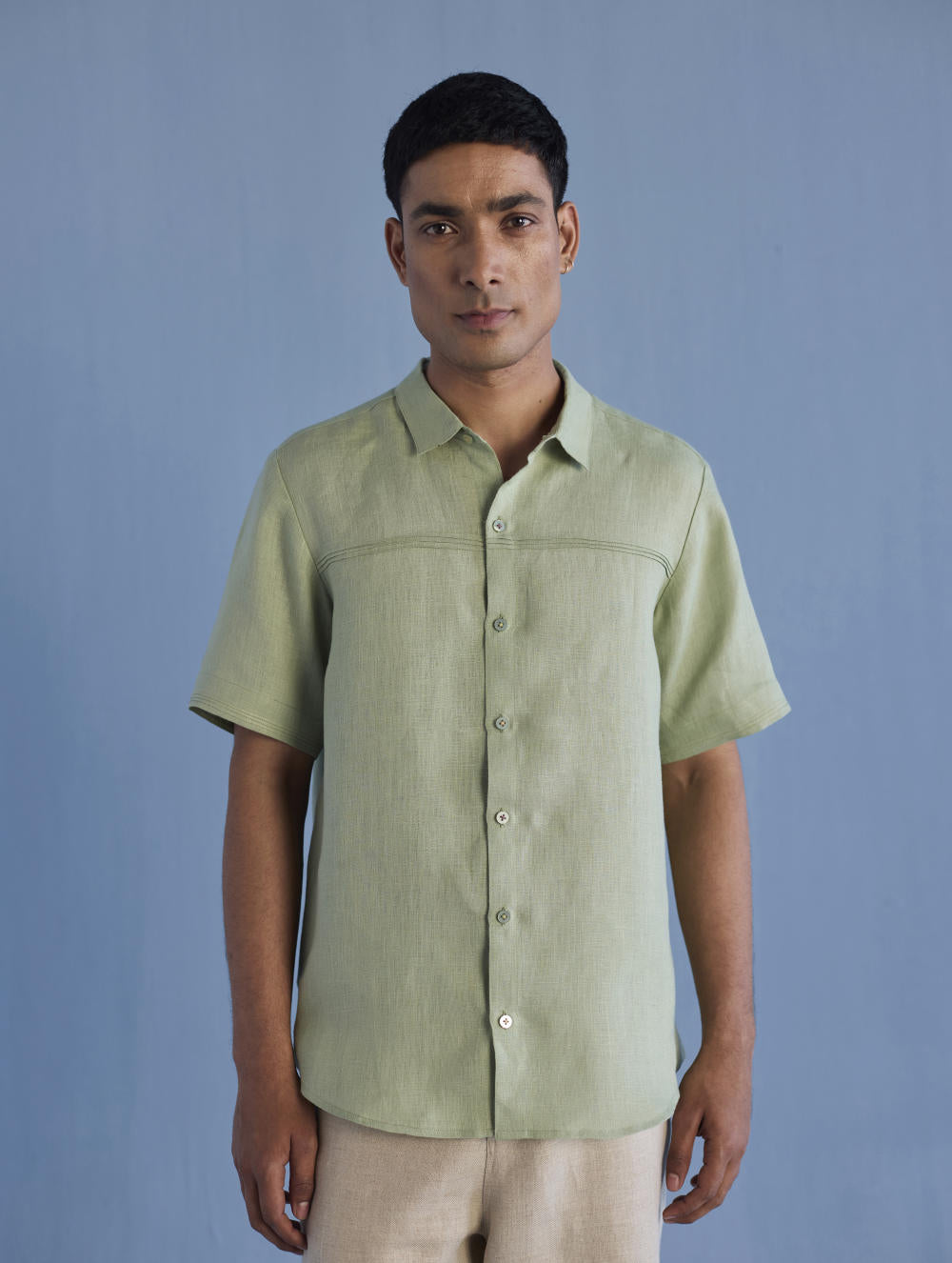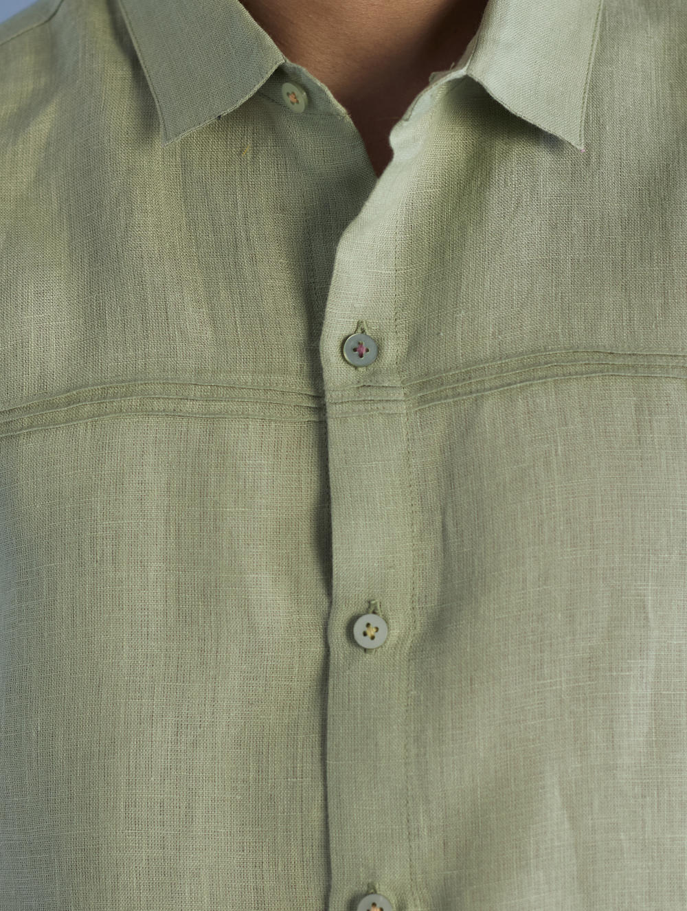 An easy classic collared short sleeve shirt with horizontal fine pintucks along the chest and at the edge of the sleeve, finished with hand-dyed tonal buttons. A summer linen shirt that pairs well with everything.