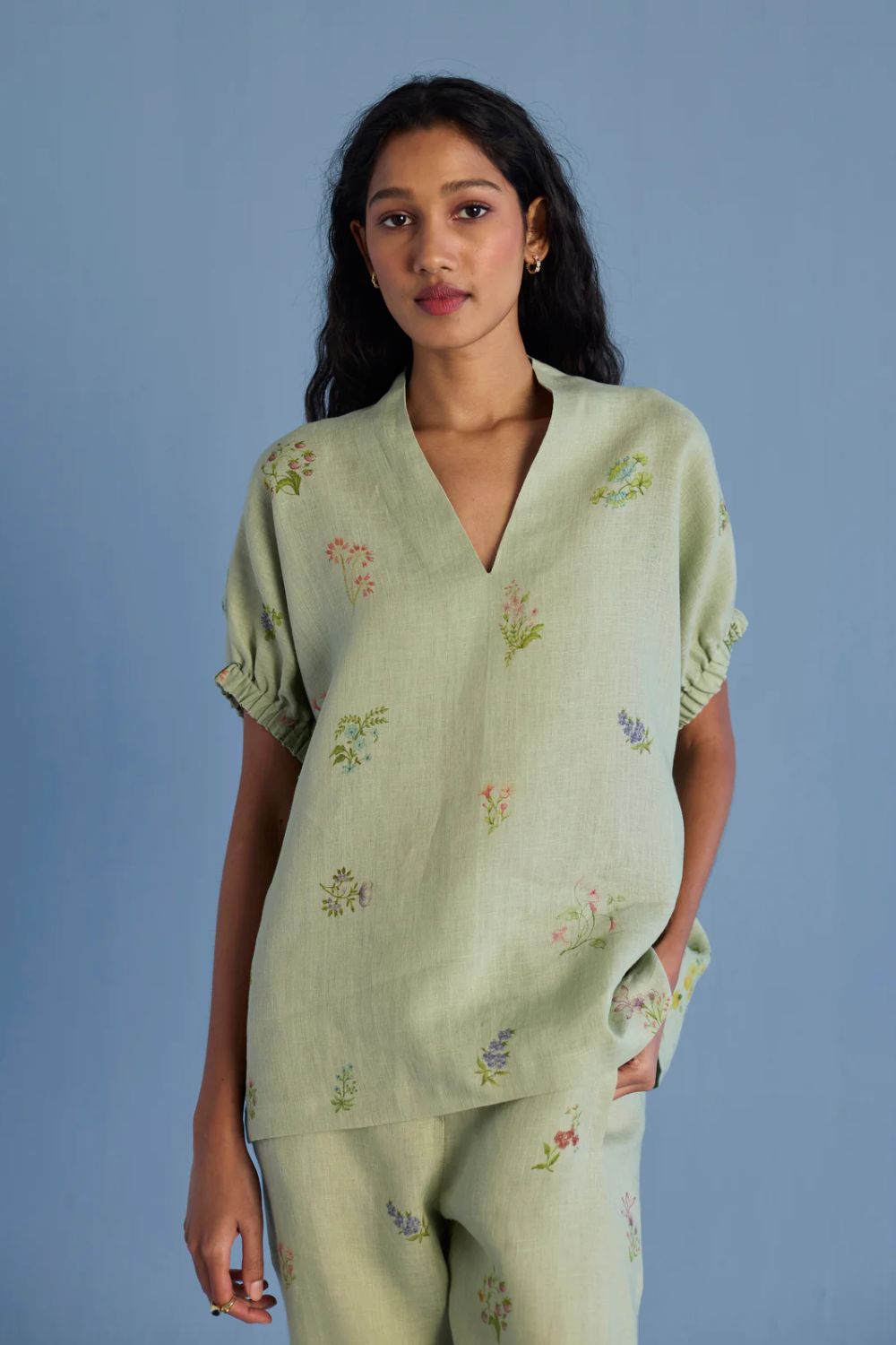 A chic v- neck elasticated sleeve top crafted from our soft yarn-dyed linen with a hand- illustrated and hand-painted multicoloured floral print enhanced with coloured fagotting stitch detailing the back. Perfect for balmy summer days and relaxed get-togethers.