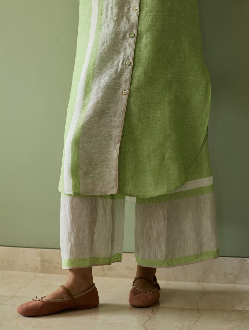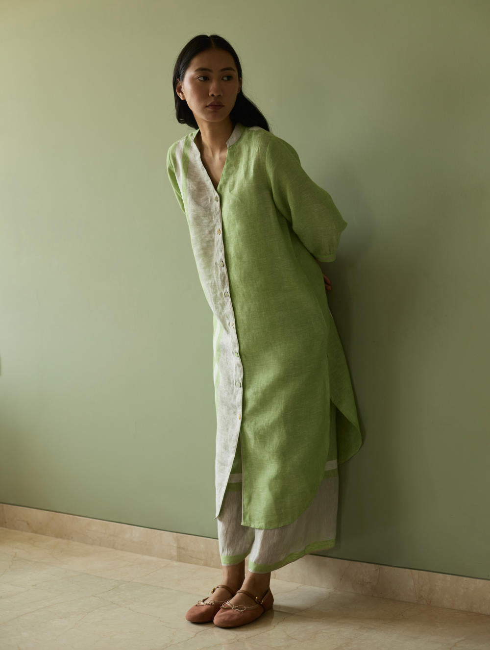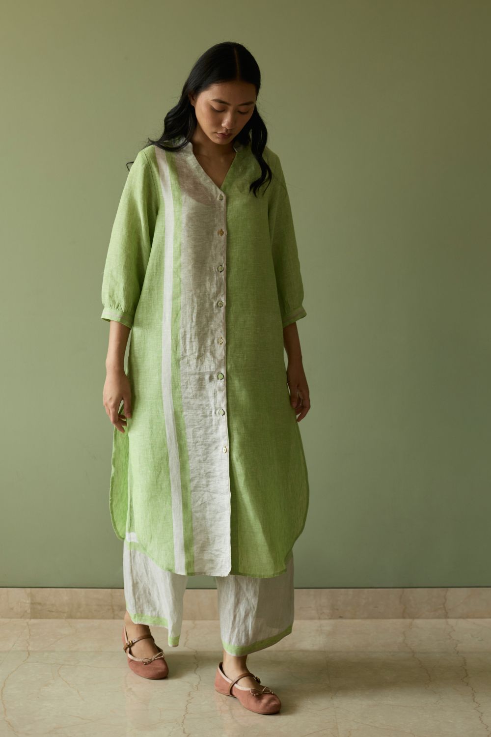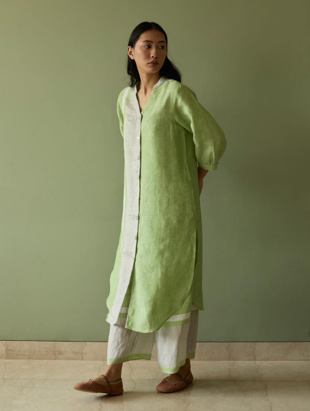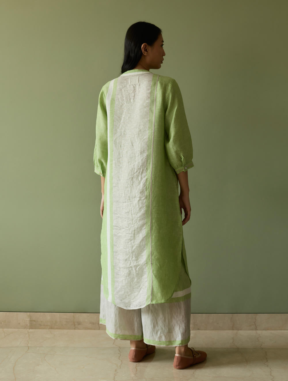 A V-neck shirt kurta is crafted from our signature soft handwoven metallic border linen, A subtle grey woven selvedge traces the silhouette along the placket, back and 3/4th sleeve hems. The Mori has comfortable pockets and is finished with a blend of of linen fabric and mother-of-pearl buttons.