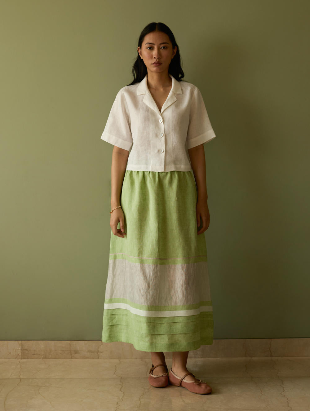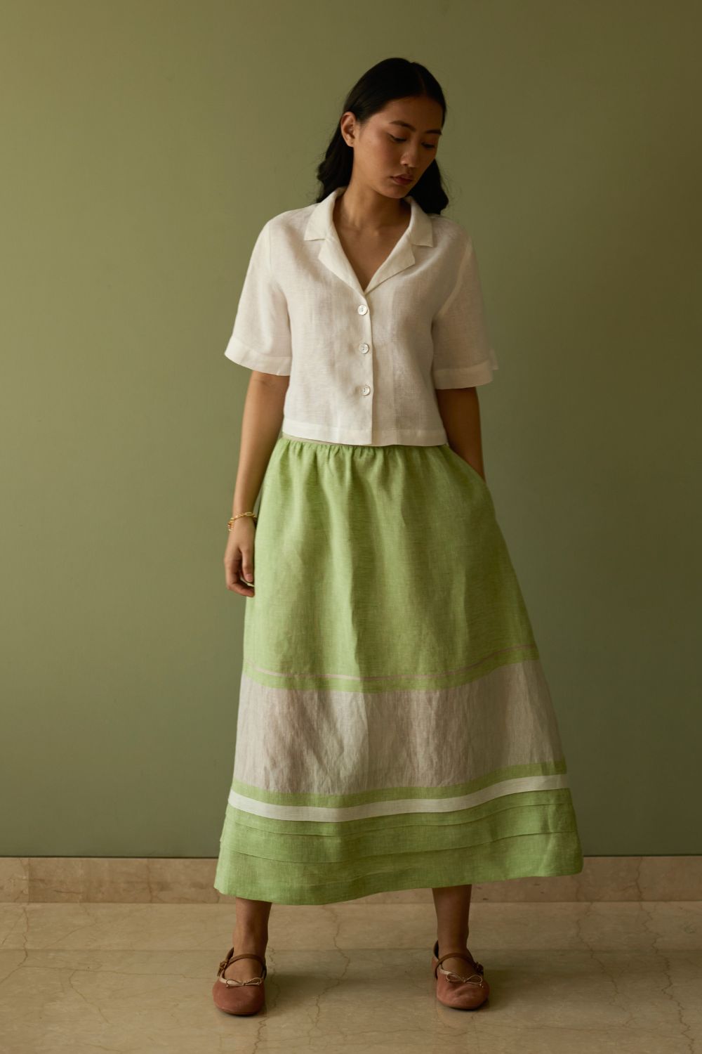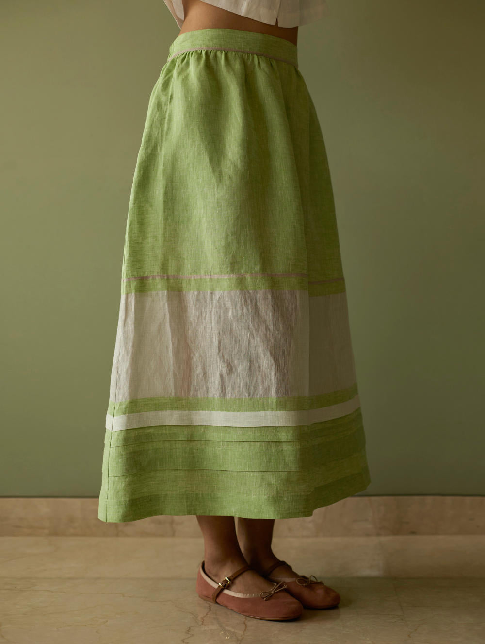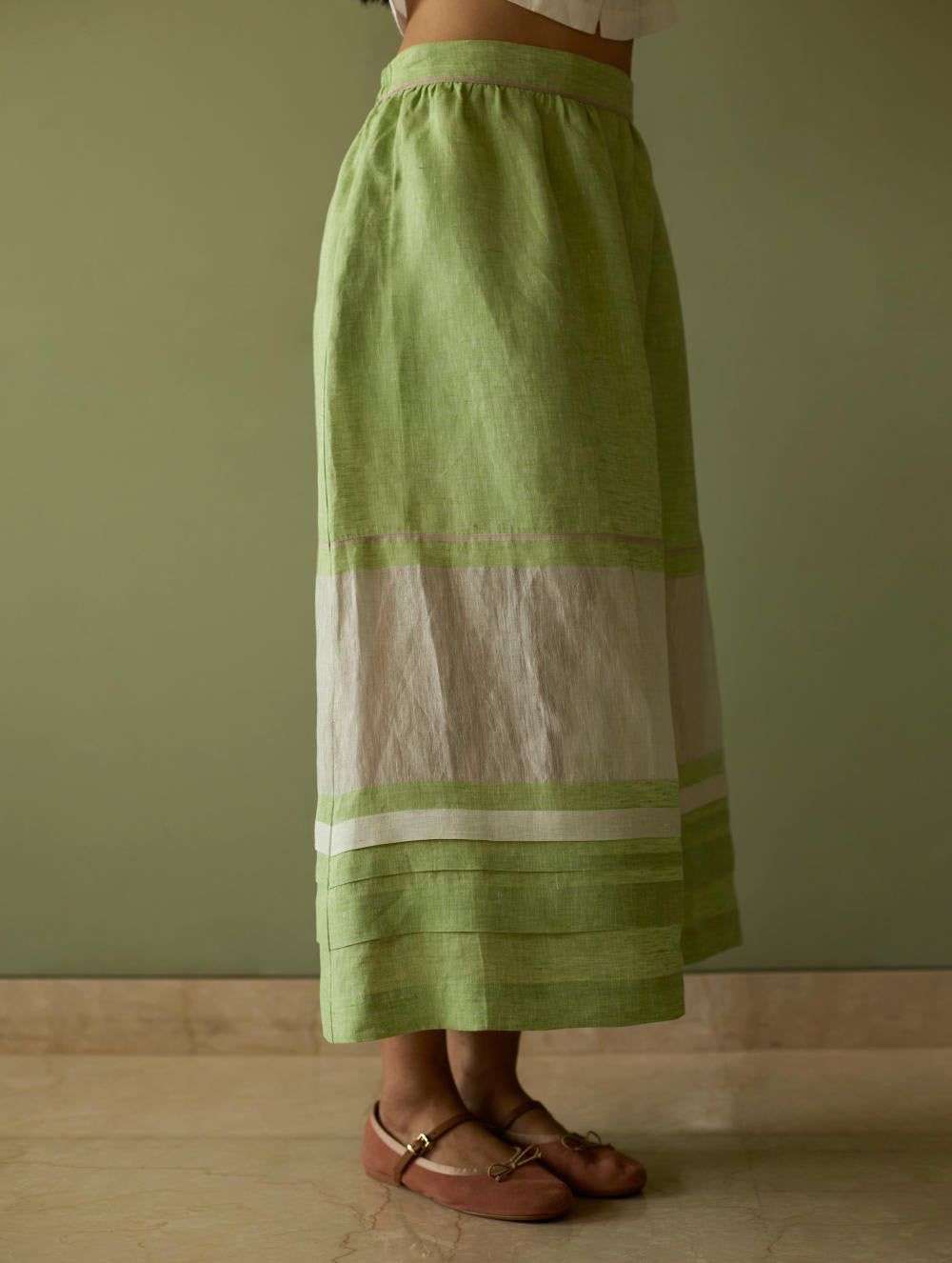 This effortlessly flowing A-line skirt is crafted from our signature handwoven metallic border linen, softly accented with a subtle grey selvedge. Thoughtfully placed metallic borders frame the silhouette, while uneven pleat detailing at the hem adds gentle volume and texture. Designed with everyday ease in mind, it features a back-elasticated waistband and functional side pockets. A refined essential that beautifully balances craftsmanship, comfort, and timeless elegance.