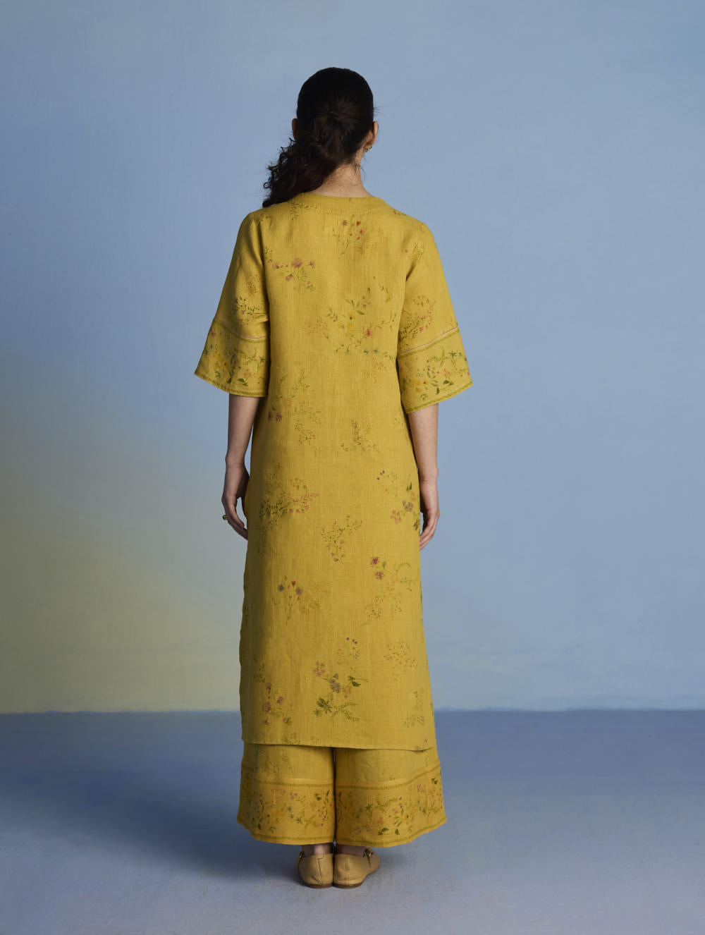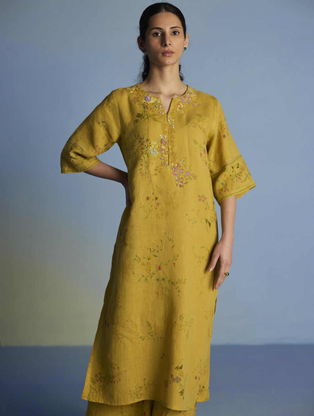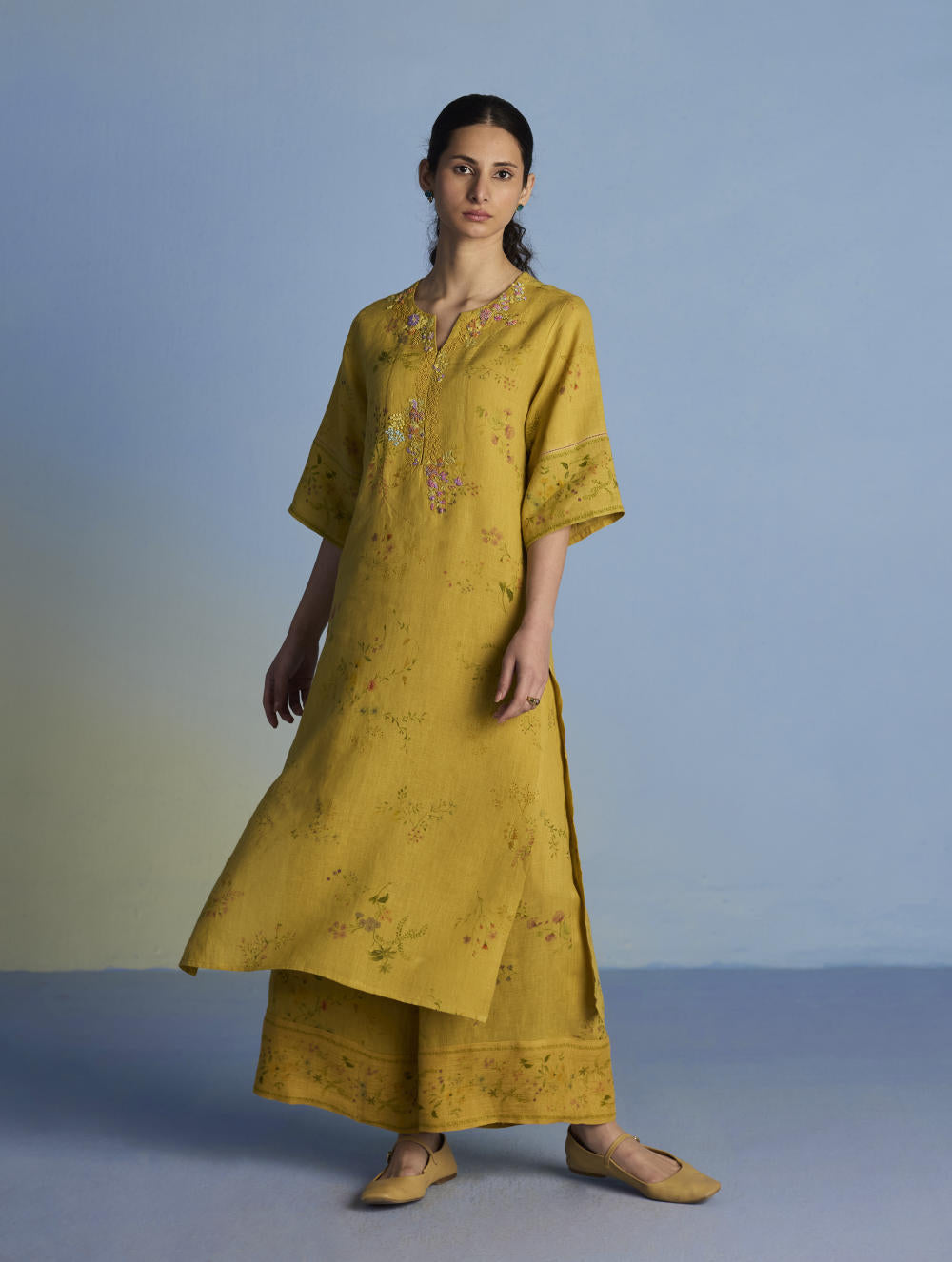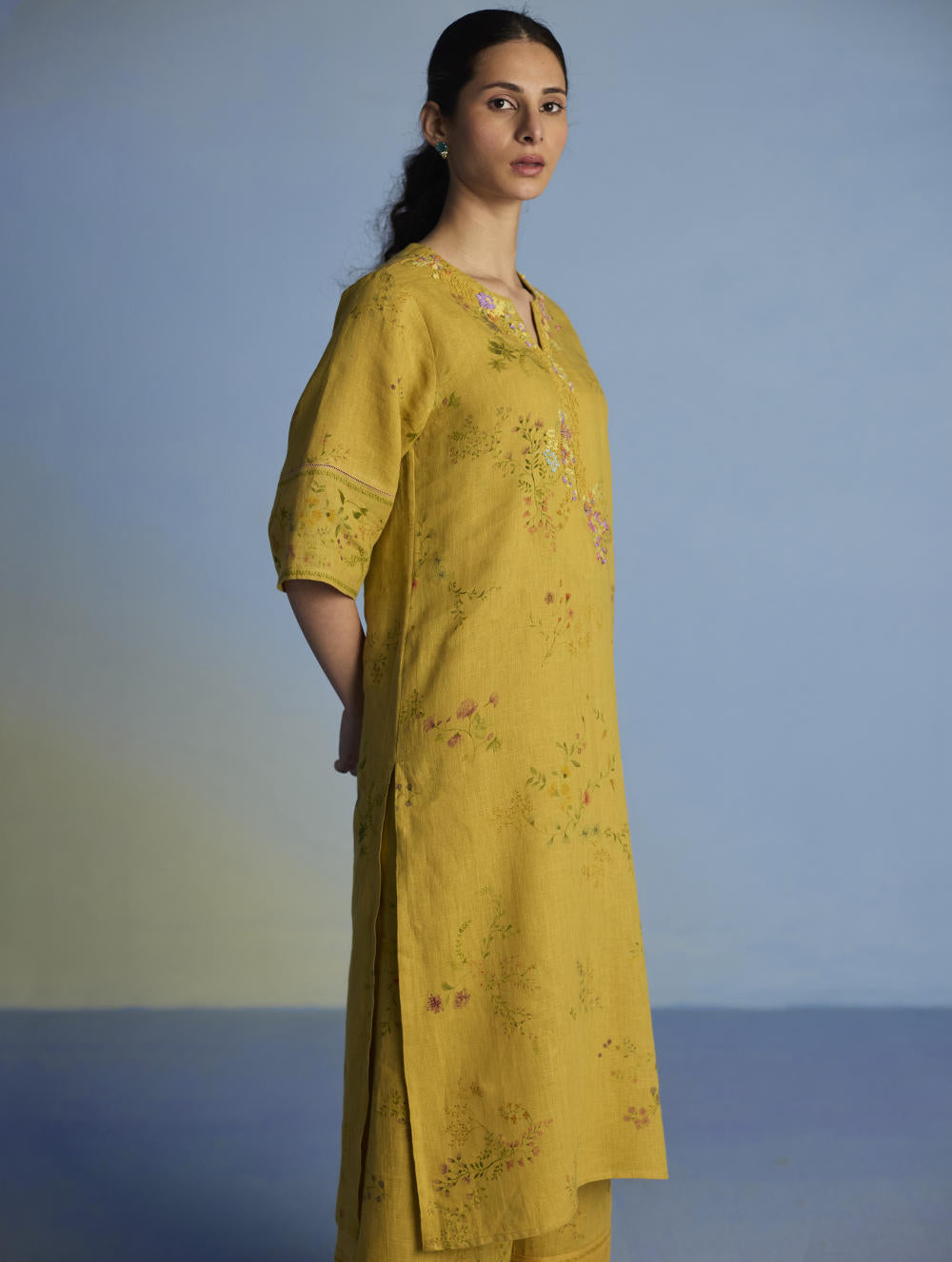 Kurta - A signature Manan kurta silhouette crafted from our signature soft yarn-dyed linen with a hand-painted detailed floral print jaal highlighted with textural multi-coloured zardozi hand-embroidery along the neckline and printed border detail on the sleeves. Wear it with our flared pants for a statement, yet comfortable look.