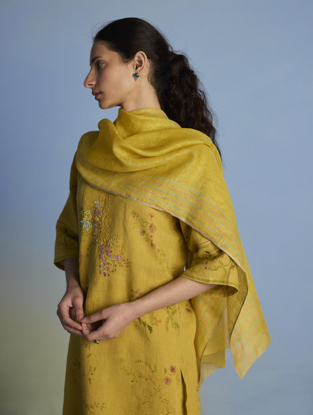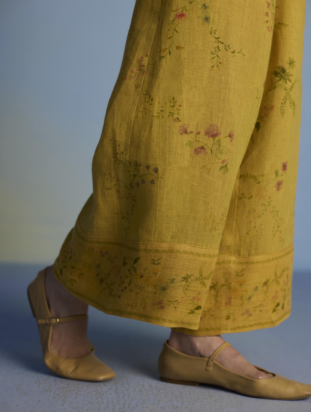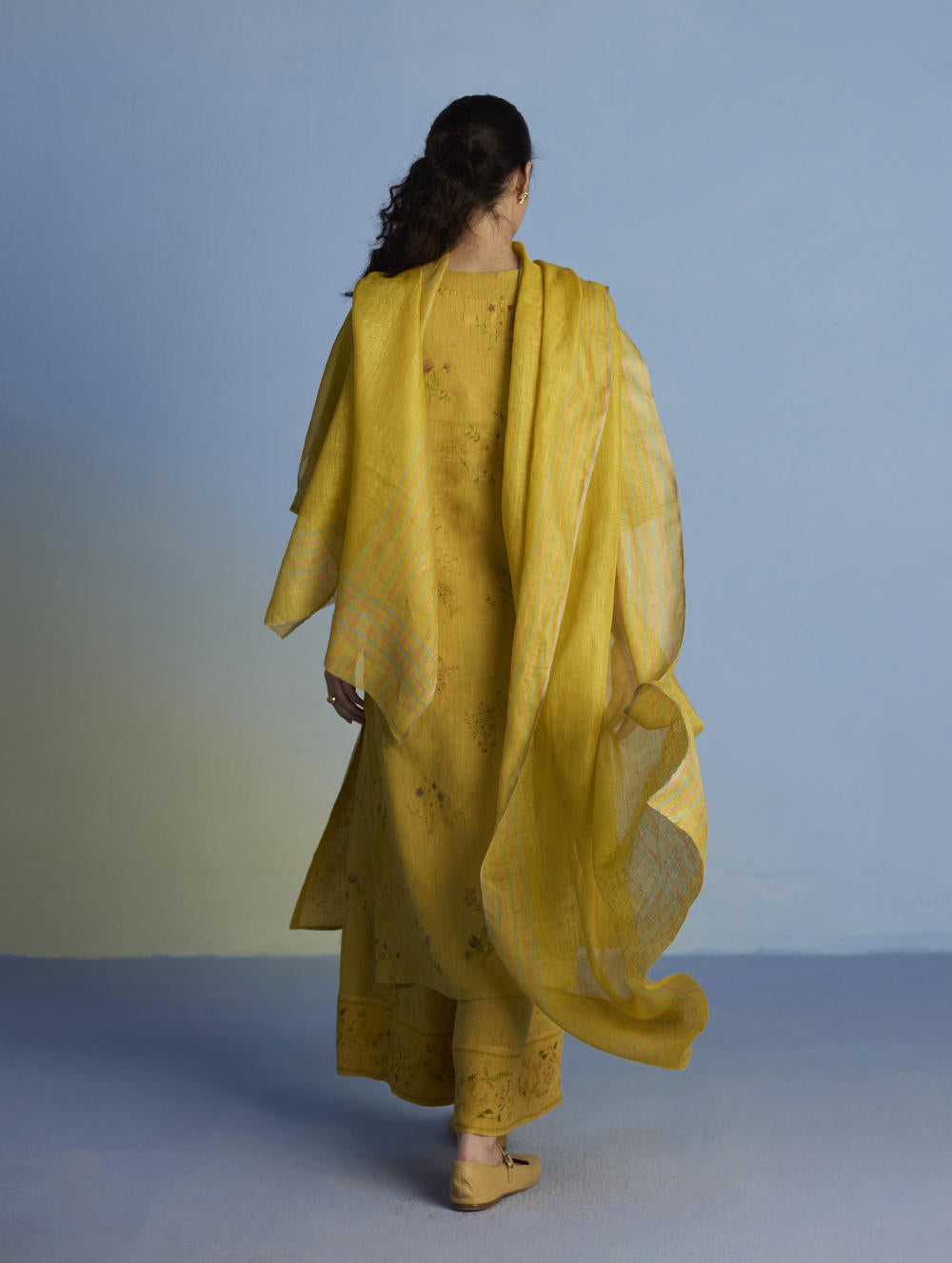 Pant- Classic linen culottes with pleats at the waistband, comfortable pockets and an soft elasticated back waistband in our signature yarn-dyed linen with a hand-painted multi-coloured floral print. The Ama pants are intricately patched with a soft flowing floral border printed sheer linen at the hemline. Dupatta- A soft handwoven pure linen dupatta with a multi-coloured stripe border in contrast colours and pop colour selvedge.
