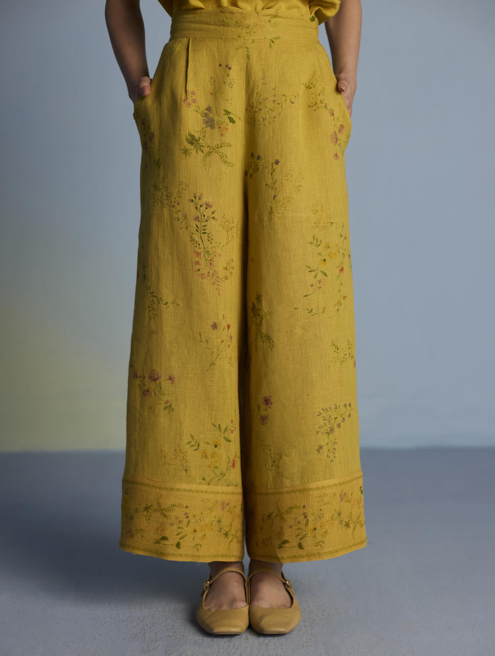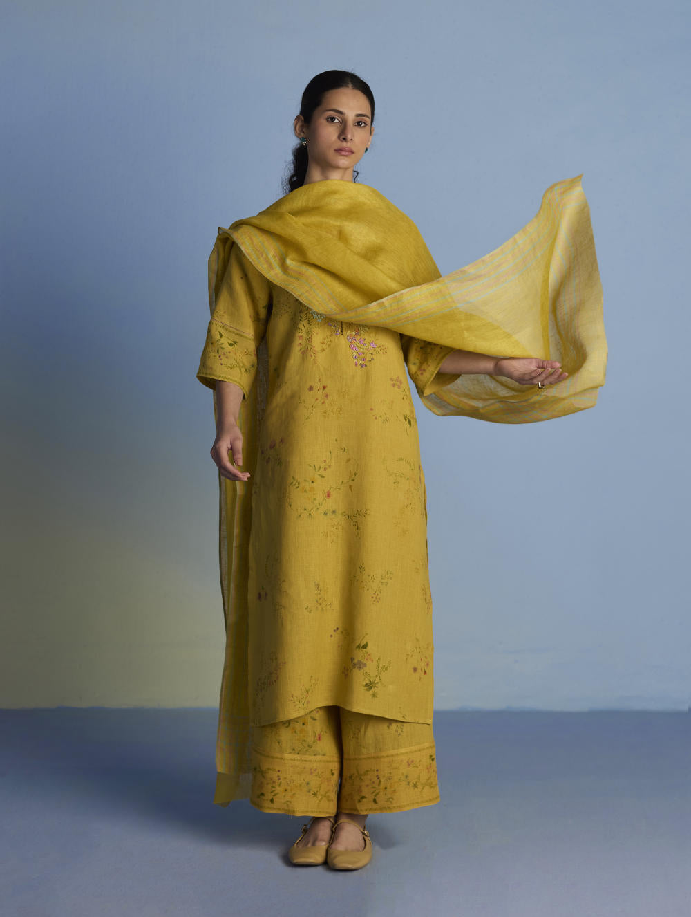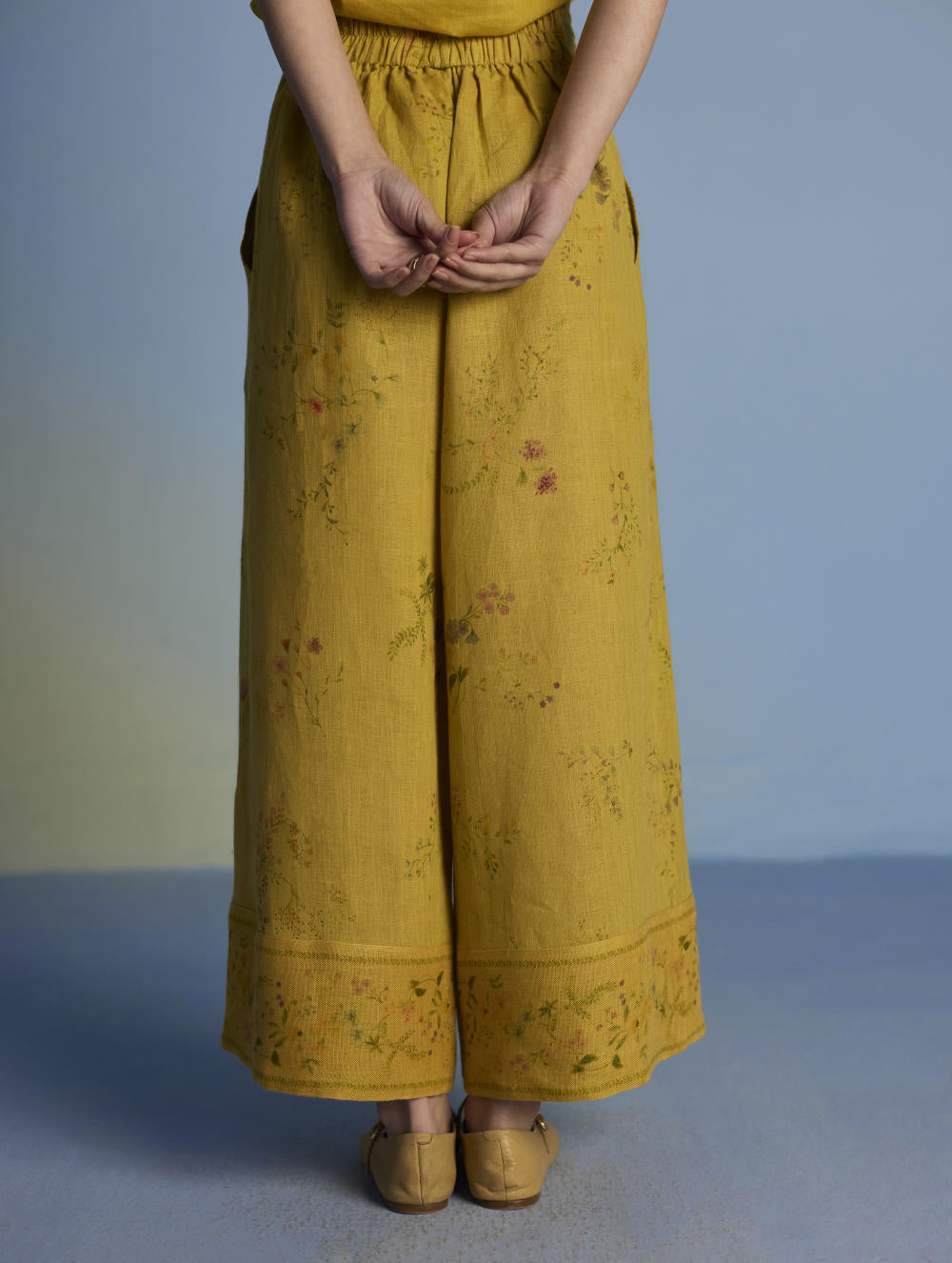 Pant- Classic linen culottes with pleats at the waistband, comfortable pockets and an soft elasticated back waistband in our signature yarn-dyed linen with a hand-painted multi-coloured floral print. The Ama pants are intricately patched with a soft flowing floral border printed sheer linen at the hemline. Dupatta- A soft handwoven pure linen dupatta with a multi-coloured stripe border in contrast colours and pop colour selvedge.