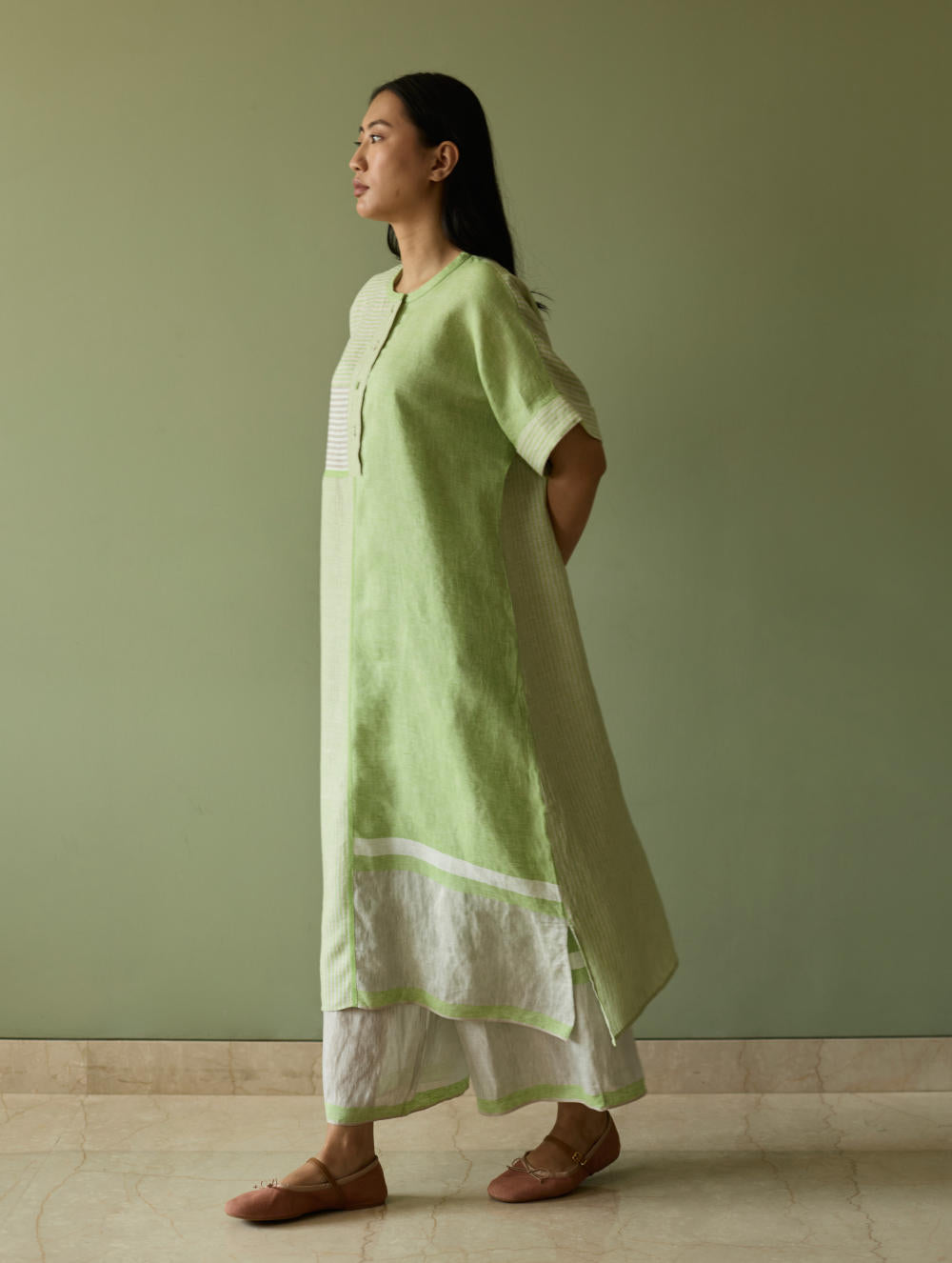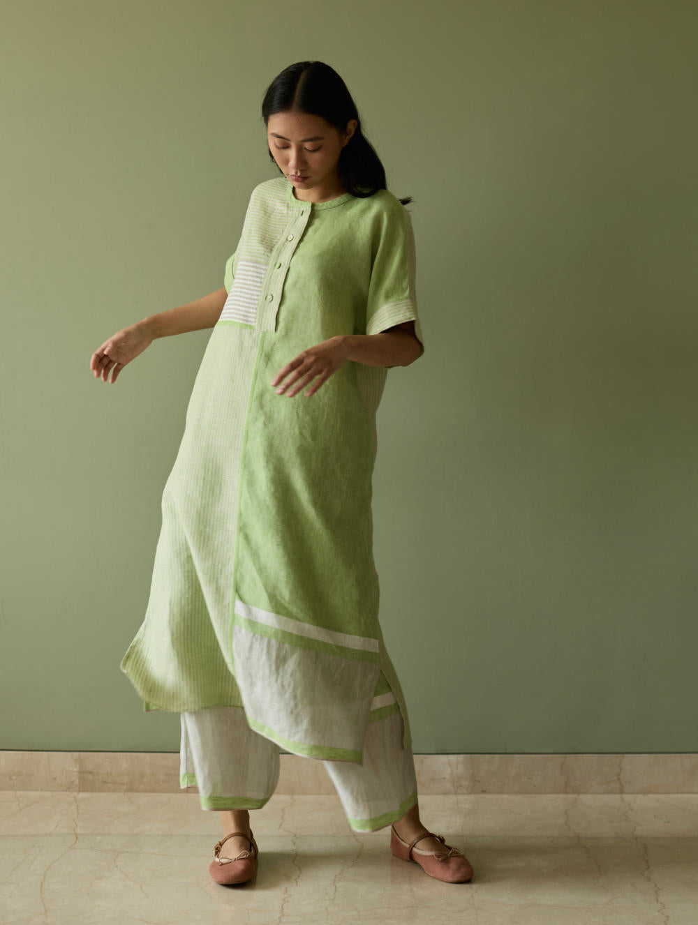 This kaftan style panelled tunic is crafted from our signature soft handwoven fabrics — a thoughtful composition of solid linen with metallic borders and multi-coloured yarn-dyed stripe linen. The relaxed silhouette flows with ease, anchored by a slender mandarin collar and a broad placket, finished with linen fabric buttons and pockets. A woven selvedge and a metallic border details trace the panels and edges, adding depth, dimension, and a subtle play of texture.