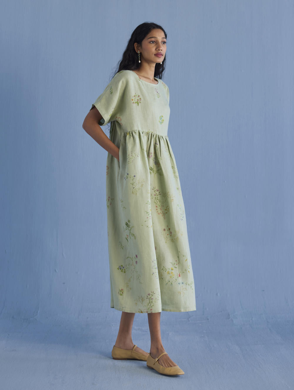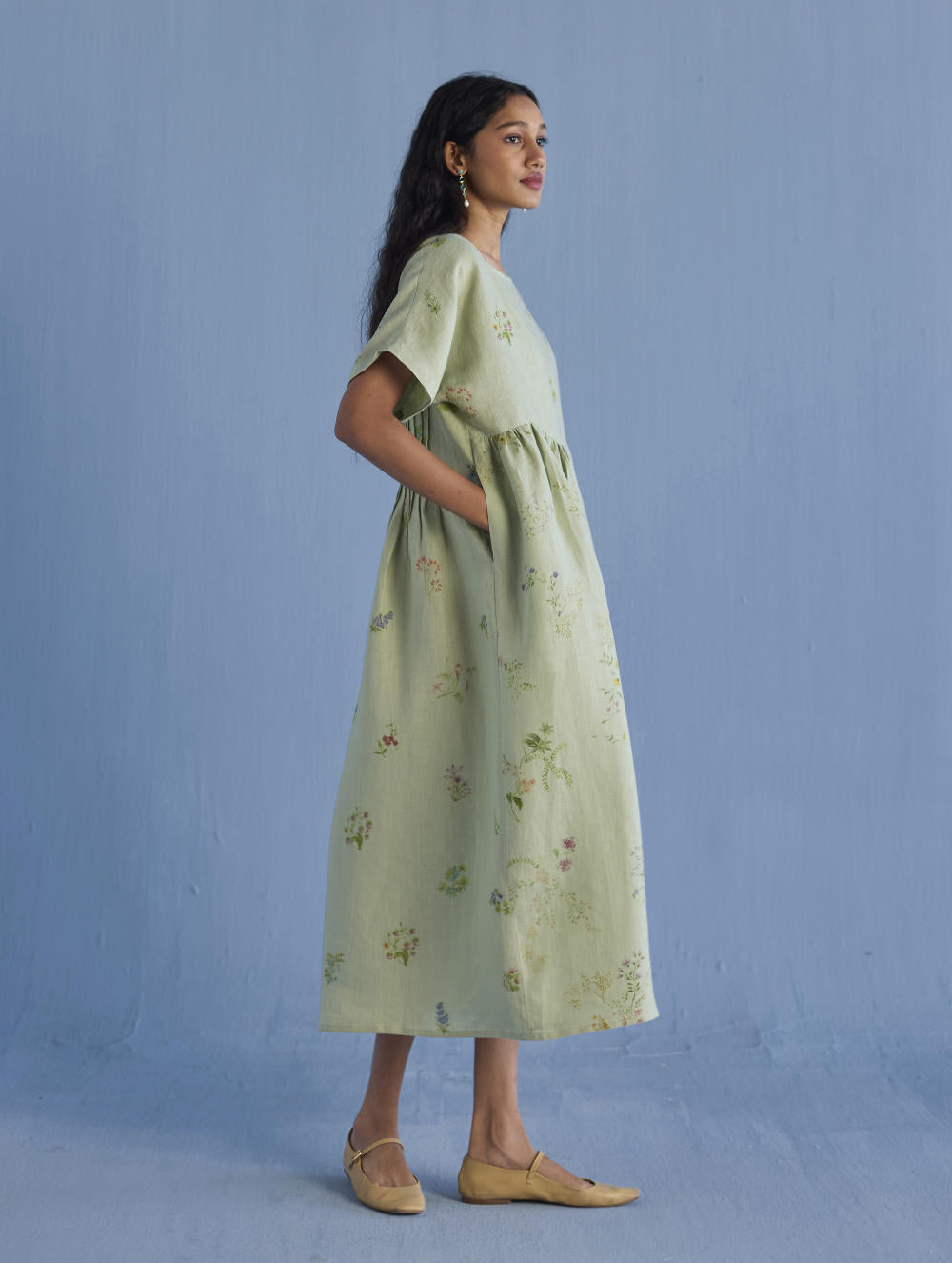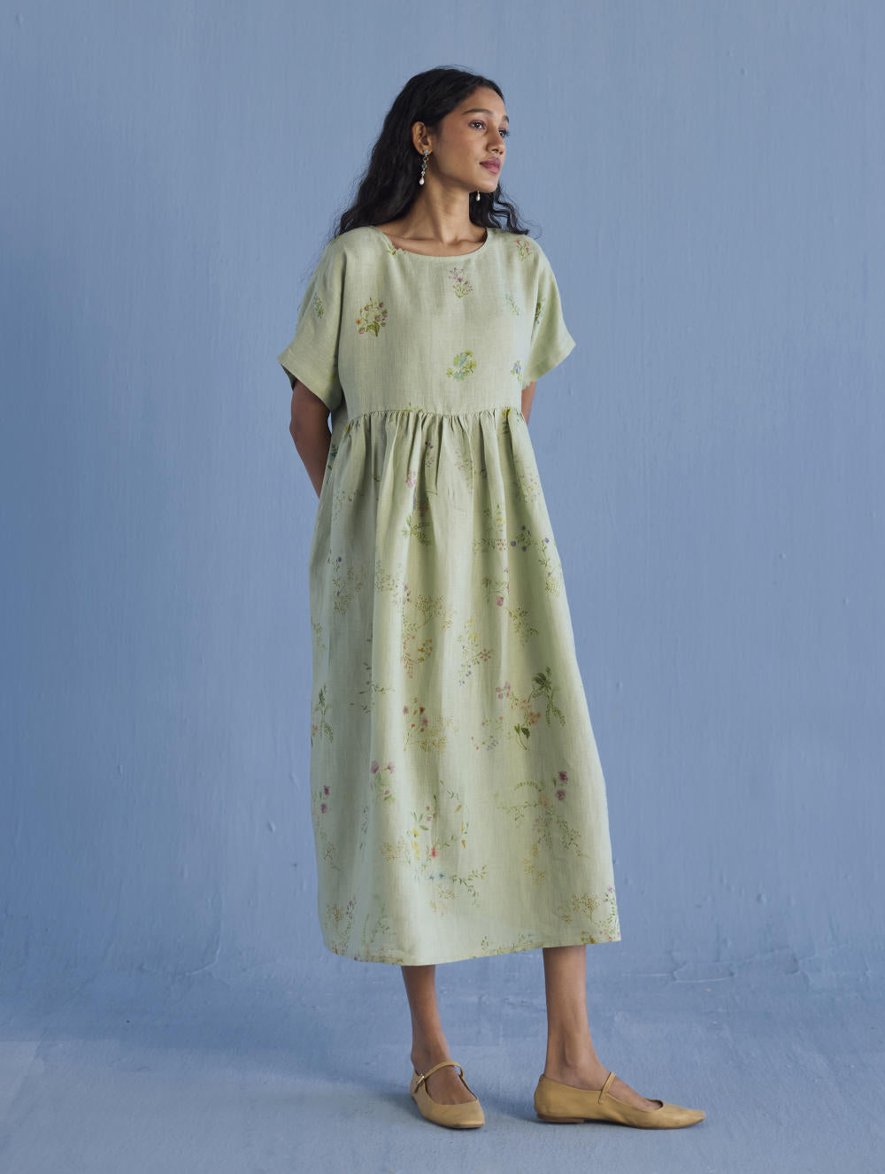 A timeless and easy-to-wear soft sheer linen dress designed with a soft timeless hand-painted floral print, pockets and intricate pleat details at the back for easy movement and style. The dress can be worn over any plain linen or cotton dresses that are part of your wardrobe. Perfect for balmy summer days.