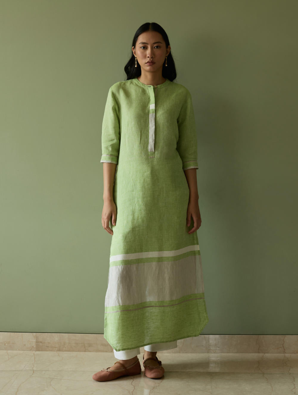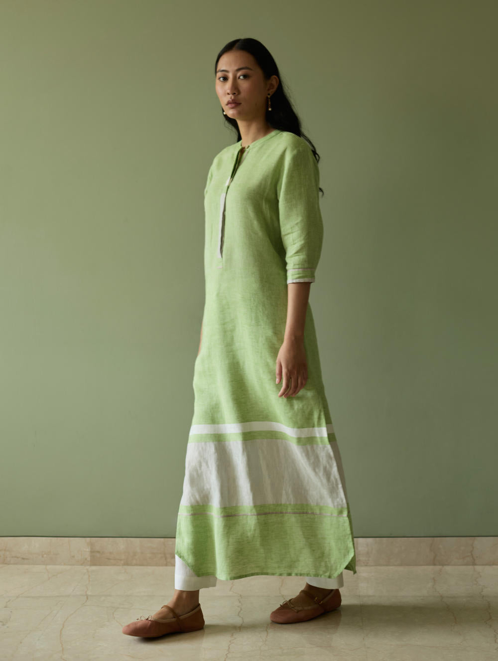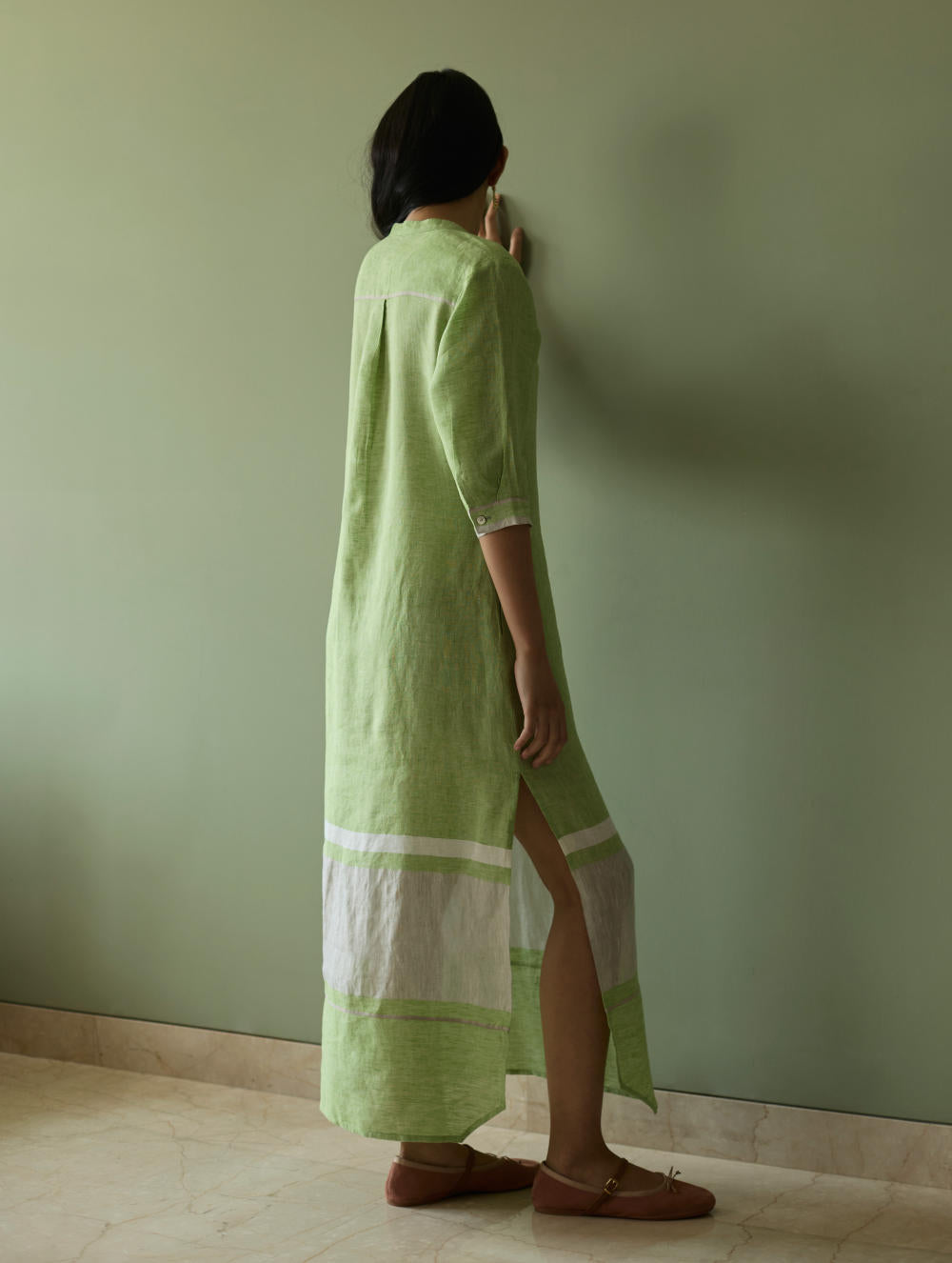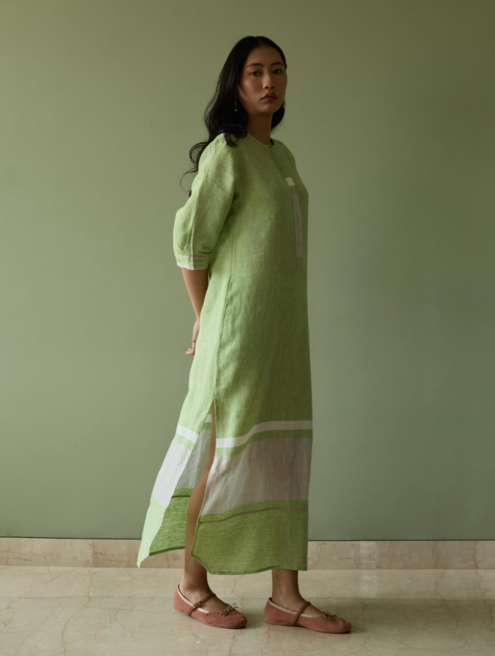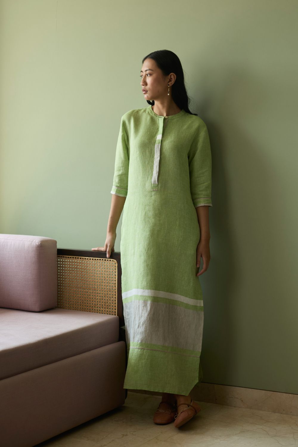 This maxi tunic dress is crafted from our signature soft handwoven metallic border linen, accented by a subtle grey selvedge that lends delicate contrast. Designed with a concealed placket, elbow-length sleeves, and practical side slits and pockets, it balances comfort with considered detail. Thoughtfully placed selvedge and metallic border accents at the hem and cuffs add texture and depth. Finished with natural mother-of-pearl buttons, this piece is a timeless expression of effortless elegance and artisanal craft.