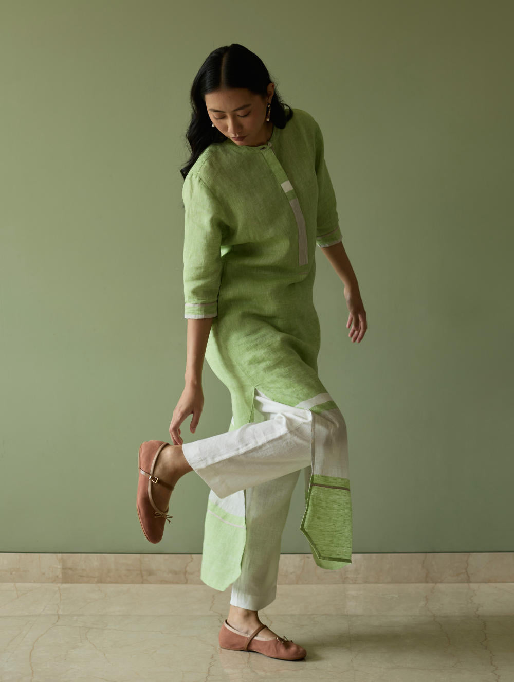 Today, Manan offers womenswear, menswear, dupattas, and jewellery — all shaped by the ethos of slow, contemplative design. Their palette is grounded in natural hues; their silhouettes are soft, balanced, and seasonless. Kurta sets and separates capture a modern Indian aesthetic that travels effortlessly anywhere in the world, while co-ord sets offer longevity and versatility in equal measure. Shirts, dresses, trousers, jackets, and dupattas form a modular wardrobe that encourages personal expression.