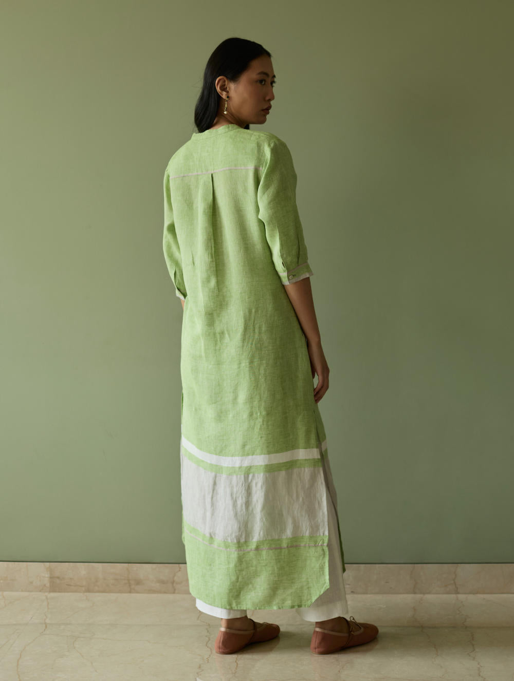 Their signature linens soften beautifully with time, eventually returning to the earth. They work with eri (ahimsa) silk, celebrated for its strength and gentle texture, and craft thoughtful blends of viscose, cotton, silk, and linen for pieces designed to last. Yarn-dyed techniques minimise chemical use and create the subtle, heathered tones that have become a quiet Manan signature.