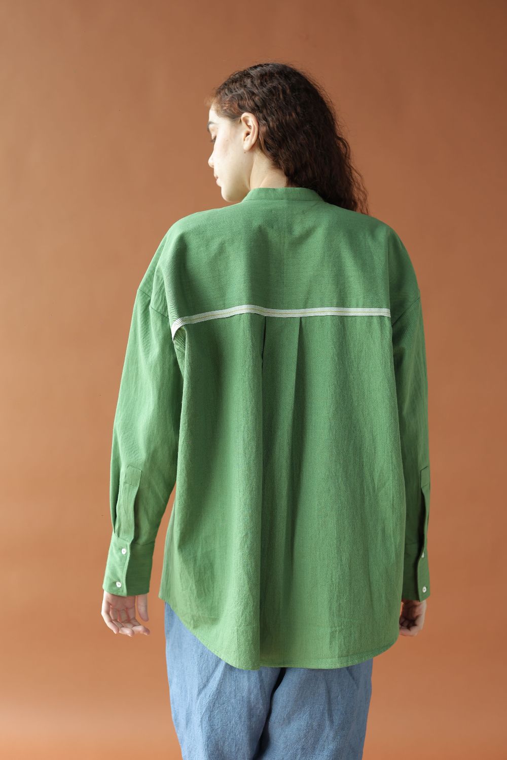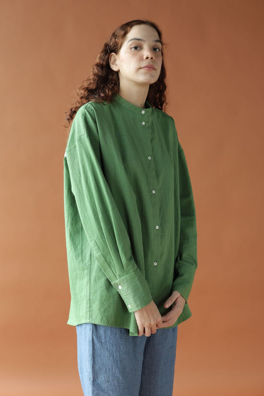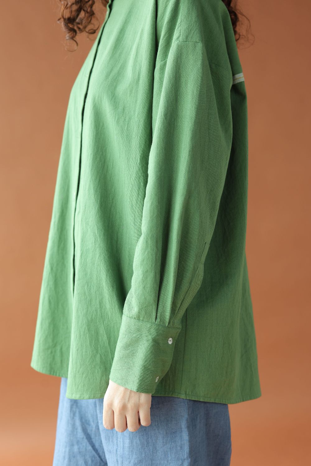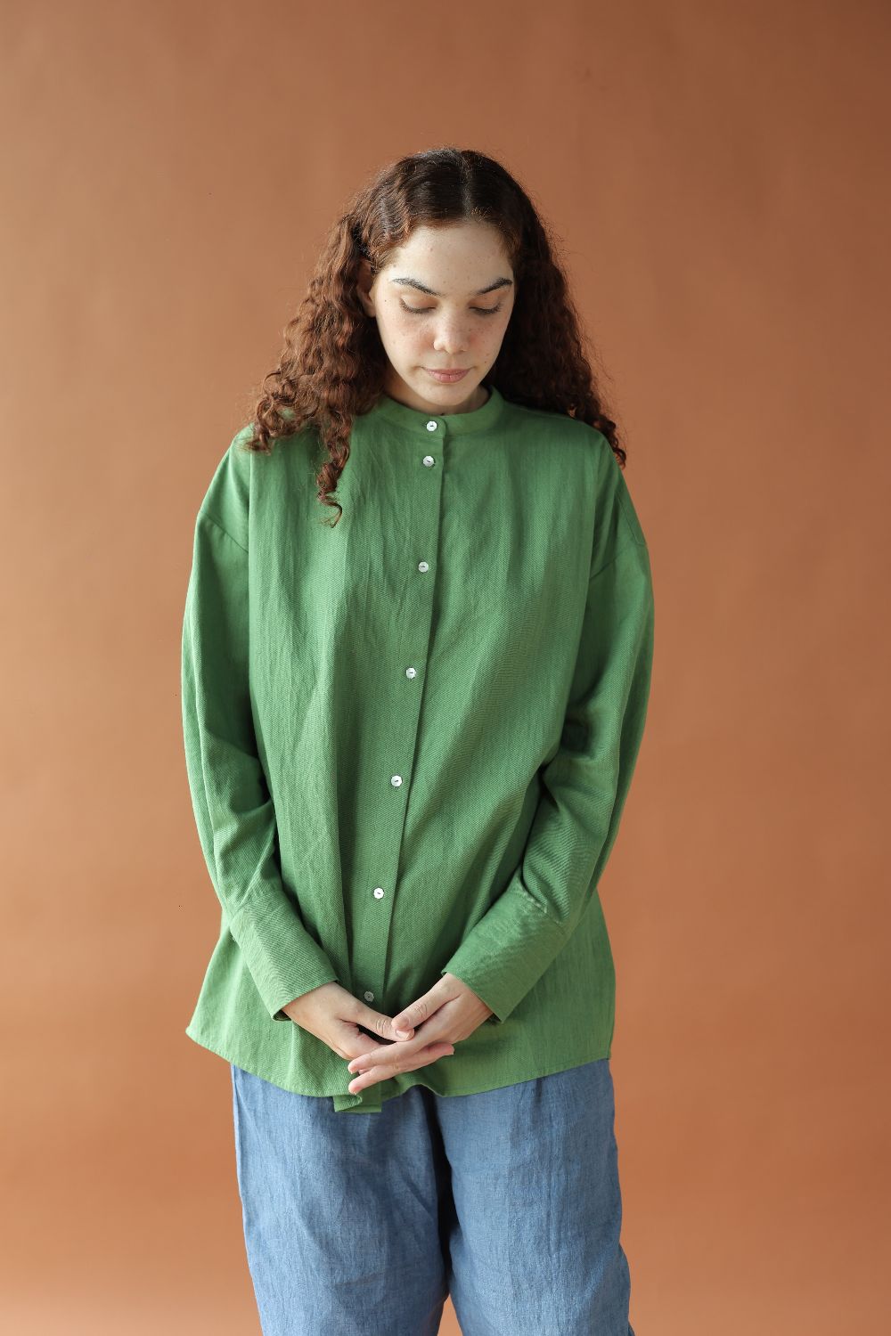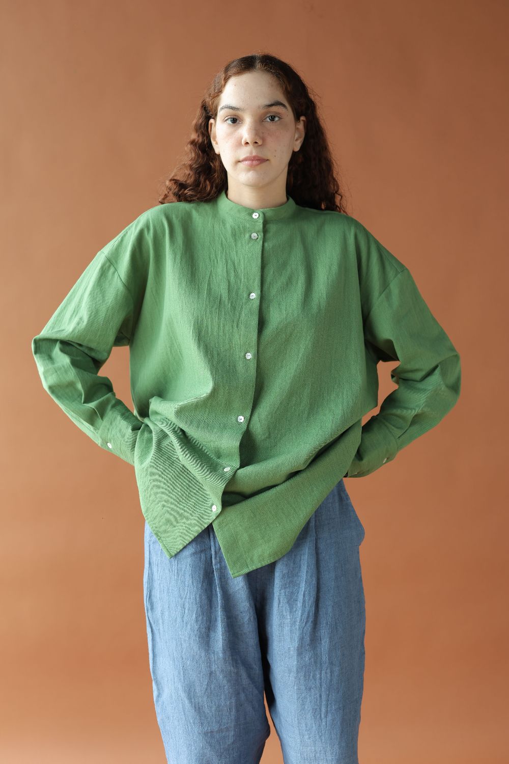 A vibrant, oversized cotton twill shirt in an pale moss green, with shell buttons and a Chinese collar.