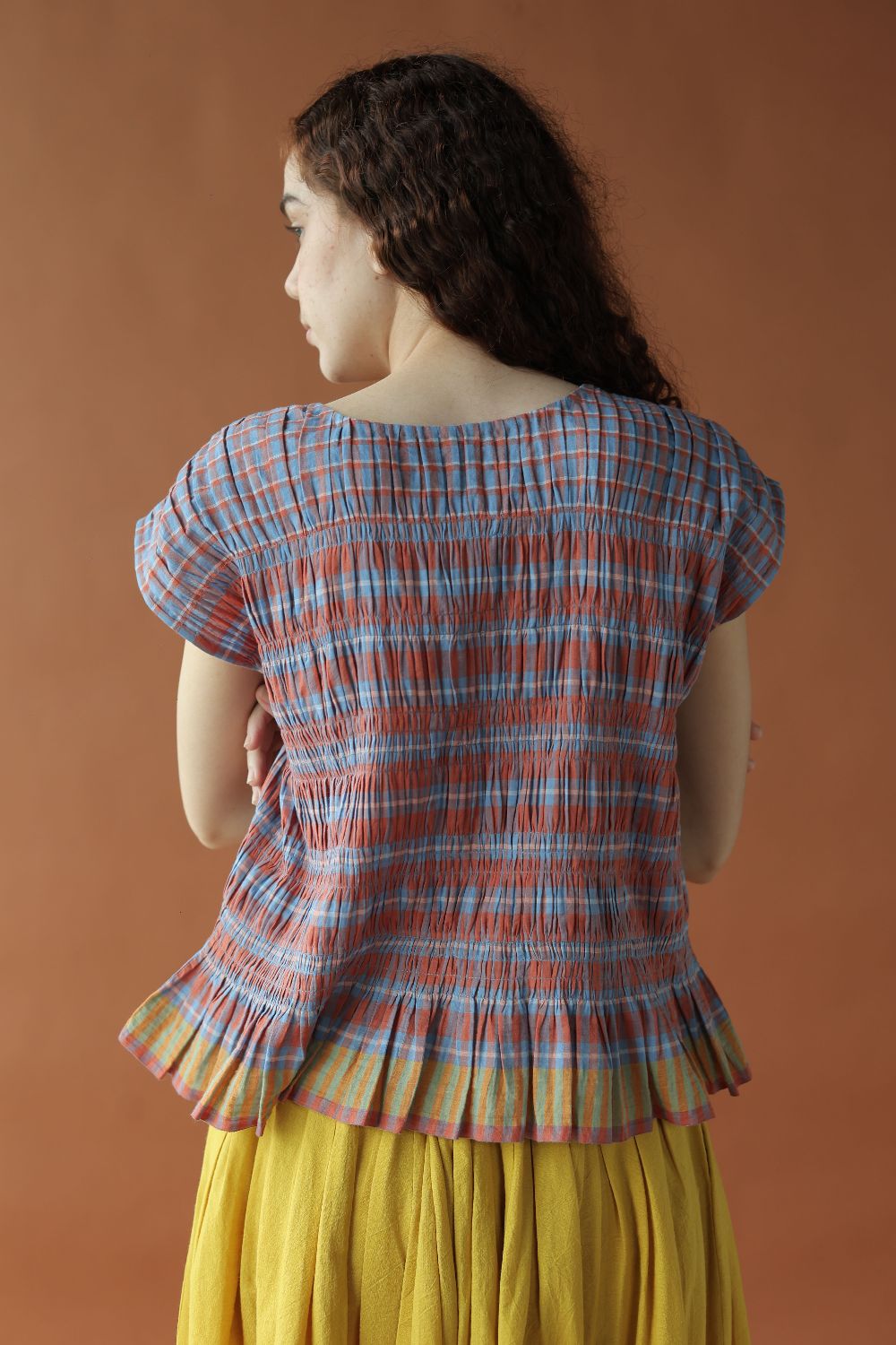 A fun and feminine top with shirring that creates a soft, gathered silhouette that cinches your body just enough to flatter it. The relaxed drop‑shoulder cut adds ease to it with the contrasting yellow selvage making it all fit perfectly together.