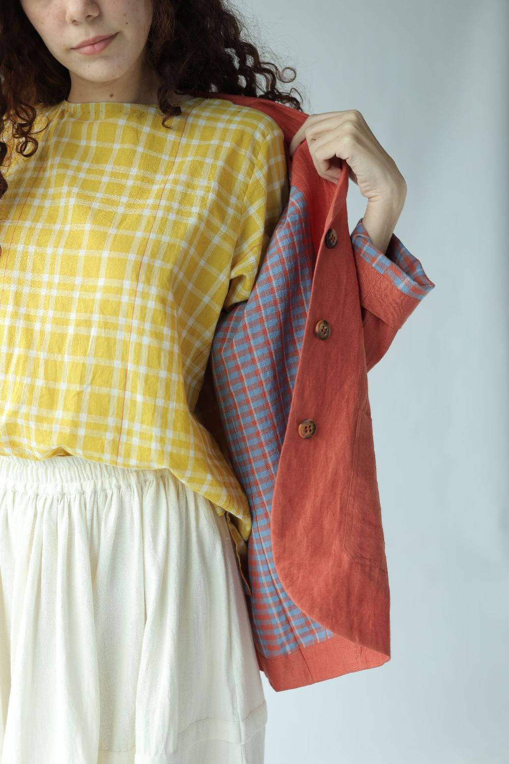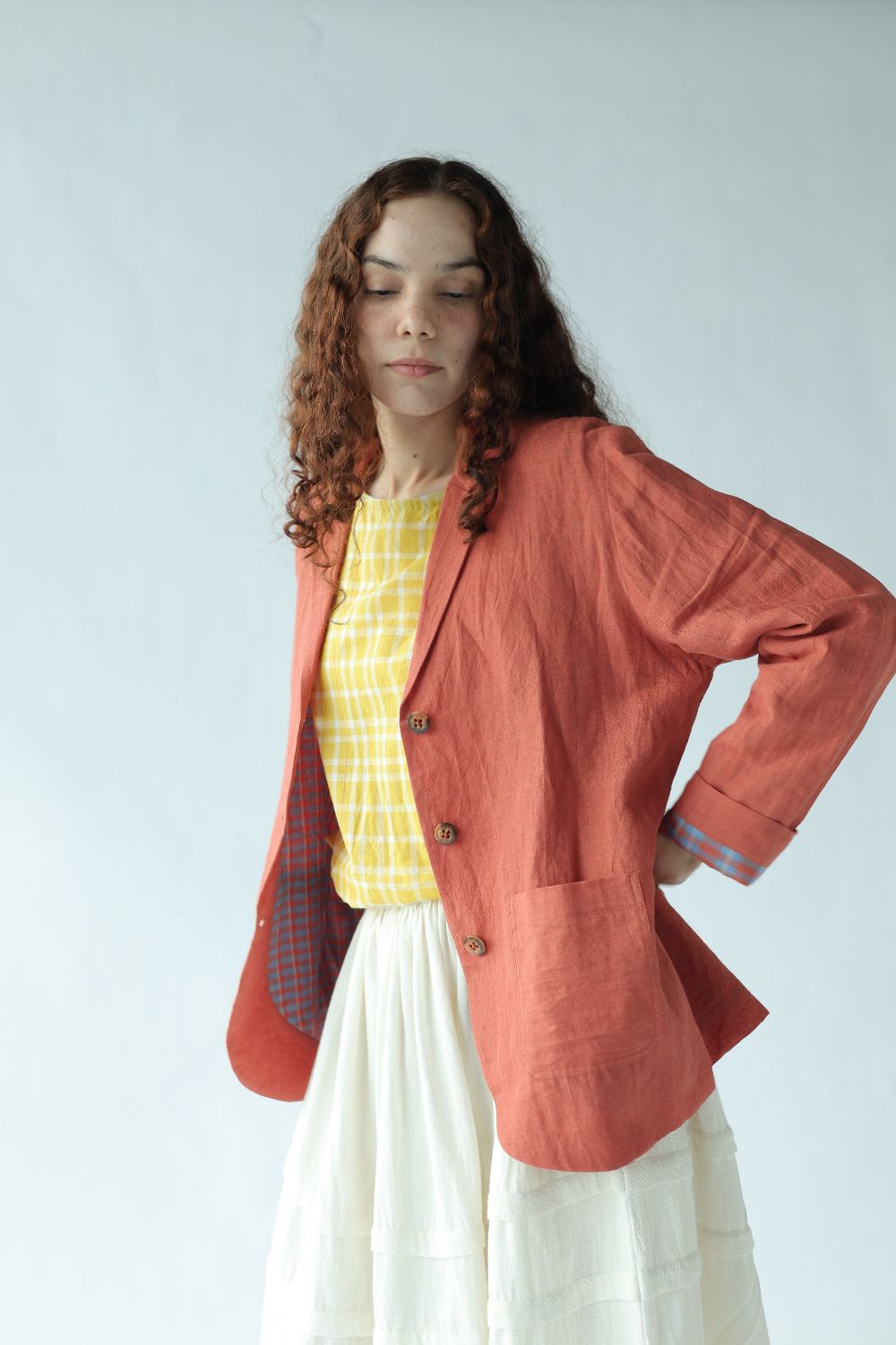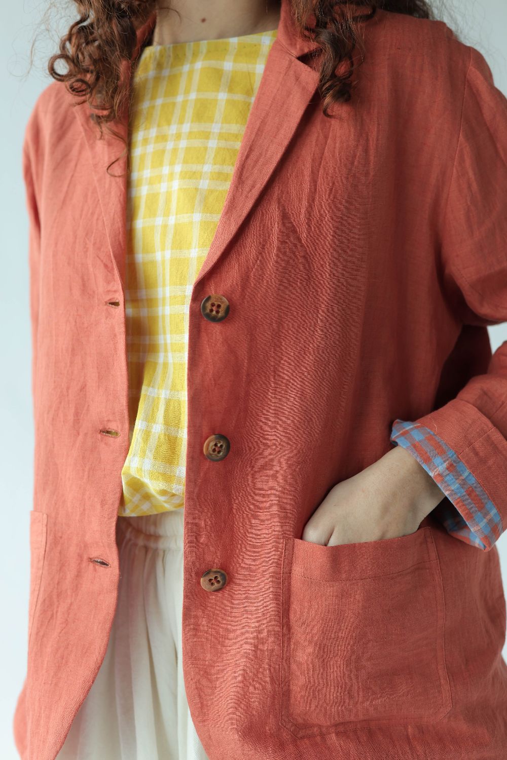 A classic day coat tailored using handwoven cotton linen, fully lined with contrasting red and blue checks. Finished with buttons to match and and patch pockets to hold pennies and flowers.