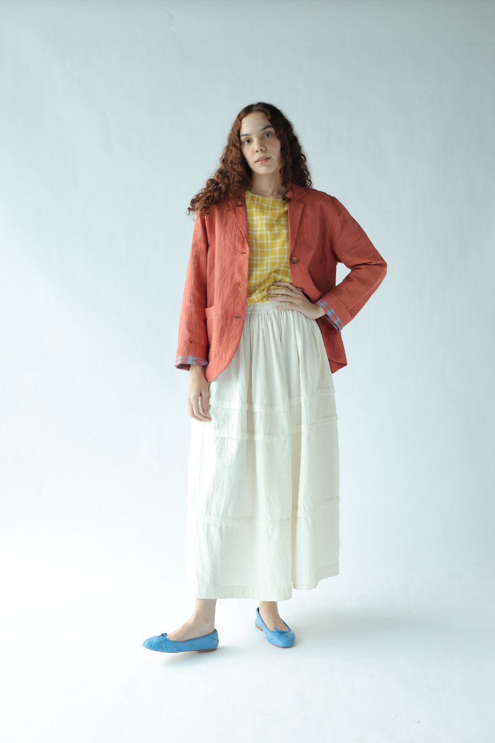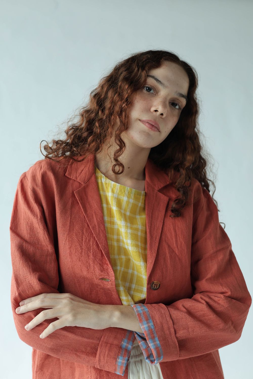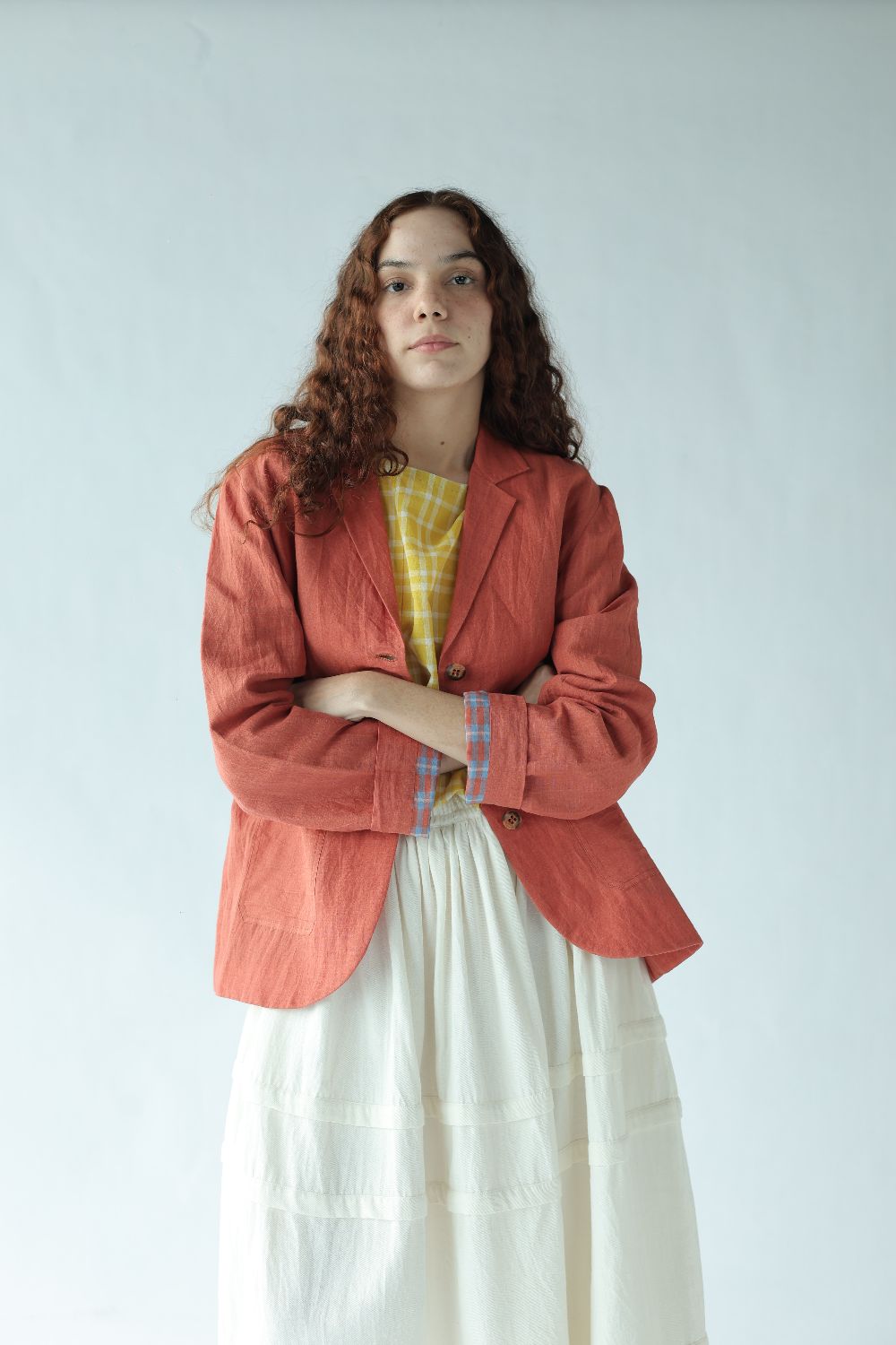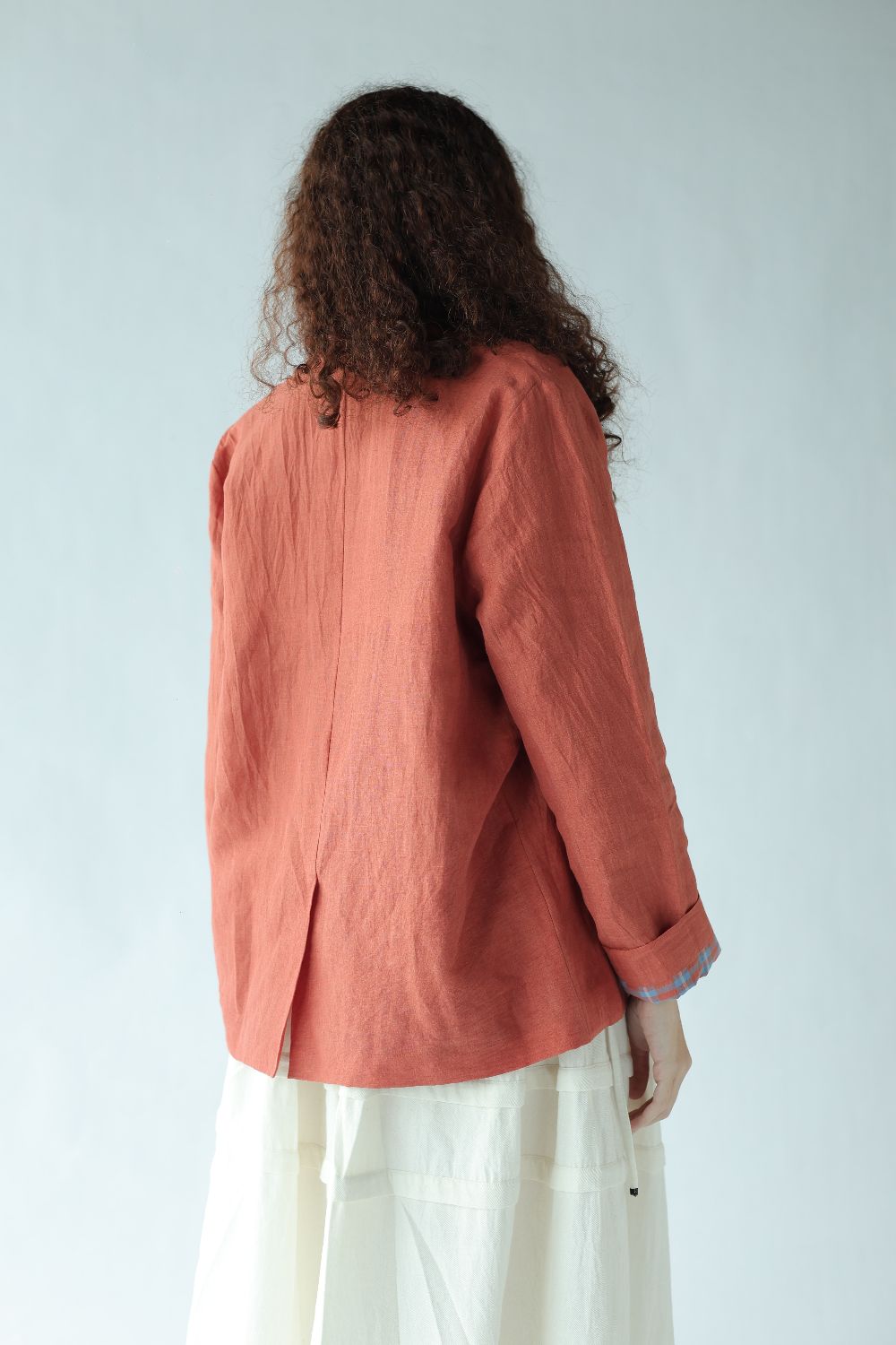 A classic day coat tailored using handwoven cotton linen, fully lined with contrasting red and blue checks. Finished with buttons to match and and patch pockets to hold pennies and flowers.