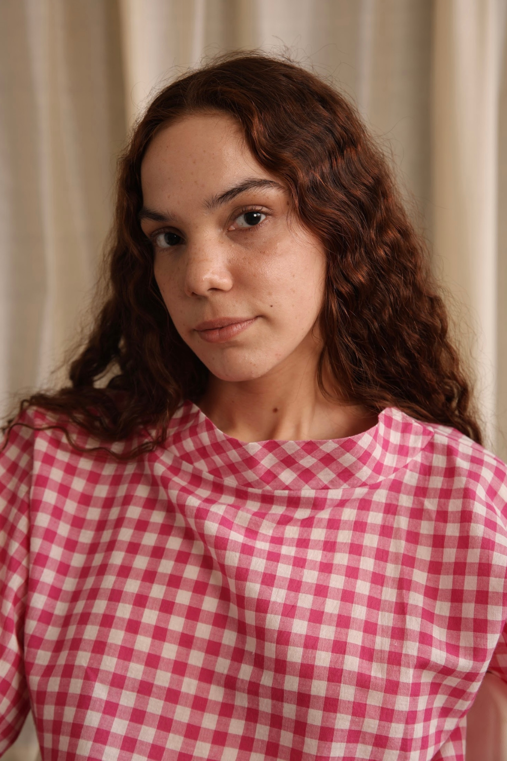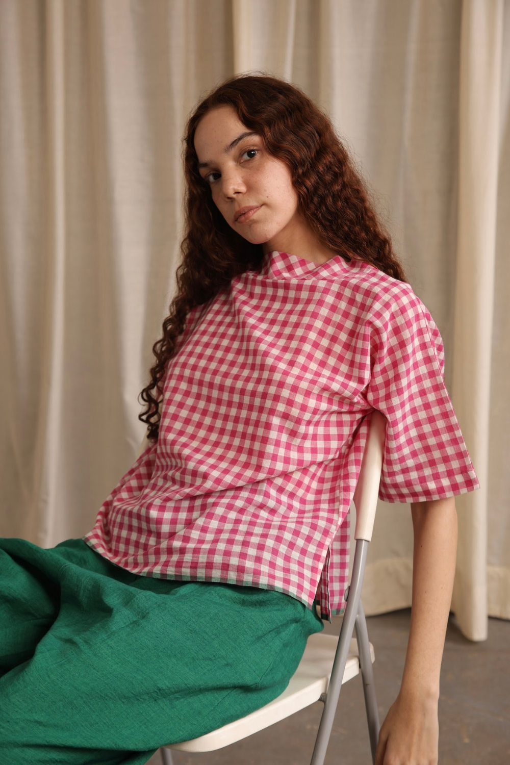 An exciting new summery textile in our classic box fit easy blouse with a stand collar, made in soft cotton, carefully woven by hand.