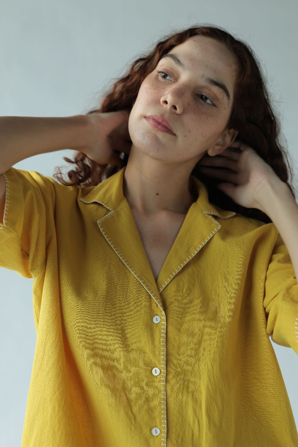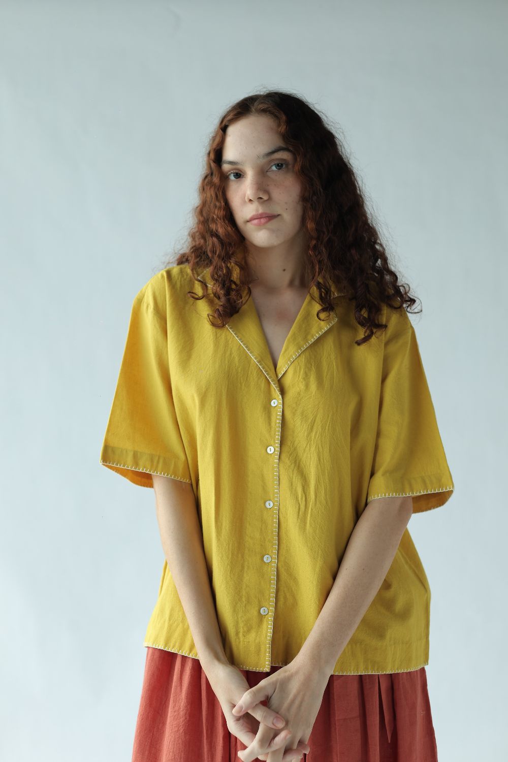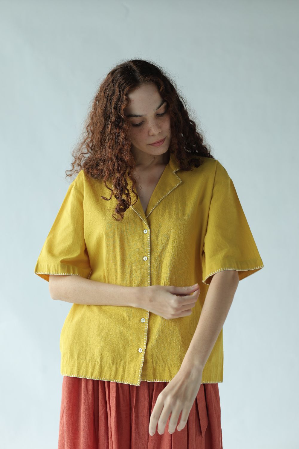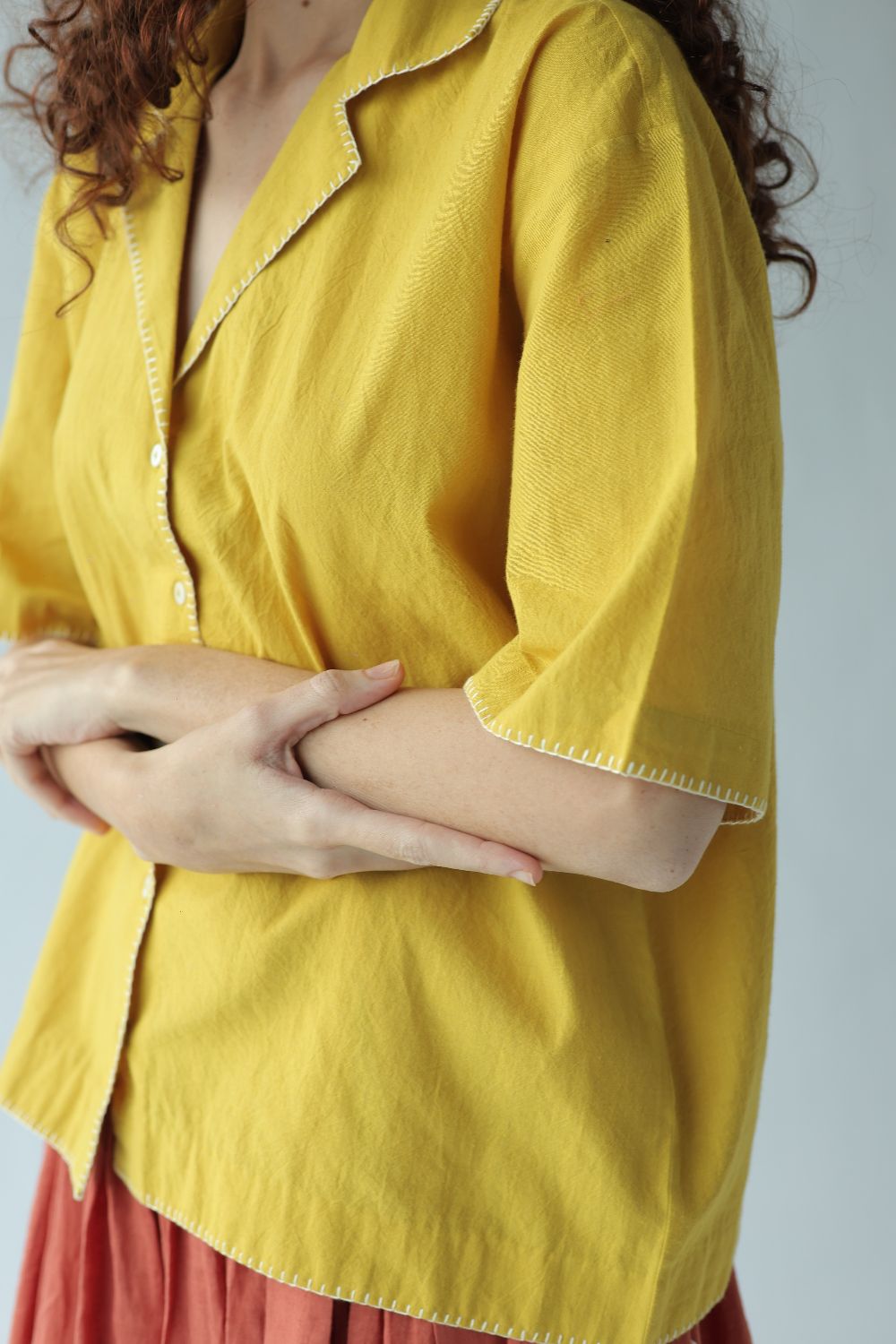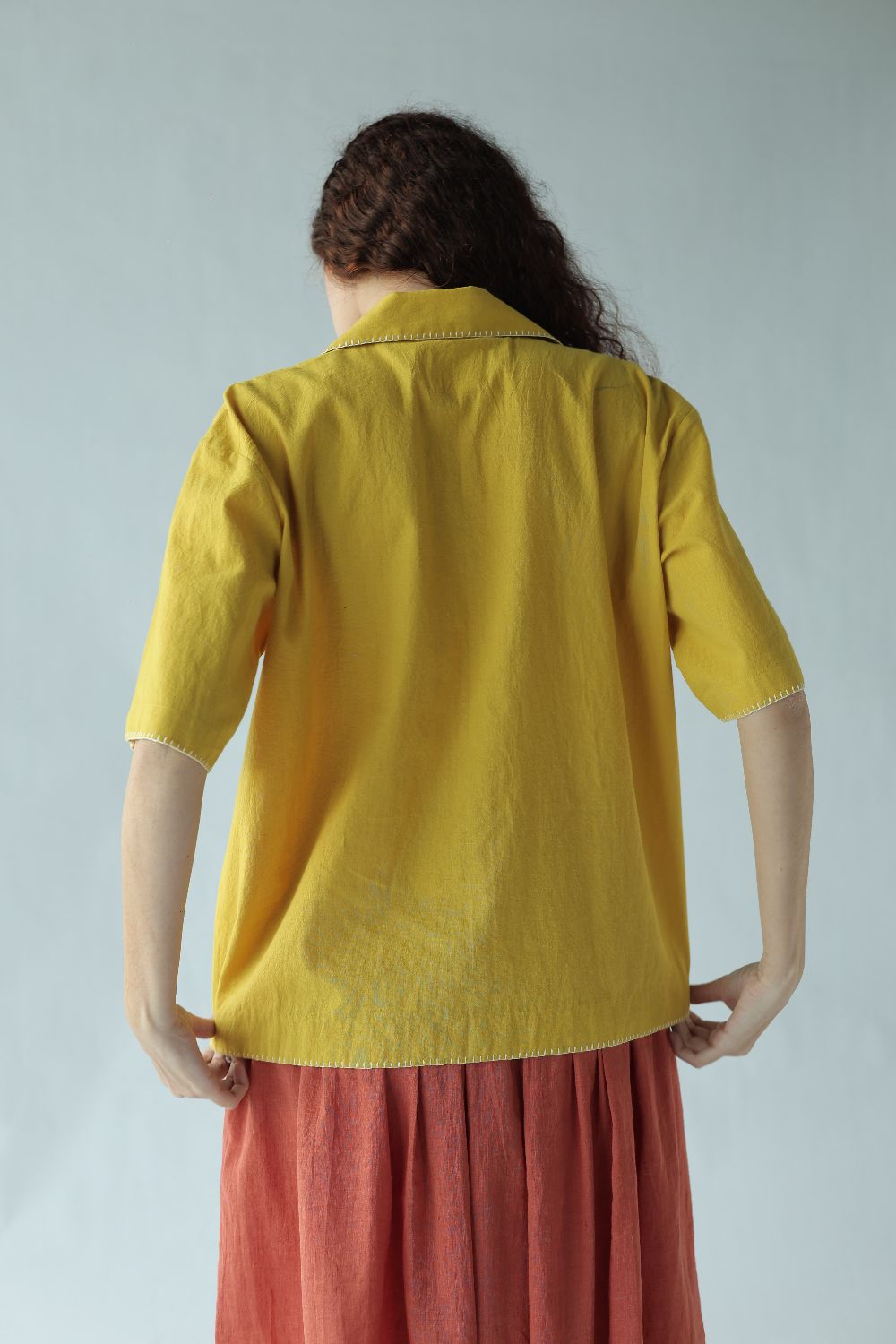 Kate' - A box fit short shirt with notch collar and half cut sleeves highlighted with blanket stitch done by the hand.
