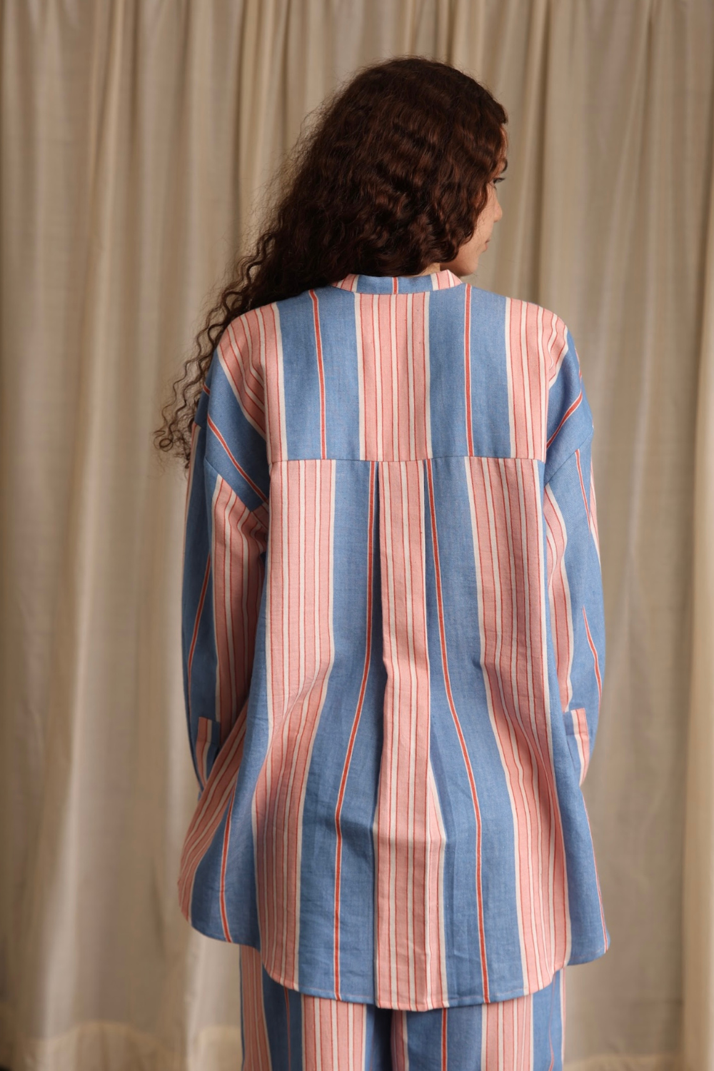 A vibrant, oversized cotton twill shirt, in a playful stripe, with minimal shell buttons and a Chinese collar.