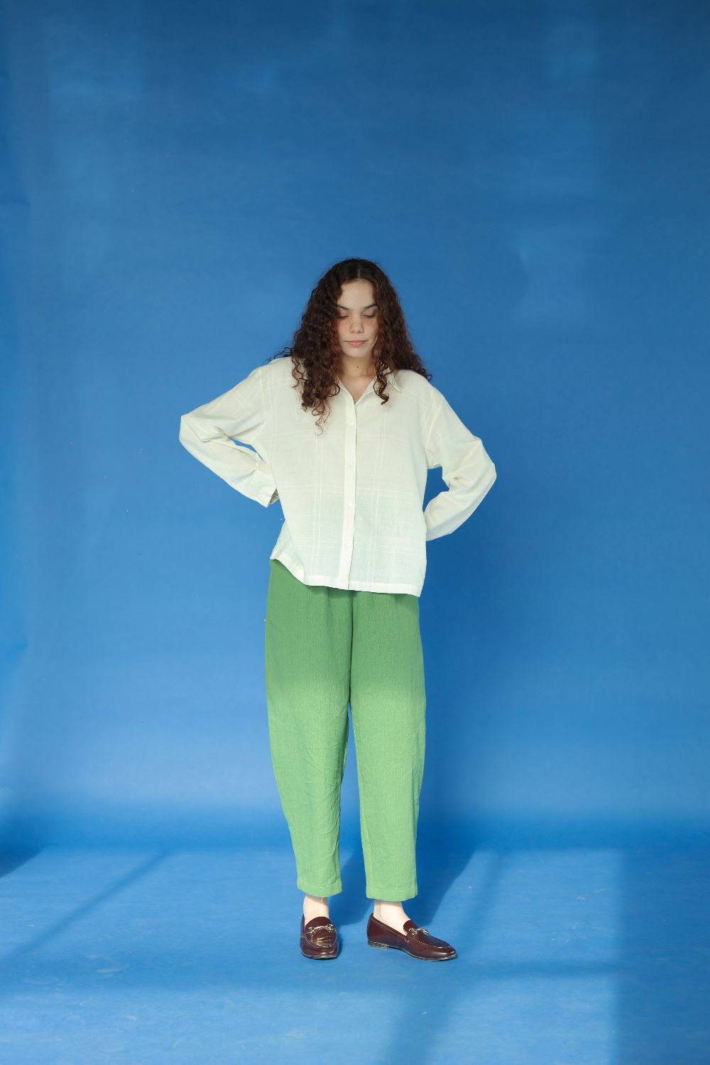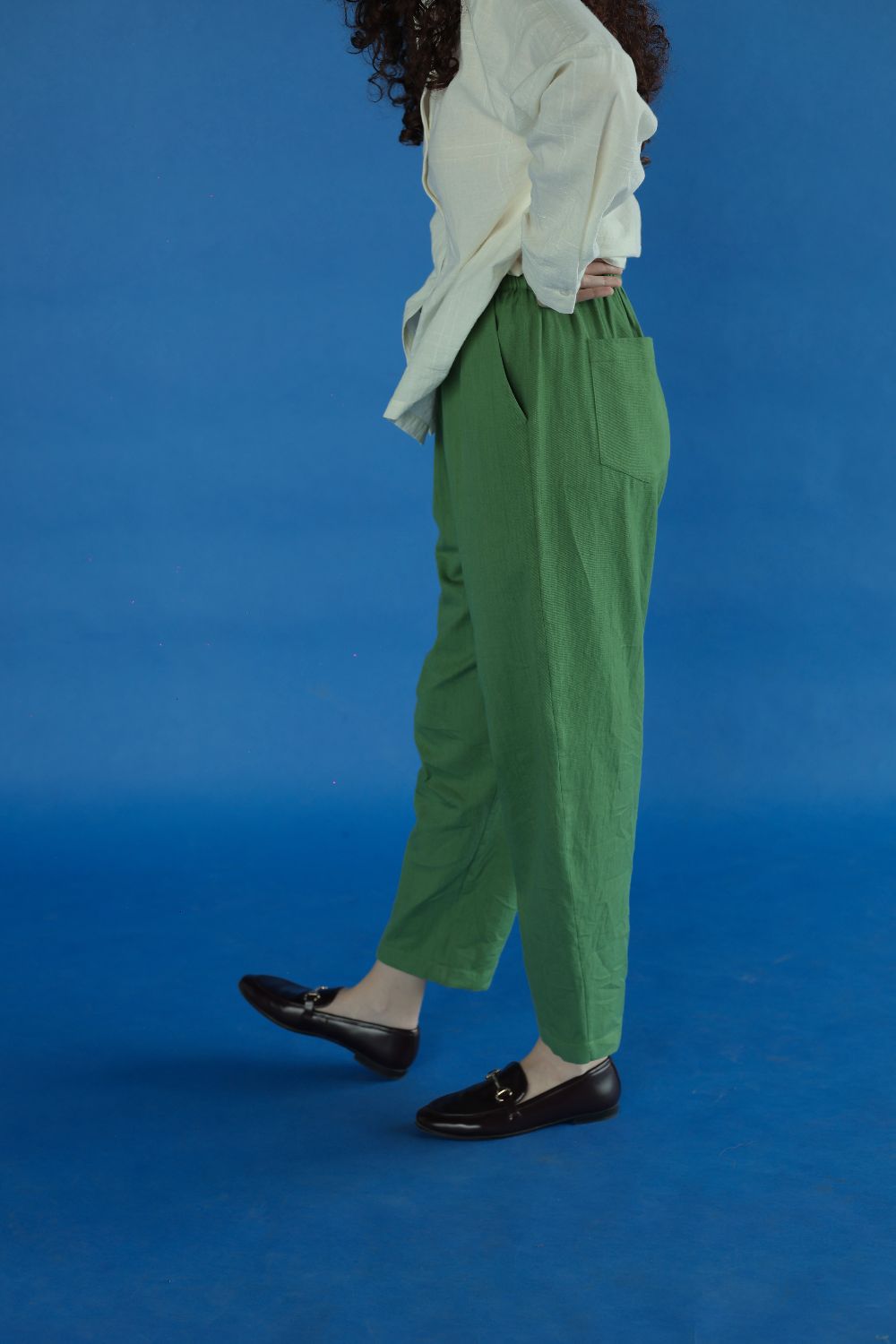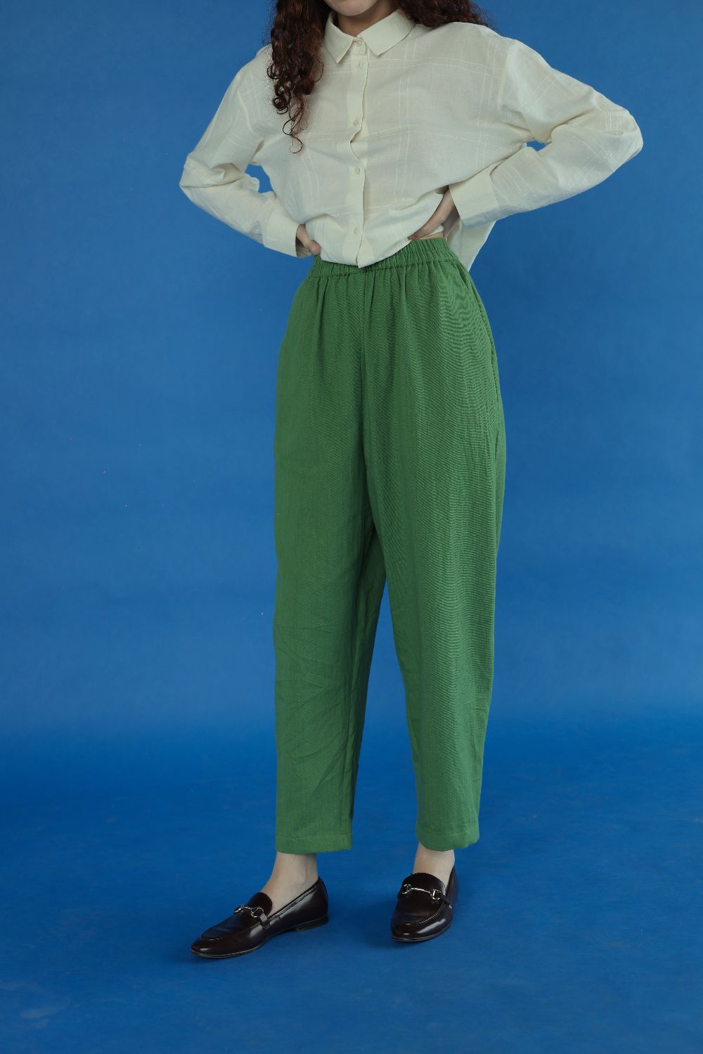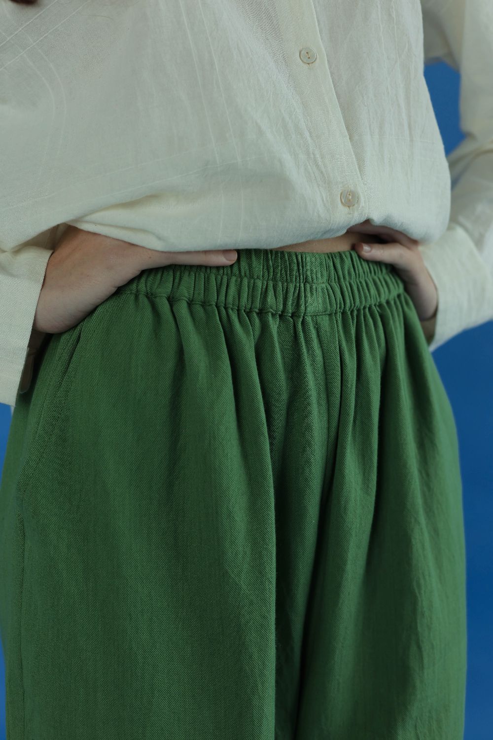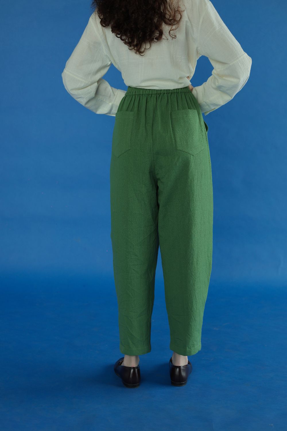 Cut in a vibrant handwoven cotton twill, here's a fun pair of pants, bold and comfortable. Come with a fully elasticated waistband and back pockets.