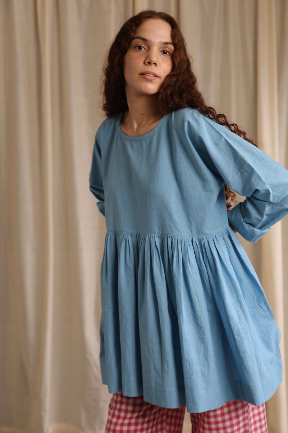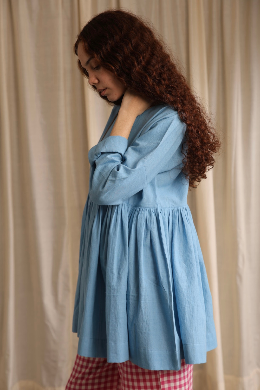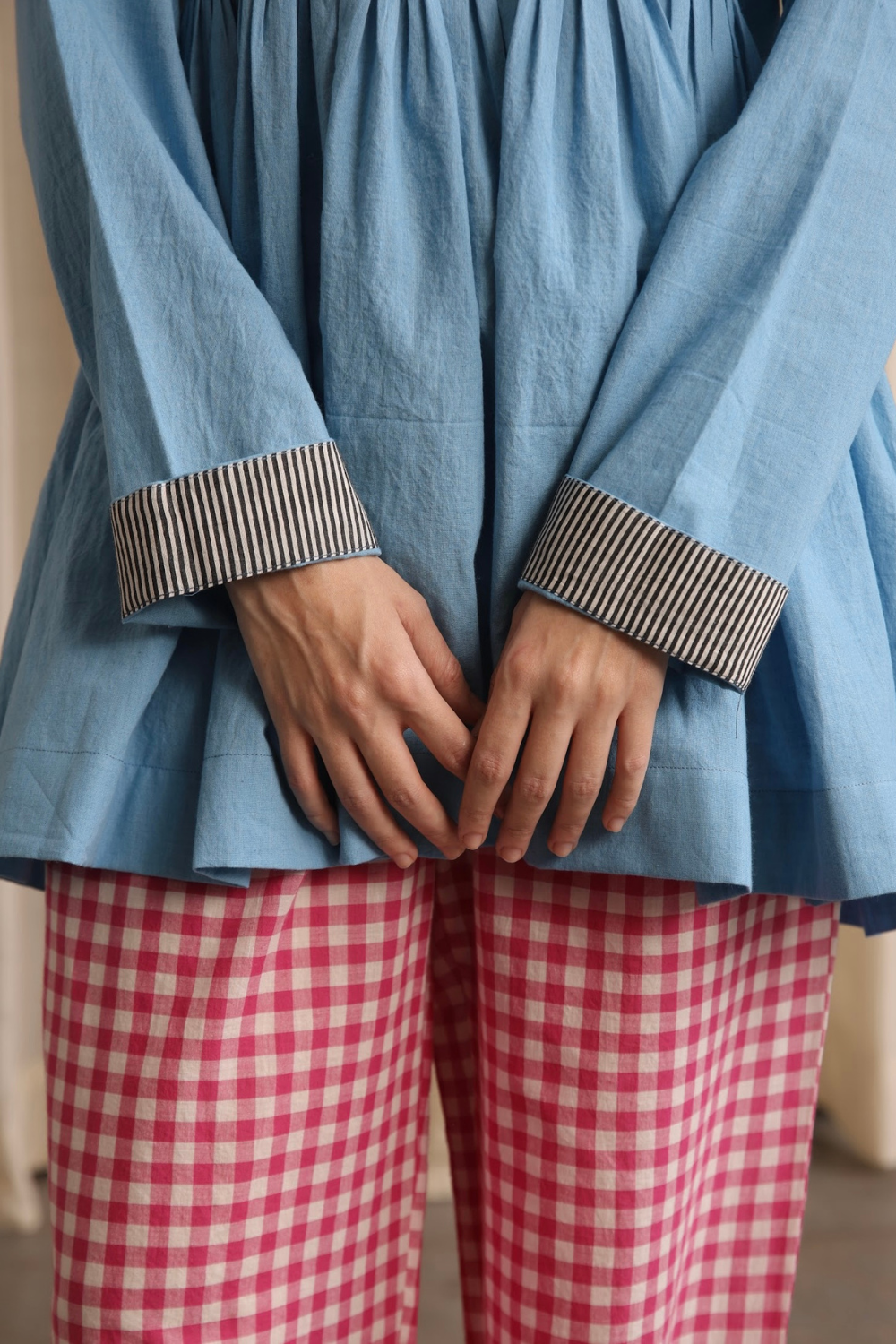 Elegant and refined, this full-sleeve top in soft cornflower blue features delicate hand hemming around the neckline and a contrasting cuff on the flip side, adding a subtle yet striking touch.