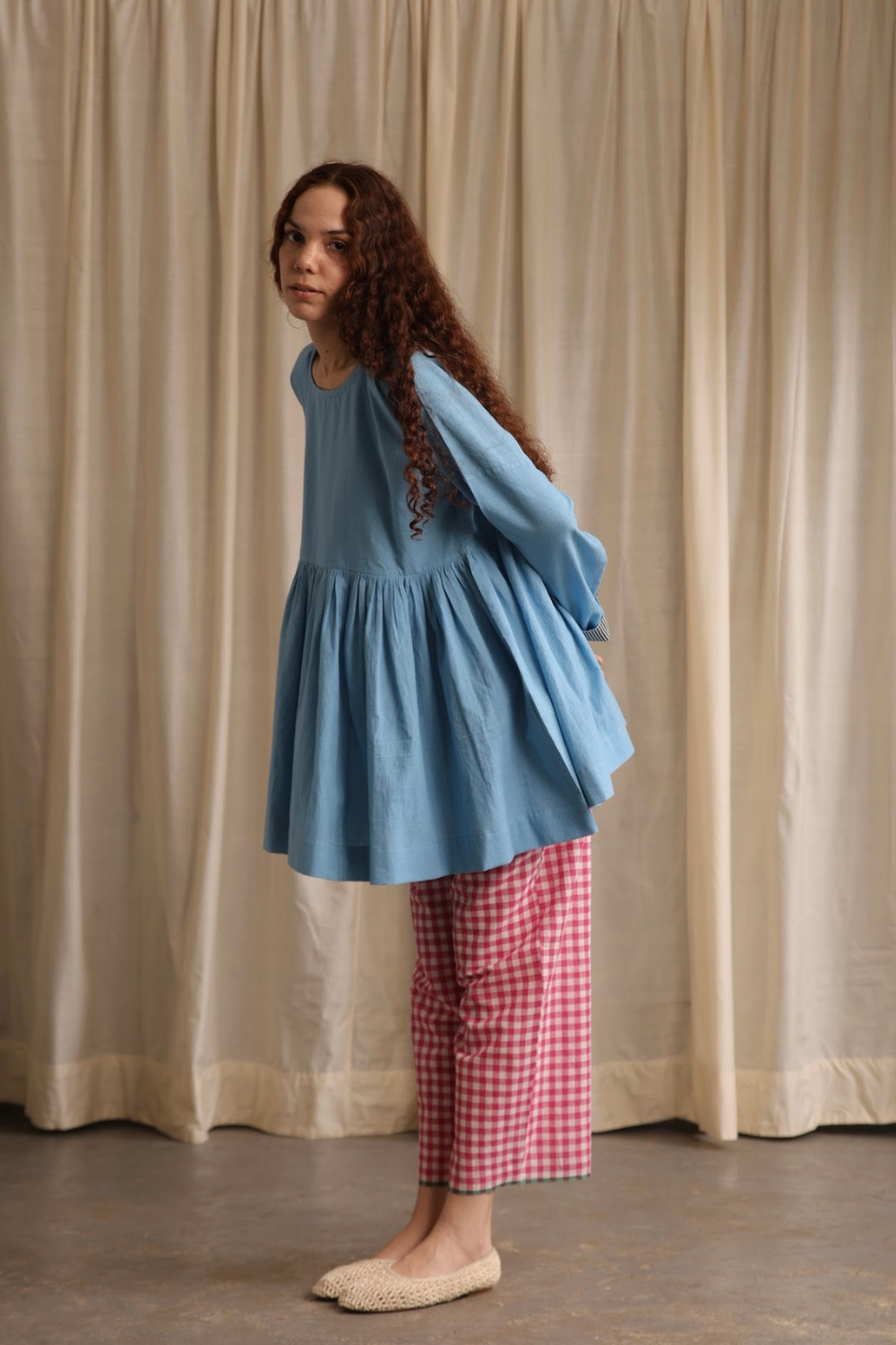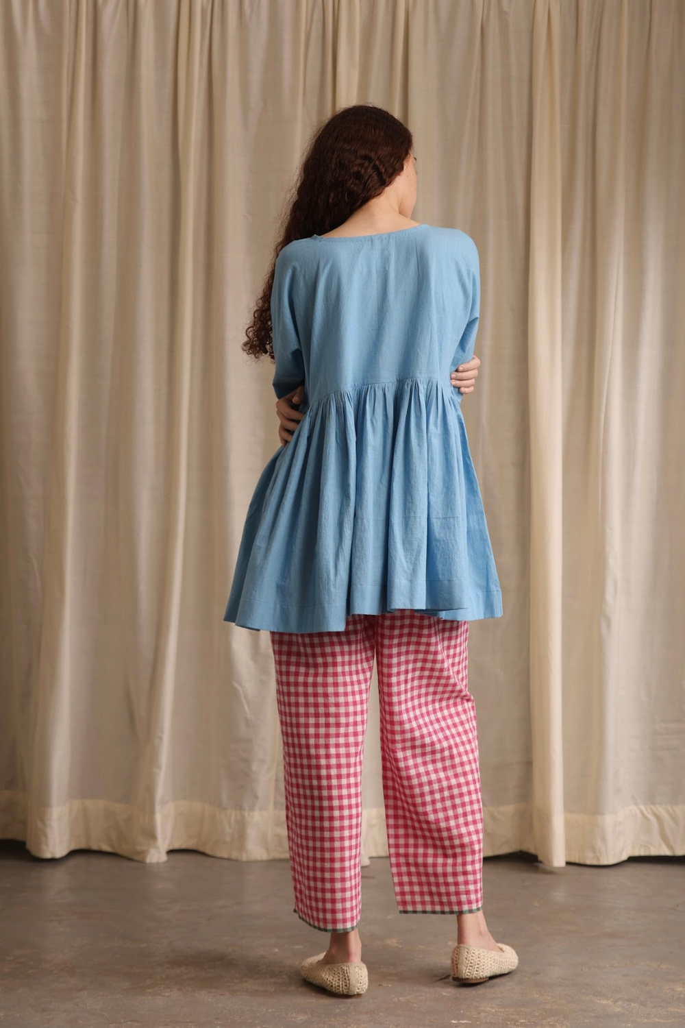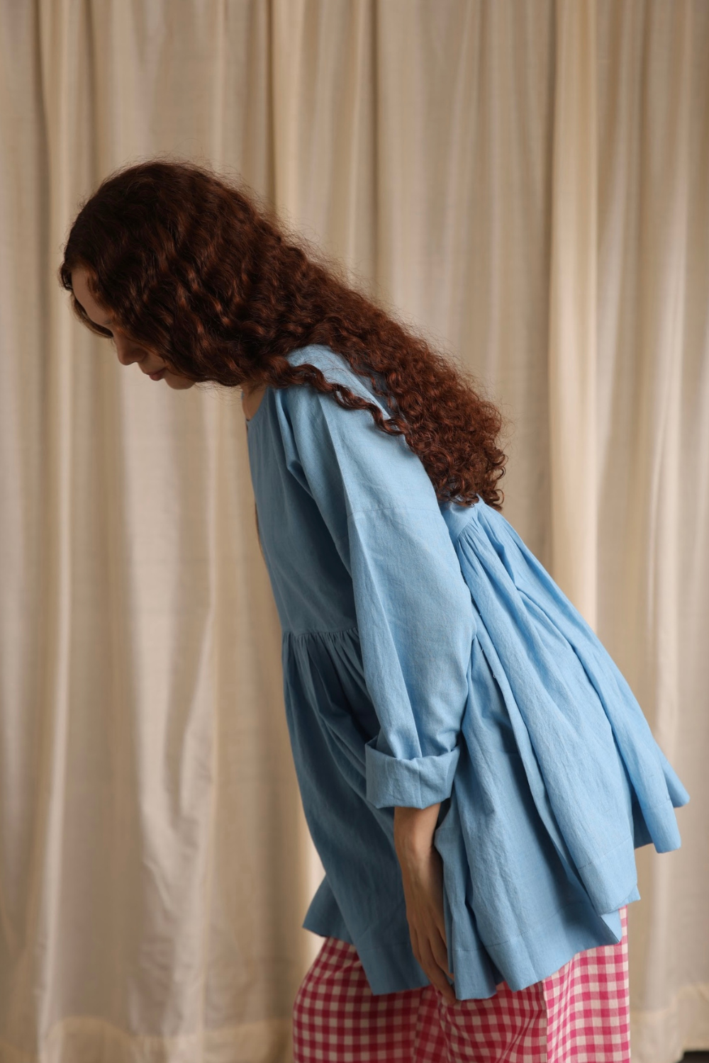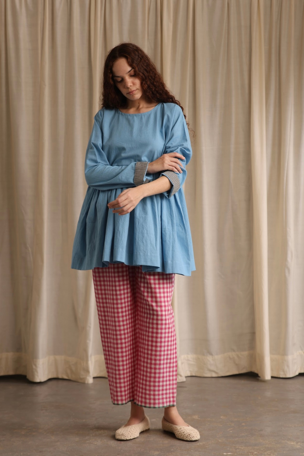 Elegant and refined, this full-sleeve top in soft cornflower blue features delicate hand hemming around the neckline and a contrasting cuff on the flip side, adding a subtle yet striking touch.