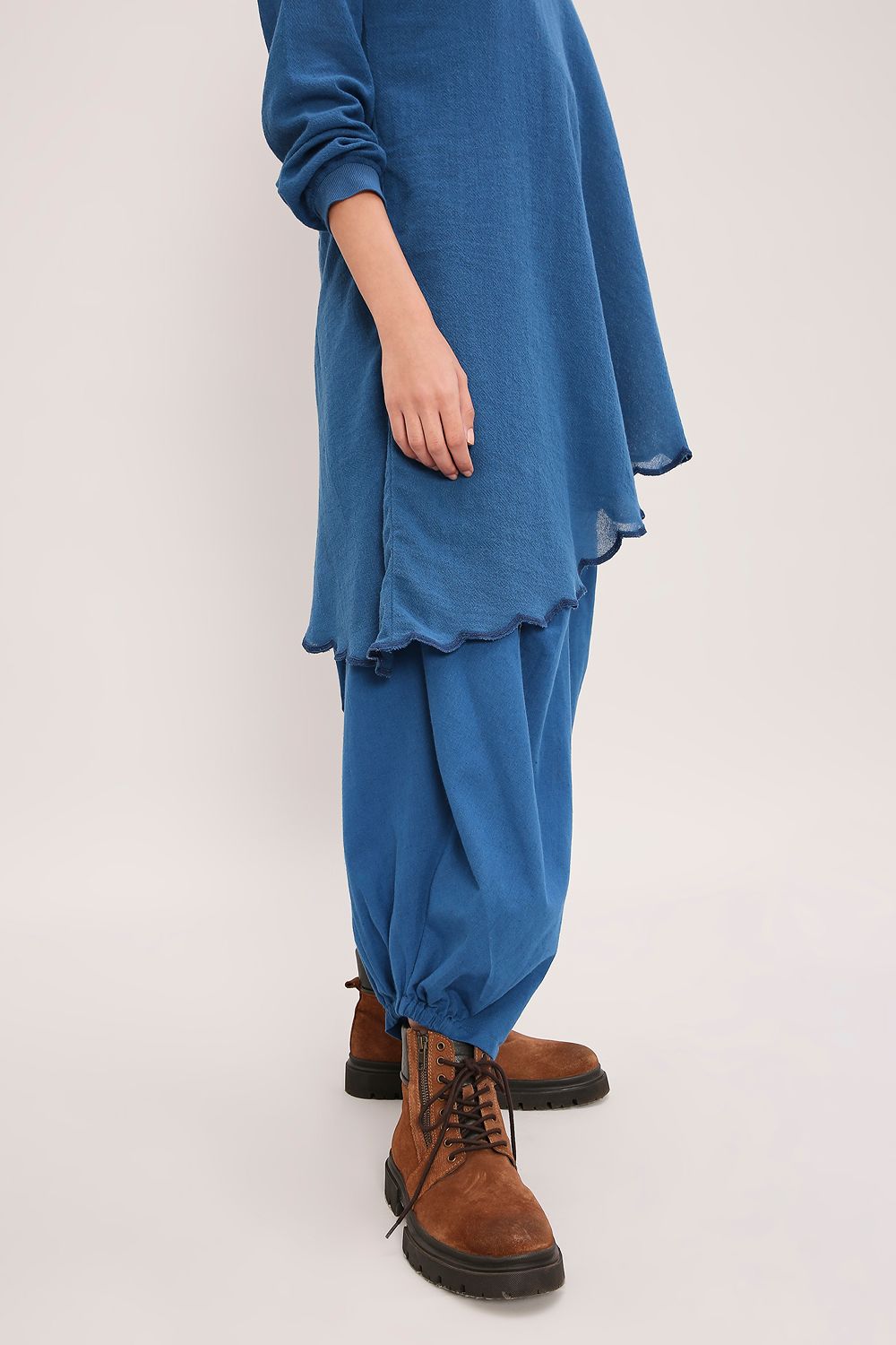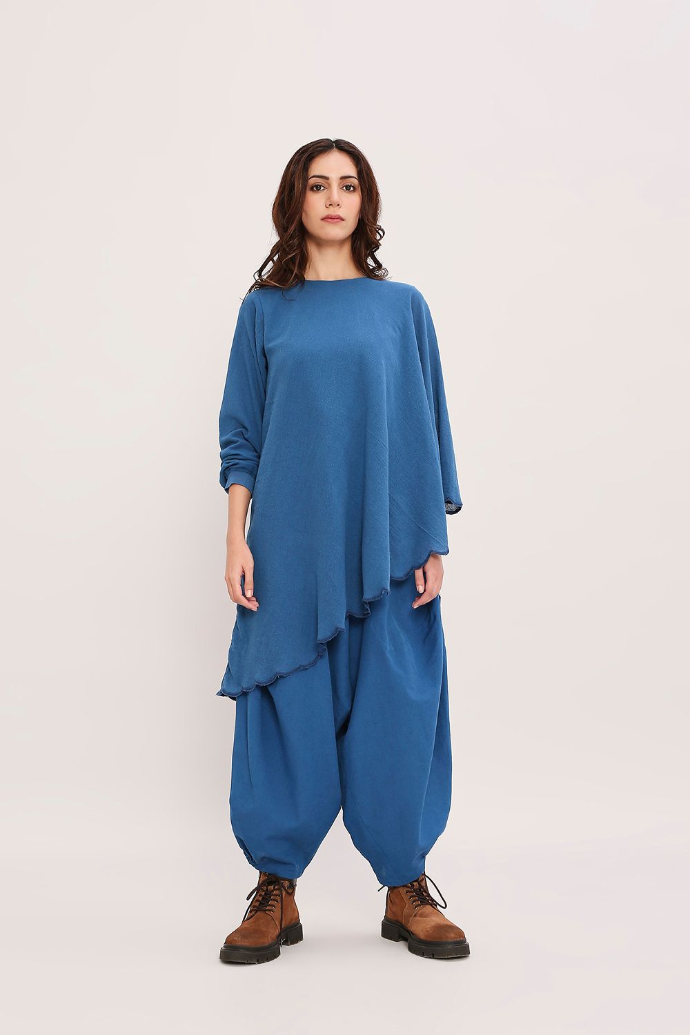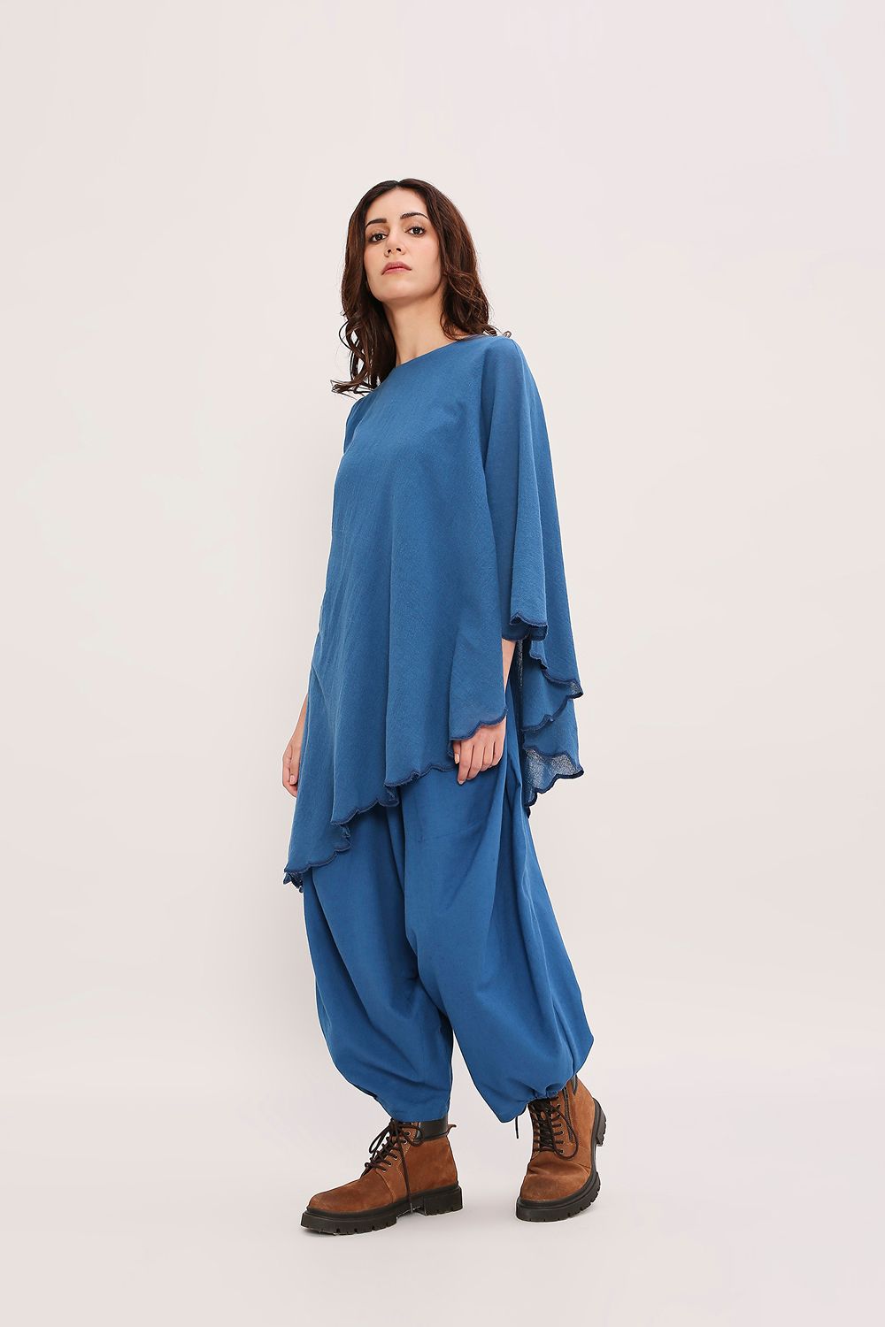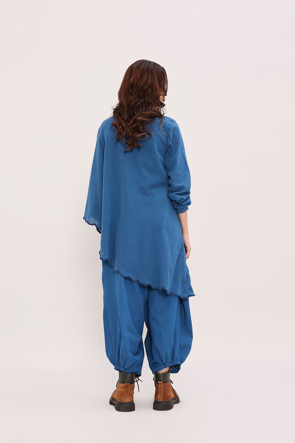 A coordinated set featuring an asymmetrical tunic in handwoven cotton with a flared sleeve,embroidered scallop edges, and a shoulder zipper opening.Paired with baggy pants,with an elasticated waist.