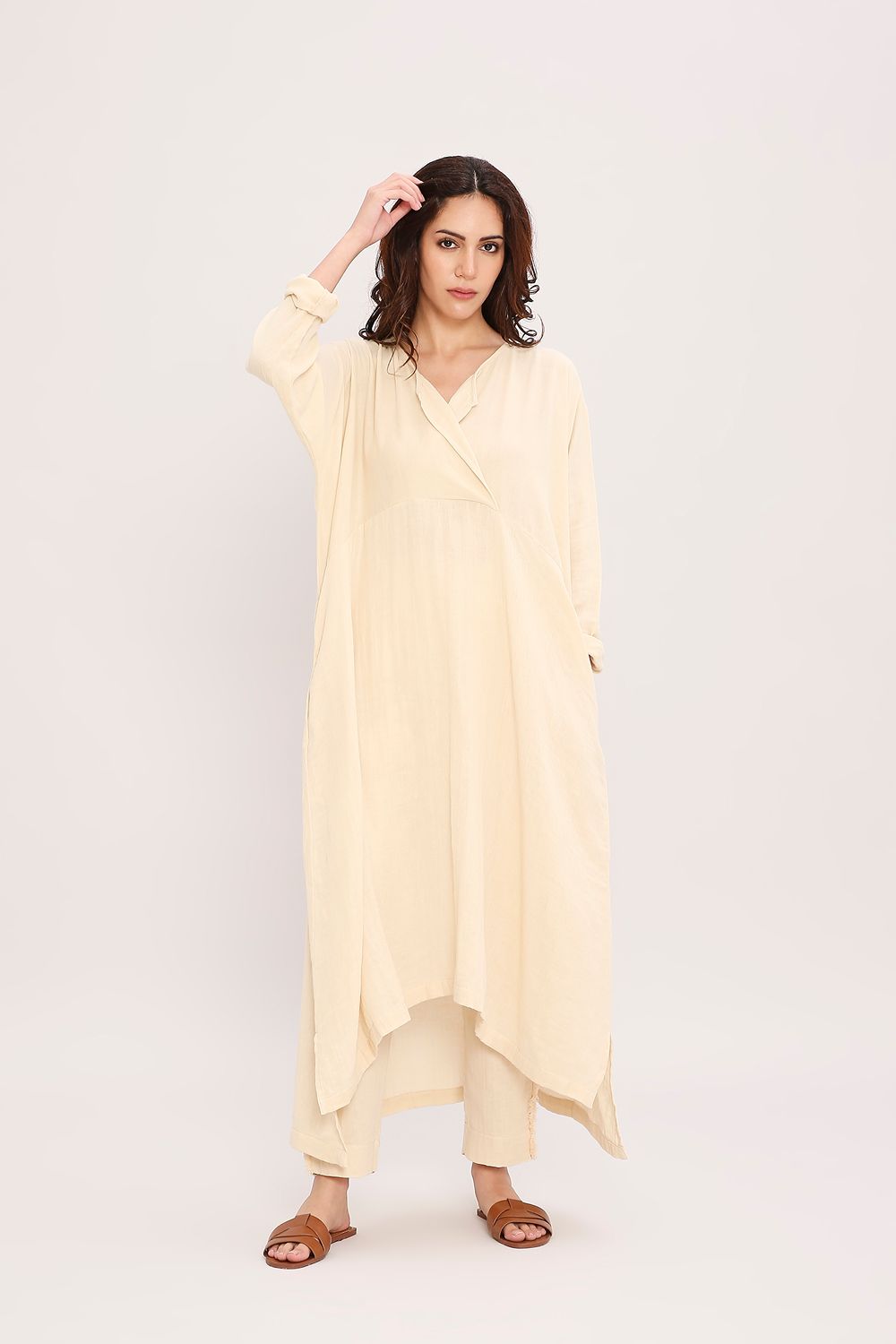 Easy & comfortable kaftan stylle tunic made in soft crush cotton with side pockets. Team with our tassled pants from this collection to complete the set.