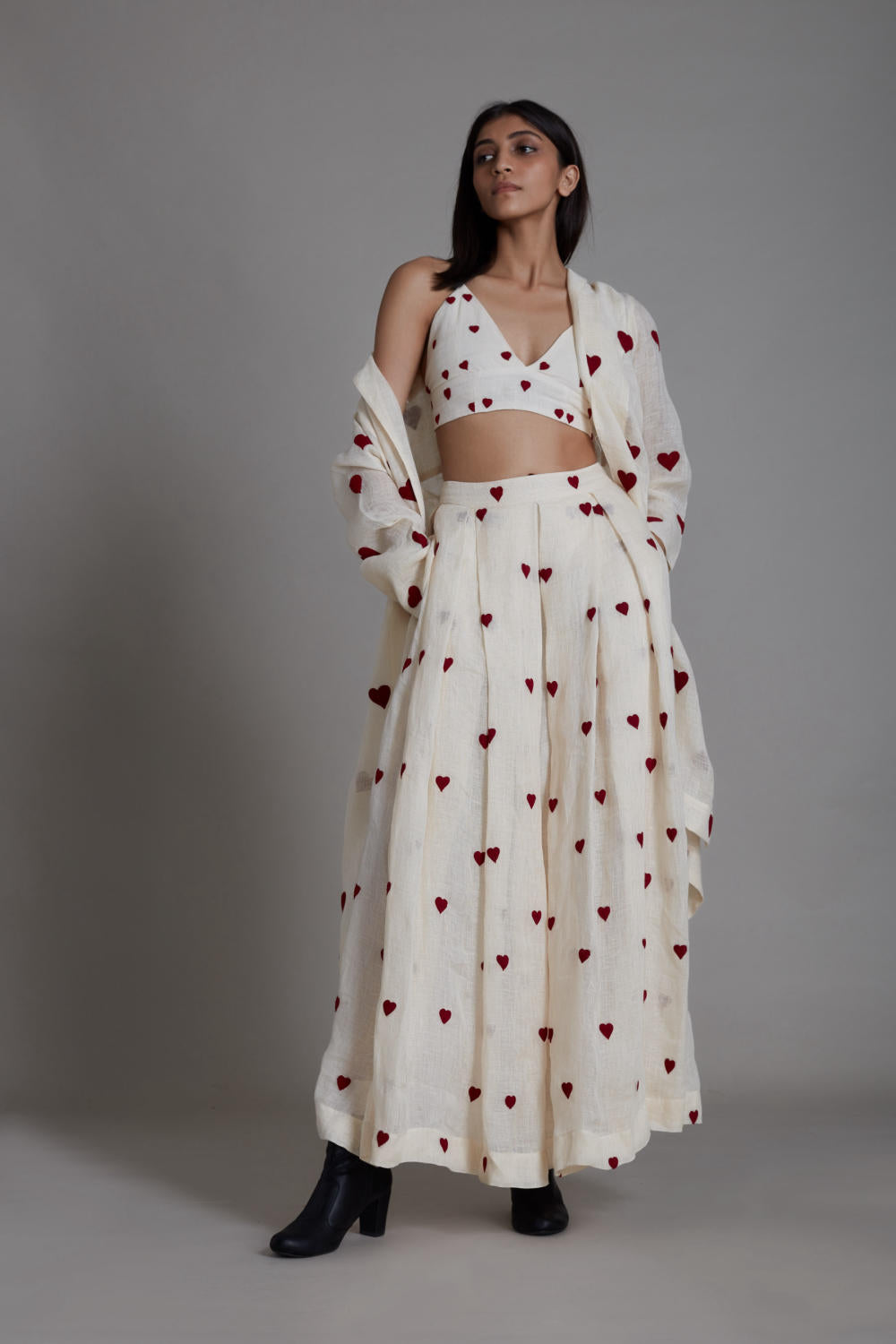 An interesting and modern take on the traditional lehenga set. The bralette, lehenga and scallop stole are made in pure linen with intricate all-over thread embroidery. You can even style it with a cover jacket from our collection for a complete festive look.