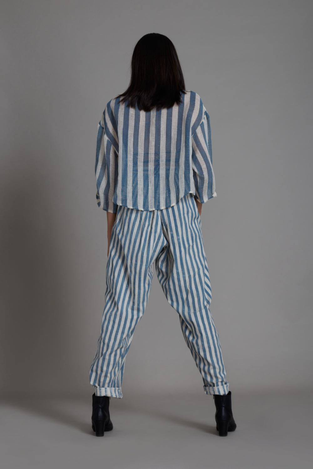 The high-waisted balloon pants are hand-block printed with side pockets and back elastic. The crisp linen shirt with hand block print and hand applique with intricate card thread embroidery. This versatile co-ord set is a perfect fit to rock any occasion. (SET OF 2, SHIRTand PANTS, handwoven matching cotton bralette inner comes with the set)