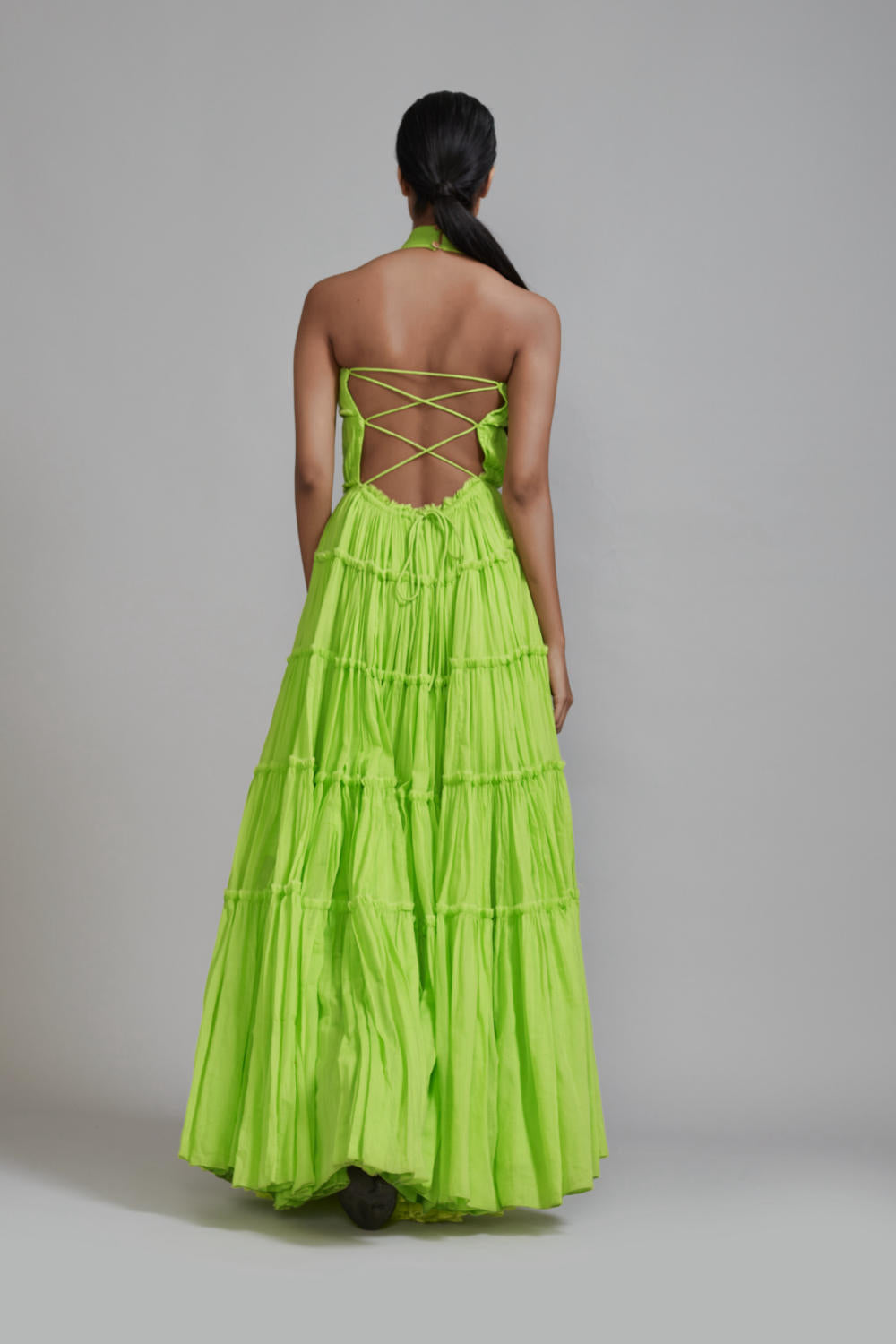 A mul-tiered gown with ribbed-neckline, tie at the back and side Pockets