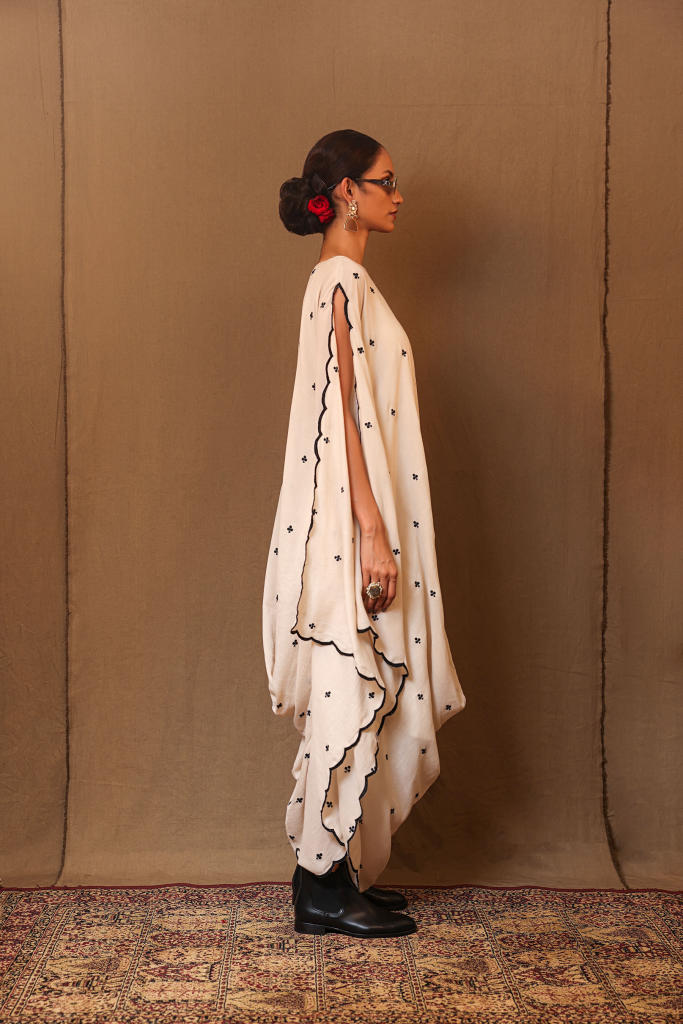 Cowl draped dress in handspun cotton fully embroidered with scallop edges. Comes with a matching stole and a long inner. Total 3 pcs