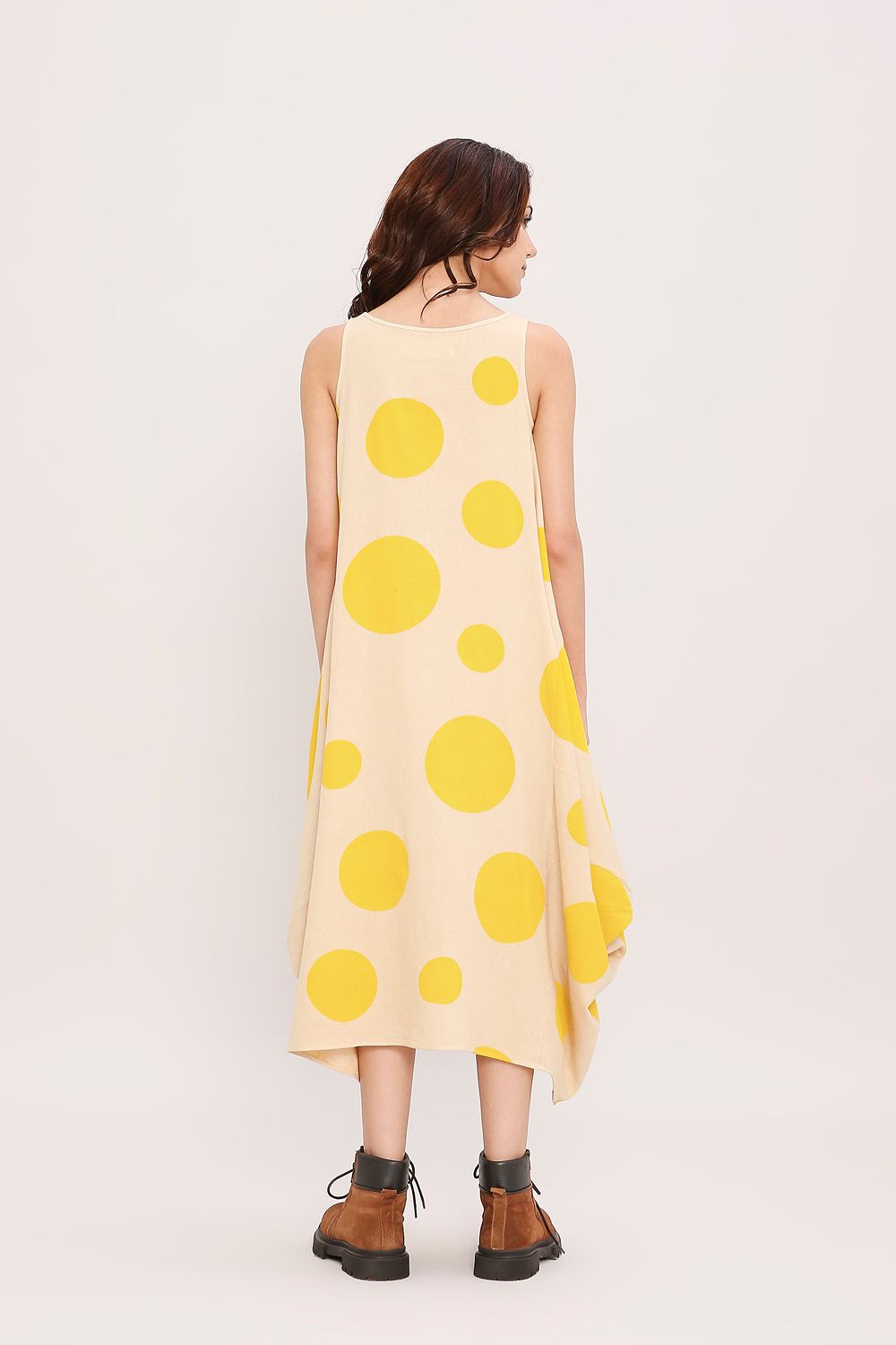 Our classic side cowl dress with a boat neckline makes a subtle yet striking statement, featuring handblocked polka dots all over. A perfect blend of effortless drape and playful detailing.