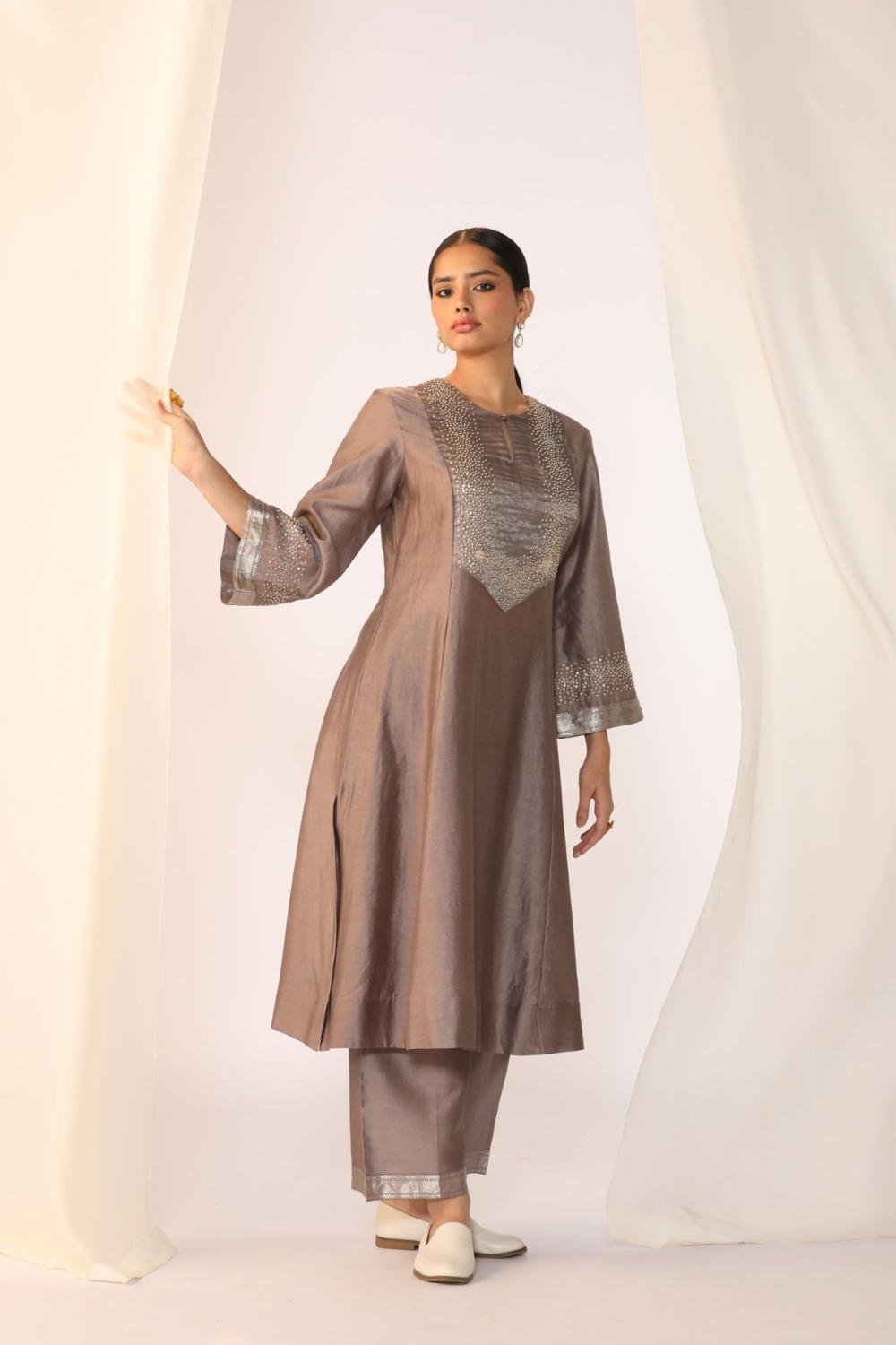 SilkChanderi kurta featuring unique French knot embroidery on the neck yoke and sleeves, paired with tailored pants.