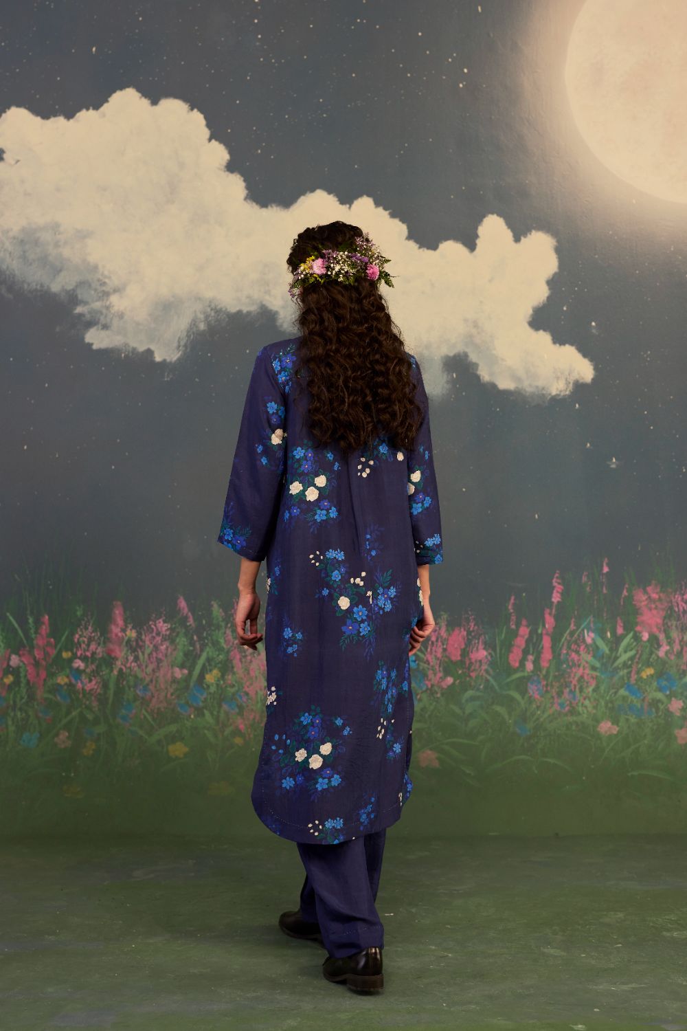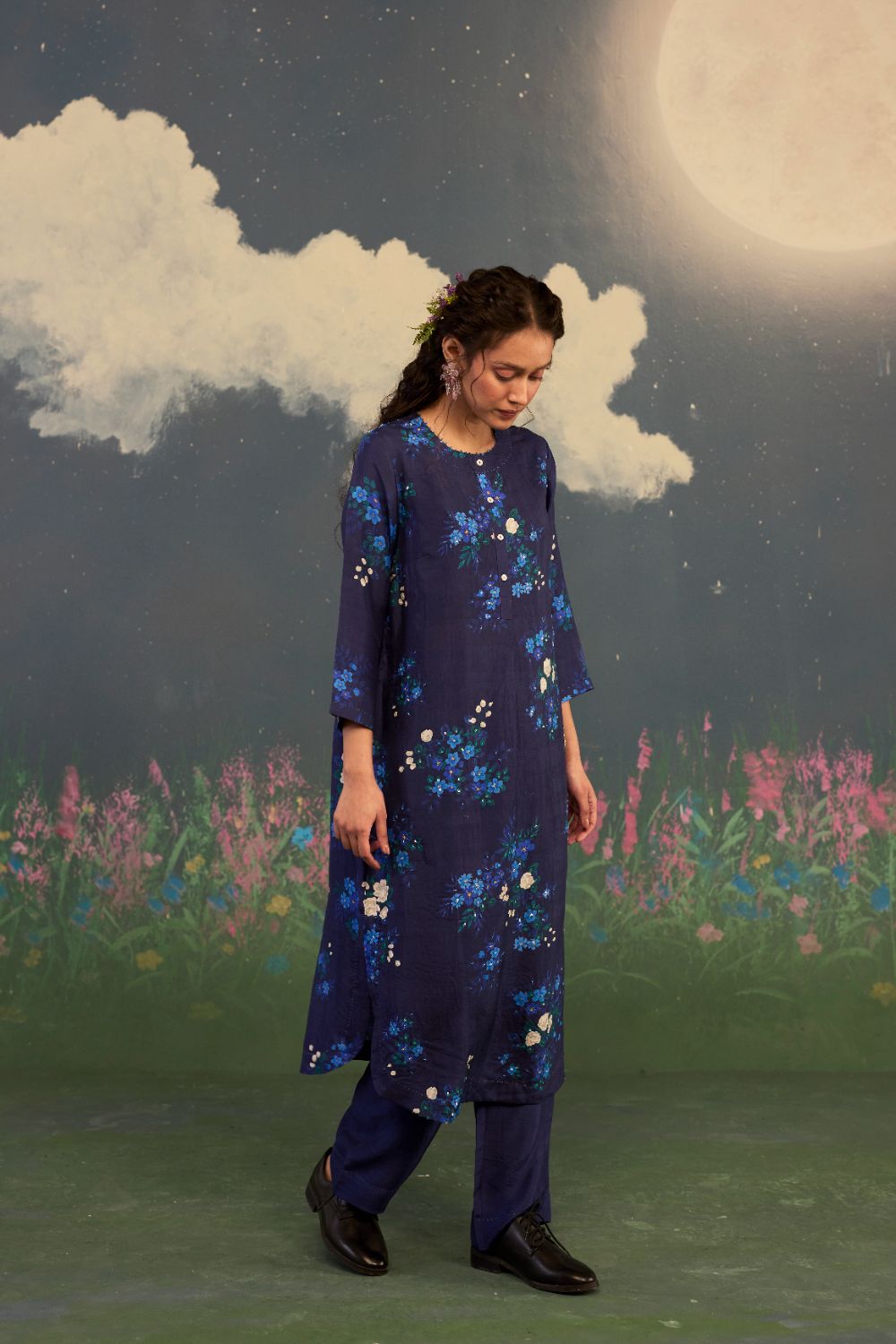A fascinating midnight blue long kurta set in handwoven mulberry silk with an intricate hand-embroidery on kurta, is inspired by the Morning Glory. A flower known for its poetic bloom at daybreak. It celebrates renewal, grace, and the gentle unfolding of a new beginning. The deep backdrop acts like a night sky just before sunrise. Intricate hand embroidery on the kurta front intensifies the flower’s pastel radiance and allowing each bloom to glow with quiet luminosity. Glass beads on neckline, hand hemming and hand-stitched edges adds a distinct individuality.