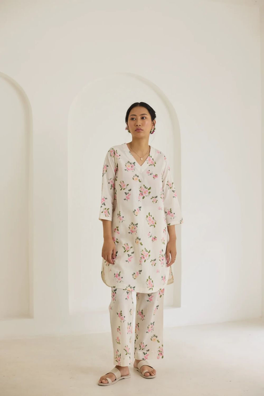 Model is 5 feet 6 inches tall and wearing a size small. Kurta Length 35 inches. Pant Length 36 inches.