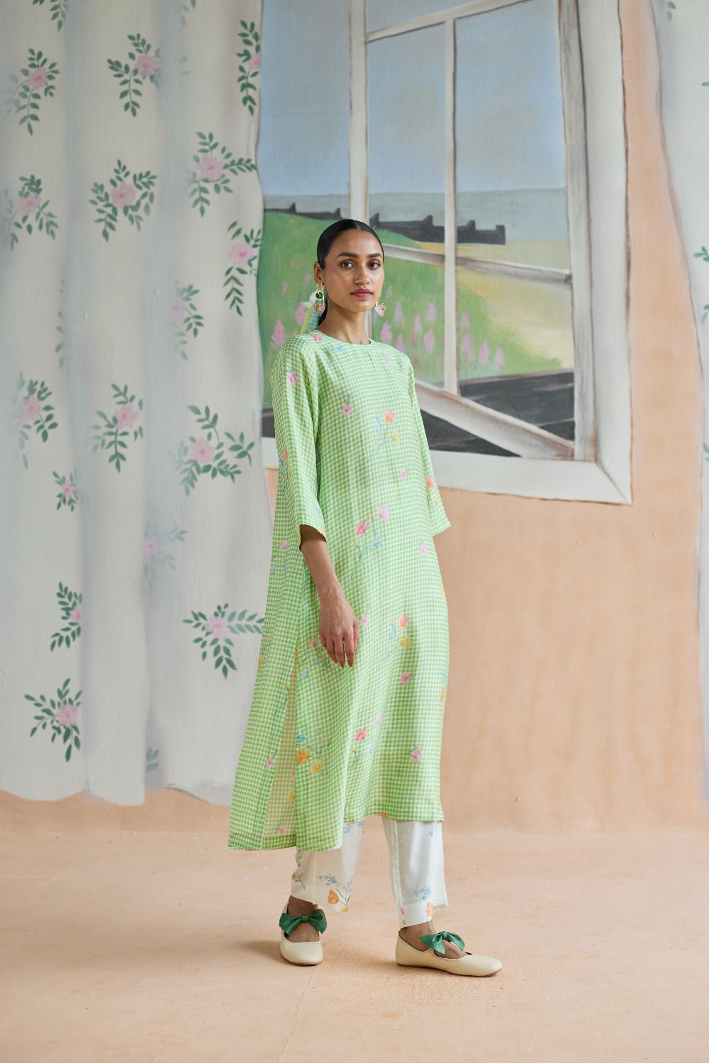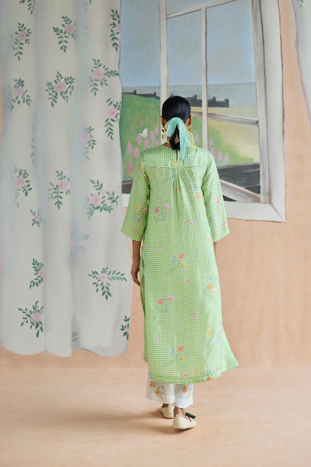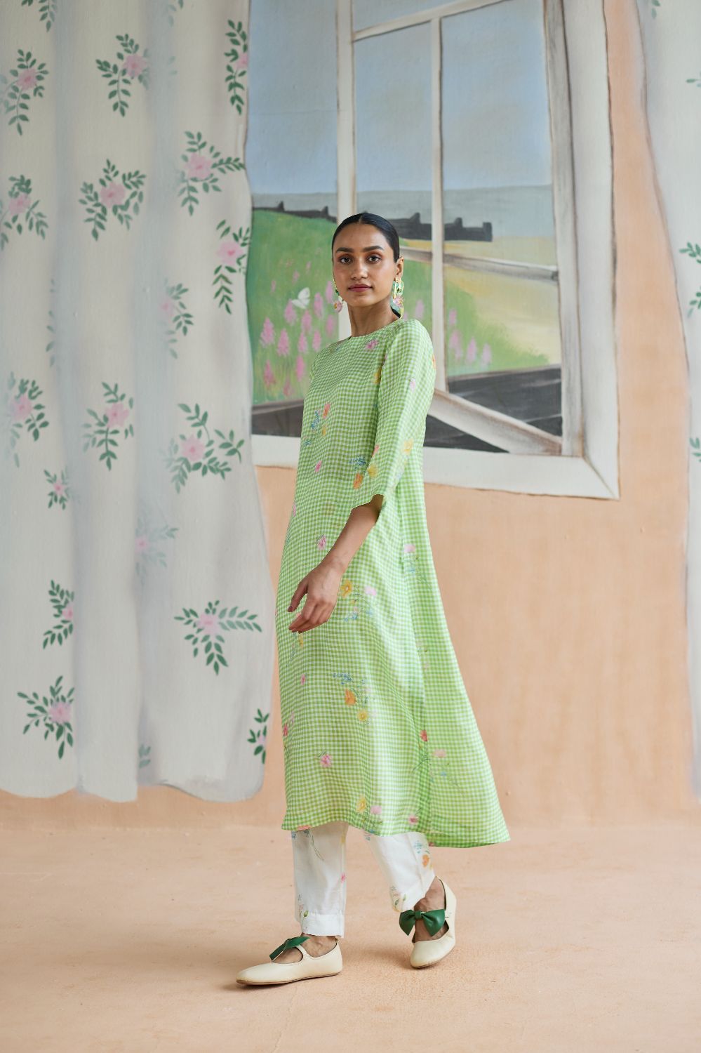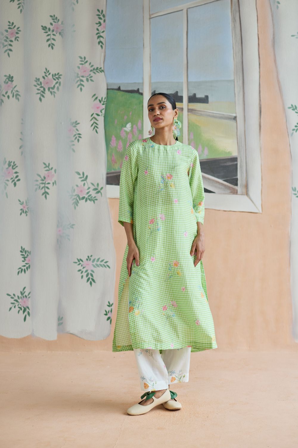 Green Checks and mallow flower long kurta set in handwoven mulberry silk alludes to a romance of checks with mallow flowers from Kashmir Valley. A reimagined classic checks with a poetic twist. Gathered blooms appear almost alive in contrast to the grid of checks. A relaxed fit, it offers ease and comfort while maintaining elegance. The kurta drapes fluidly, complemented by coordinating trousers that complete the look with grace. The model is 5 feet 7 inches tall and wearing size small. Dress Length is 42 inches