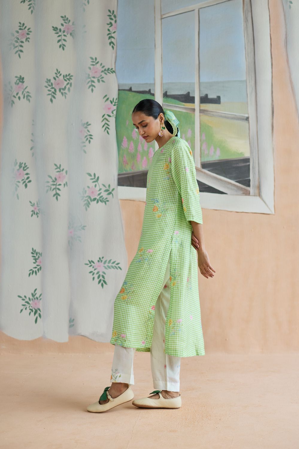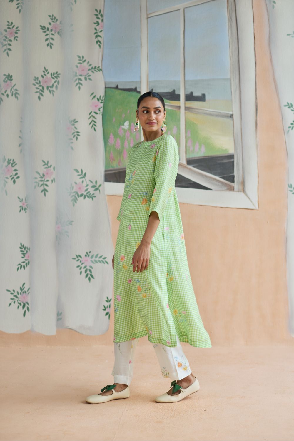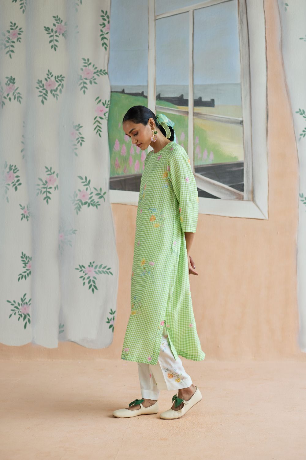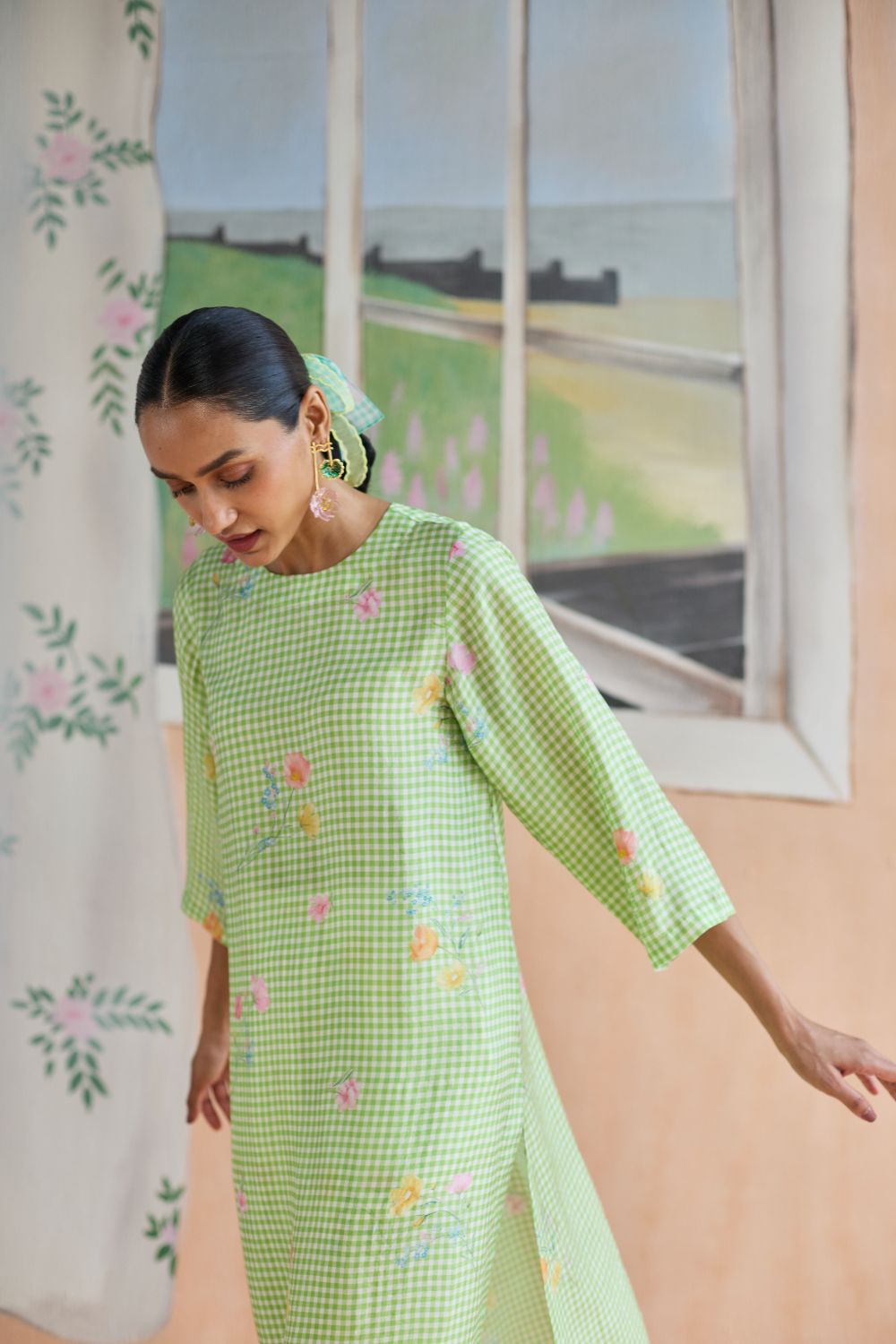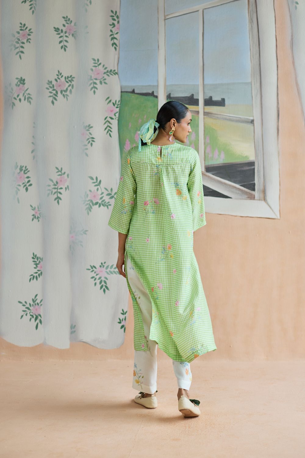 Green Checks and mallow flower long kurta set in handwoven mulberry silk alludes to a romance of checks with mallow flowers from Kashmir Valley. A reimagined classic checks with a poetic twist. Gathered blooms appear almost alive in contrast to the grid of checks. A relaxed fit, it offers ease and comfort while maintaining elegance. The kurta drapes fluidly, complemented by coordinating trousers that complete the look with grace. The model is 5 feet 7 inches tall and wearing size small. Dress Length is 42 inches