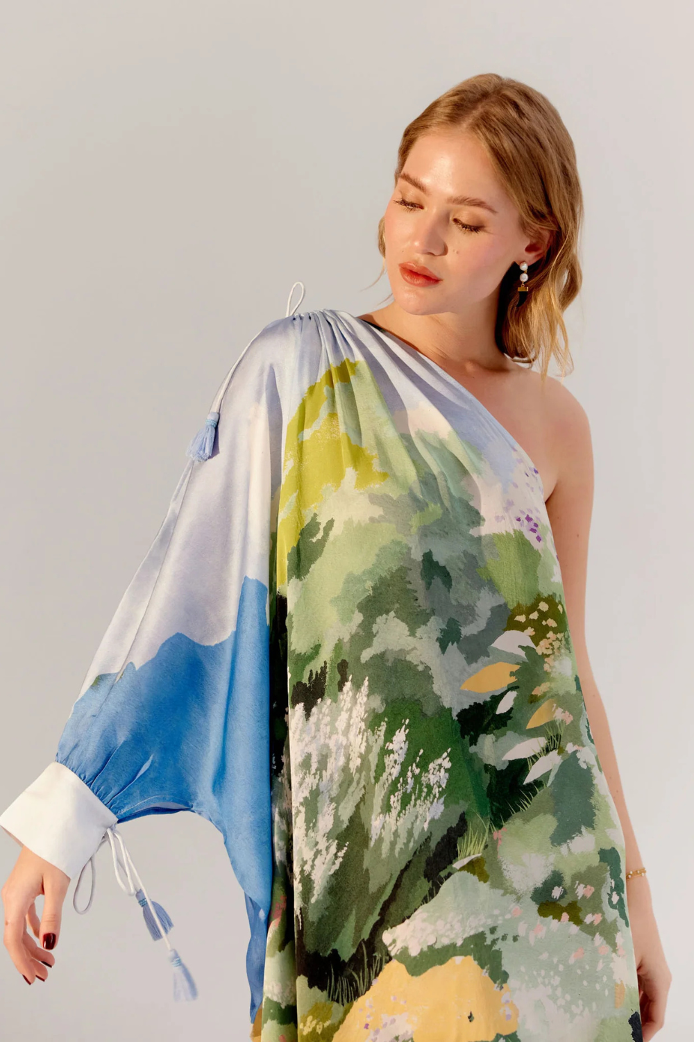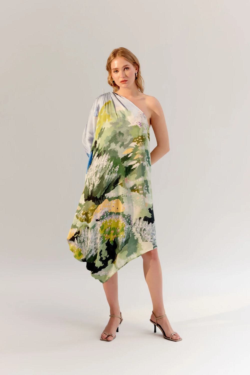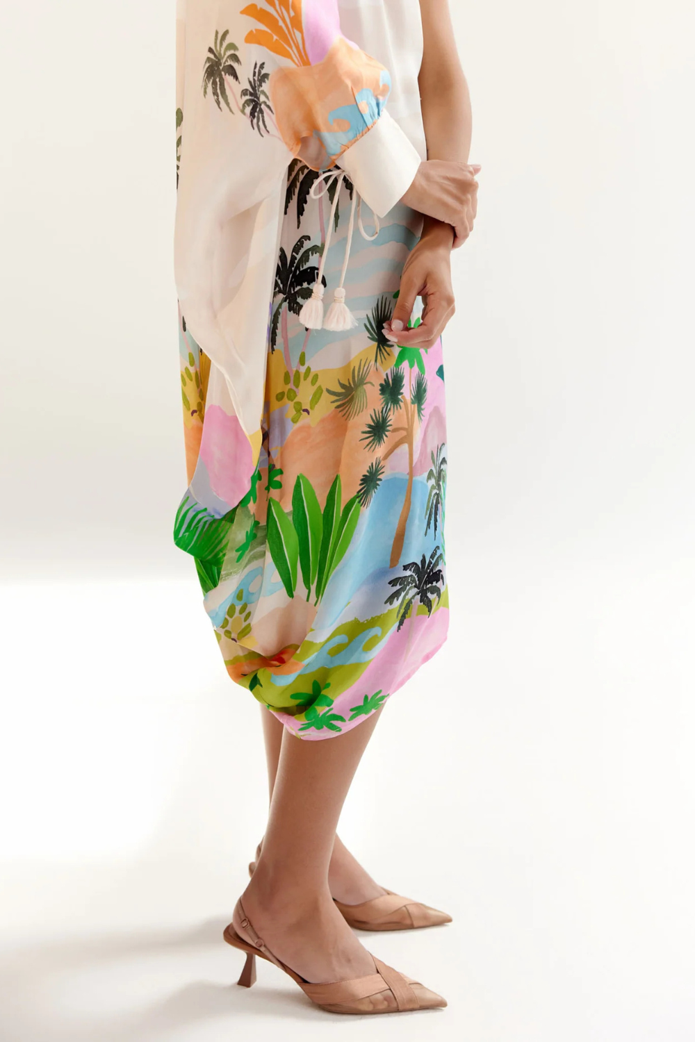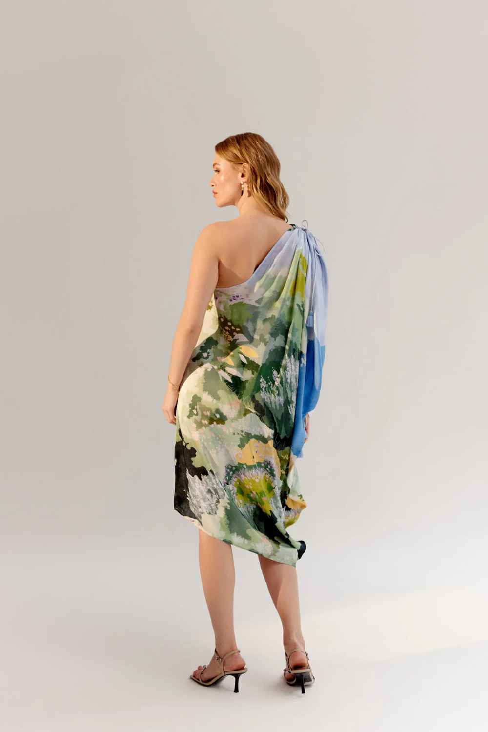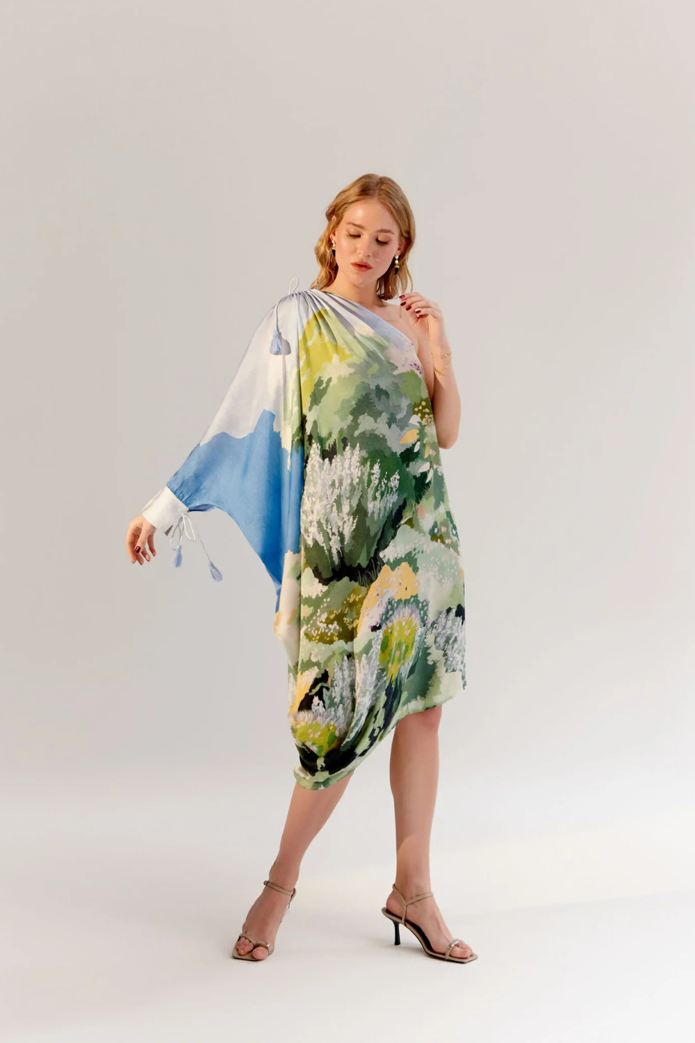 The Alaya Midi is a stunning one-shoulder asymmetrical dress crafted from luxurious viscose satin georgette, offering a free-flowing silhouette that exudes effortless elegance. Available in two beautiful placement prints—By the Sea and Forest—this dress evokes the peacefulness of nature and the serenity of coastal escapes. Delicate tassels with beads adorn the shoulder, adding a playful yet sophisticated touch.